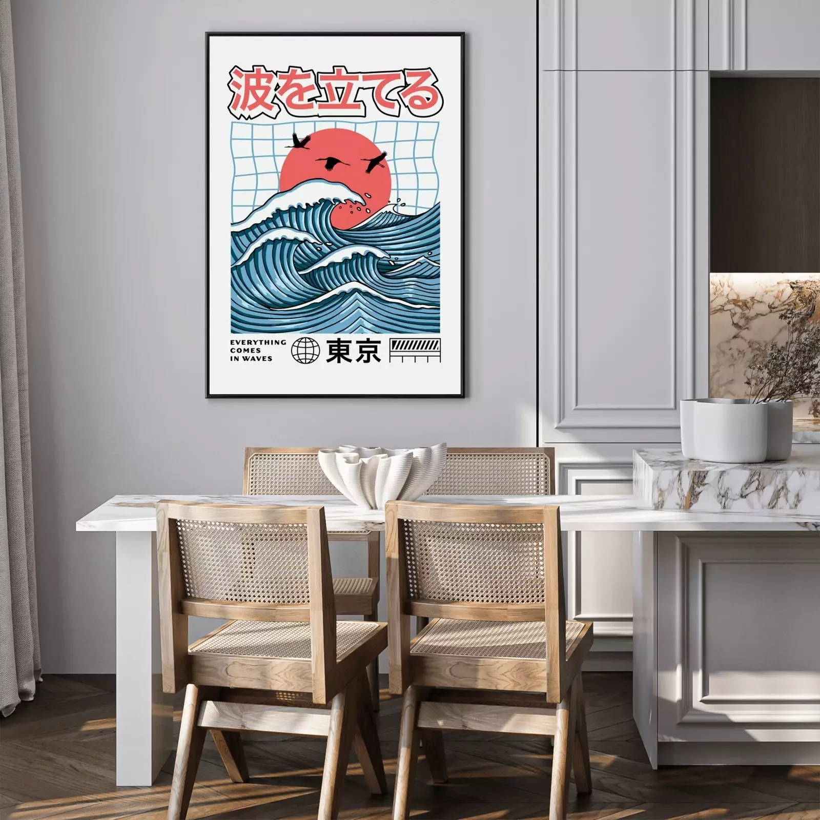 Poster  Big waves with the red sun. Vector graphics for t-shirt prints, posters and other uses. Japanese text translation: Make Waves(above), Tokyo(below).