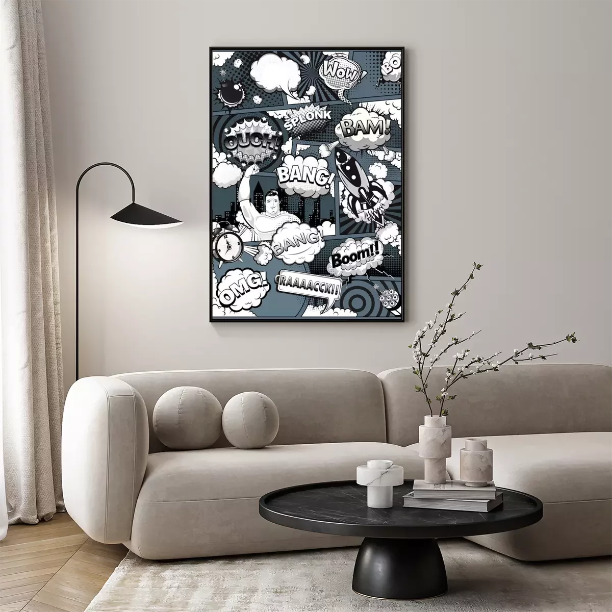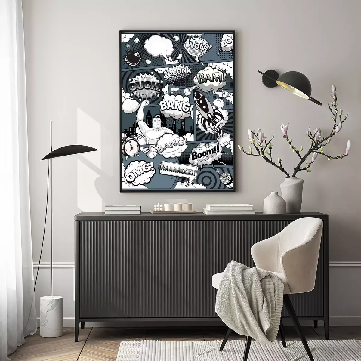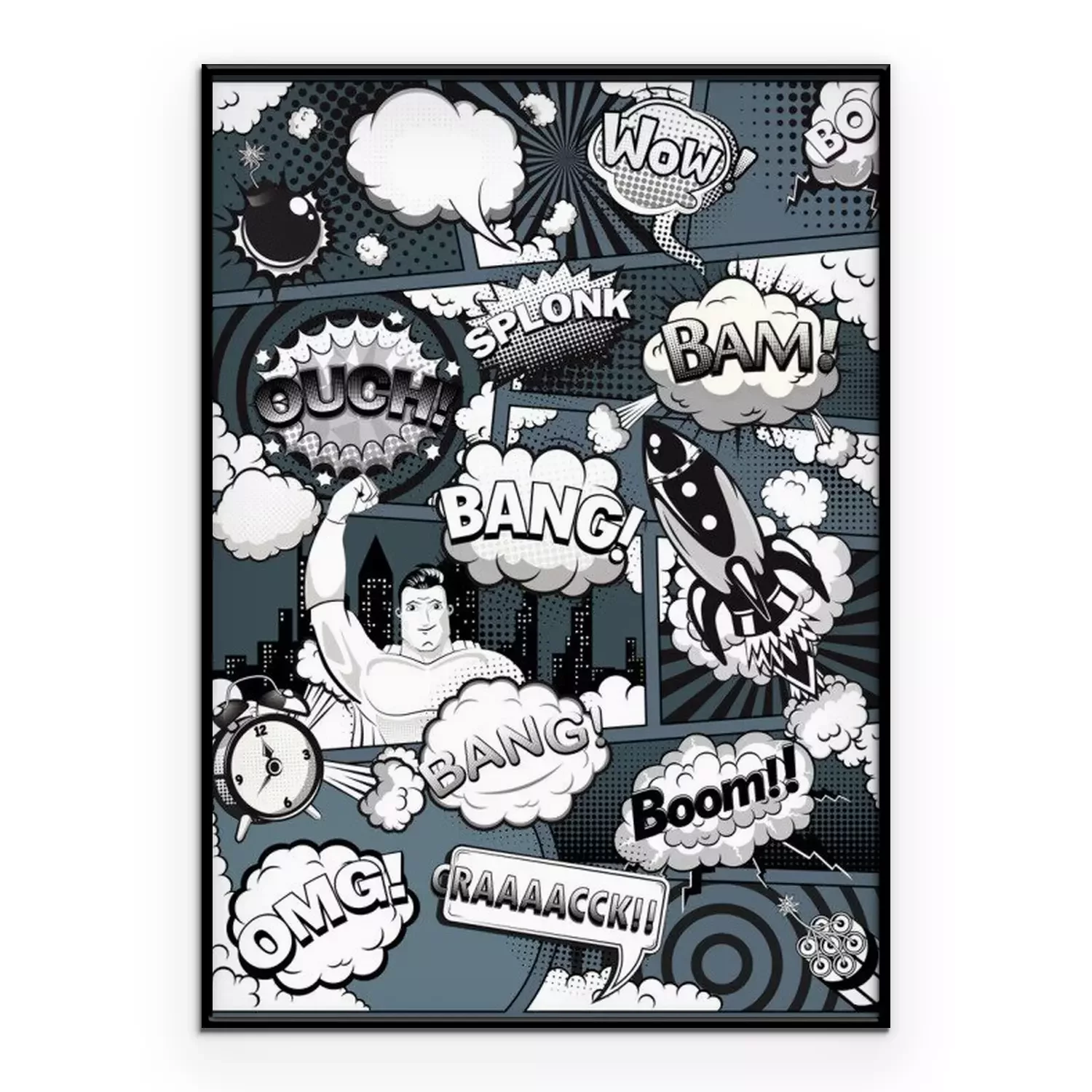 Poster  Black and white comic book page divided by lines with speech bubbles, rocket, superhero and sounds effect. Retro background mock-up. Comics template on dark background. Vector illustration