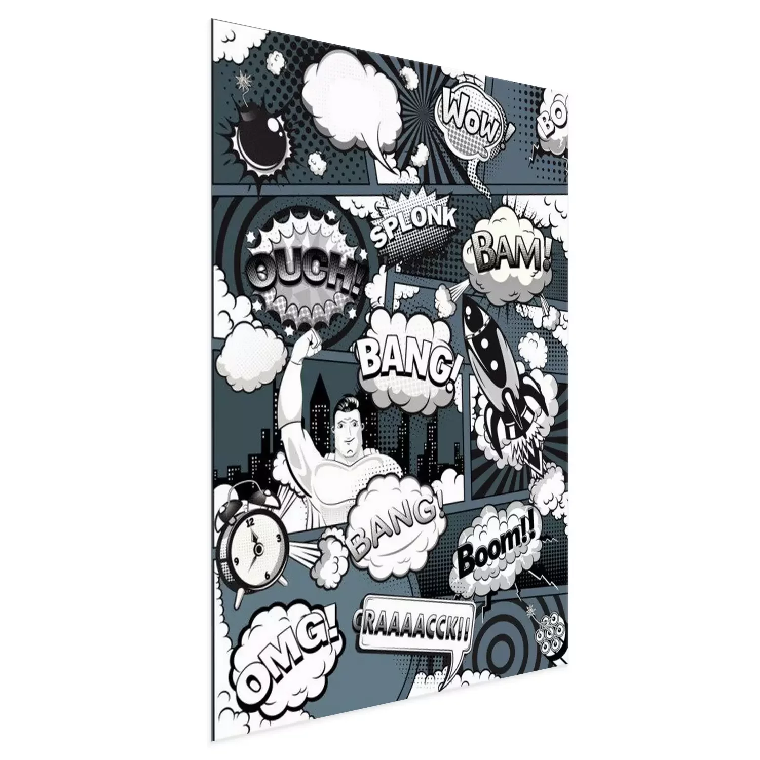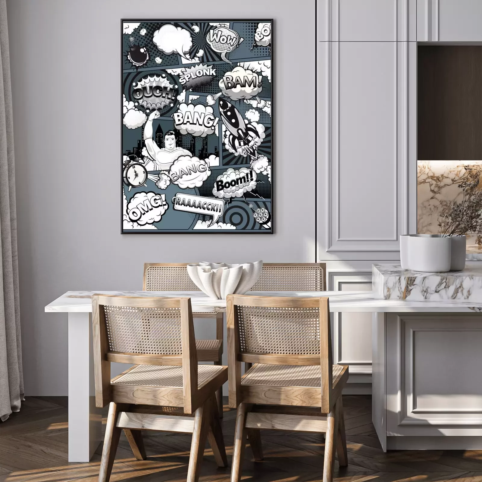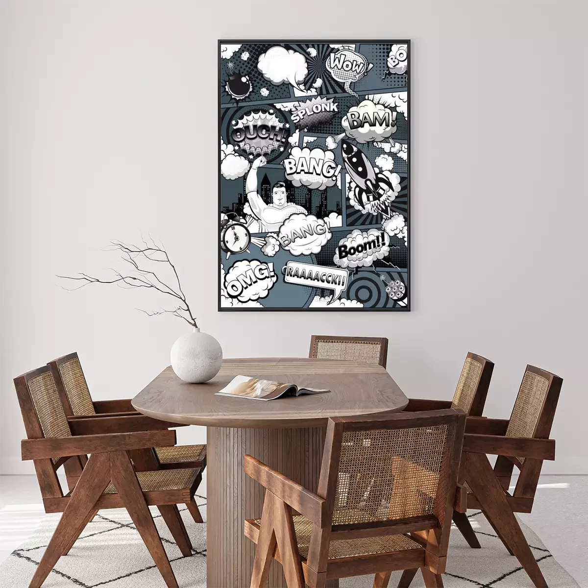Poster  Black and white comic book page divided by lines with speech bubbles, rocket, superhero and sounds effect. Retro background mock-up. Comics template on dark background. Vector illustration