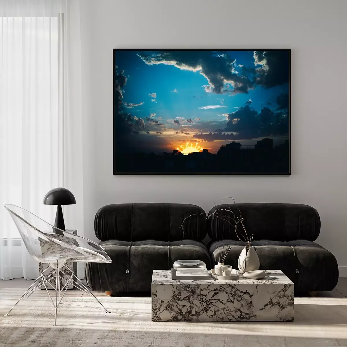 Poster : Blue sky with covid-19 sunset or sunrise on the city, world epidemic dangerous news for corona virus alerts and quarantine