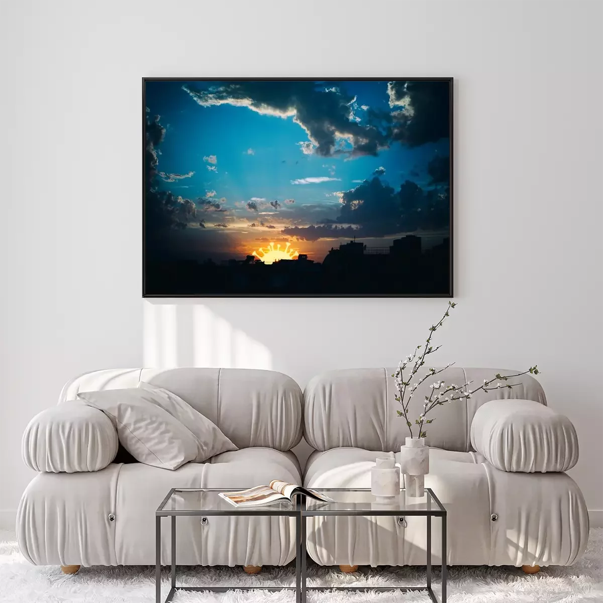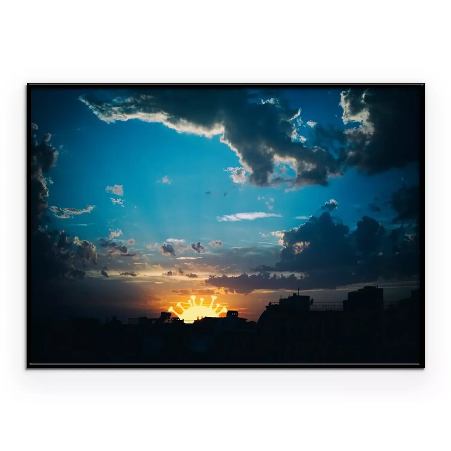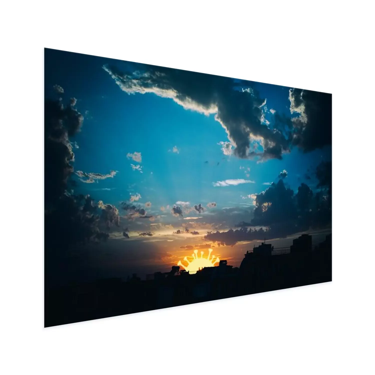 Poster  Blue sky with covid-19 sunset or sunrise on the city, world epidemic dangerous news for corona virus alerts and quarantine
