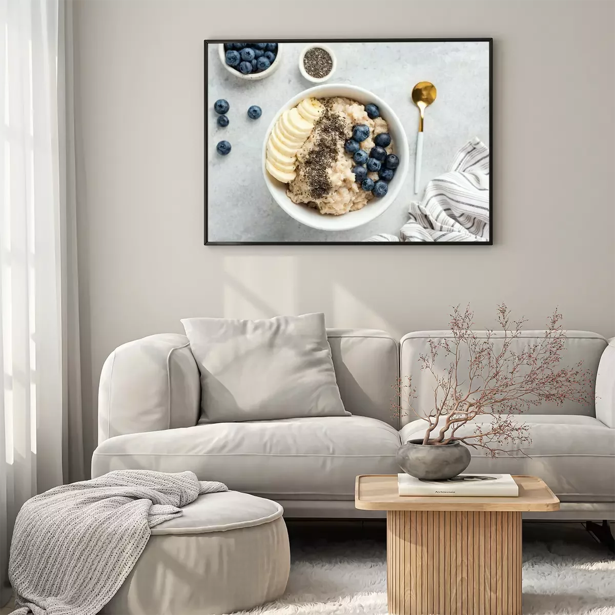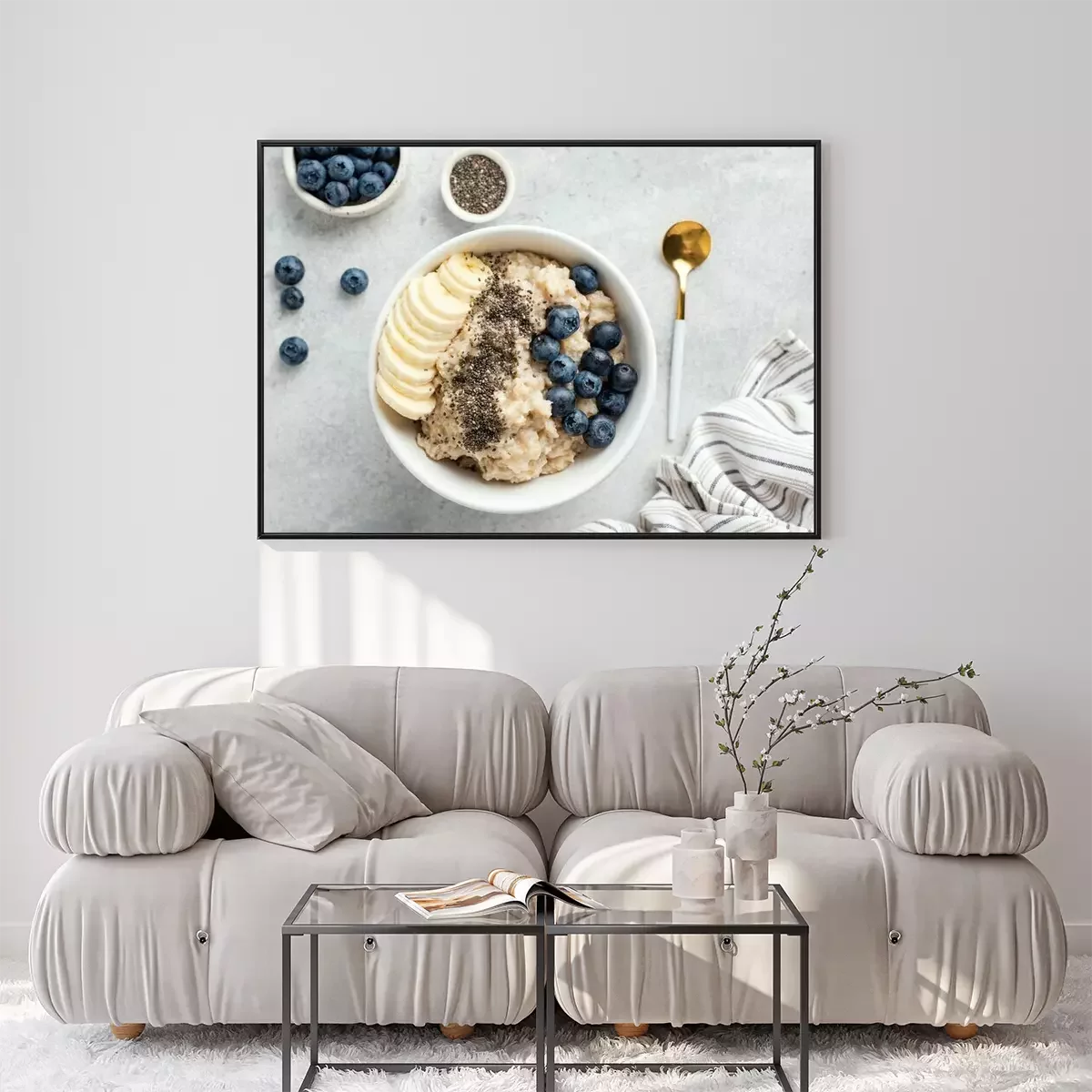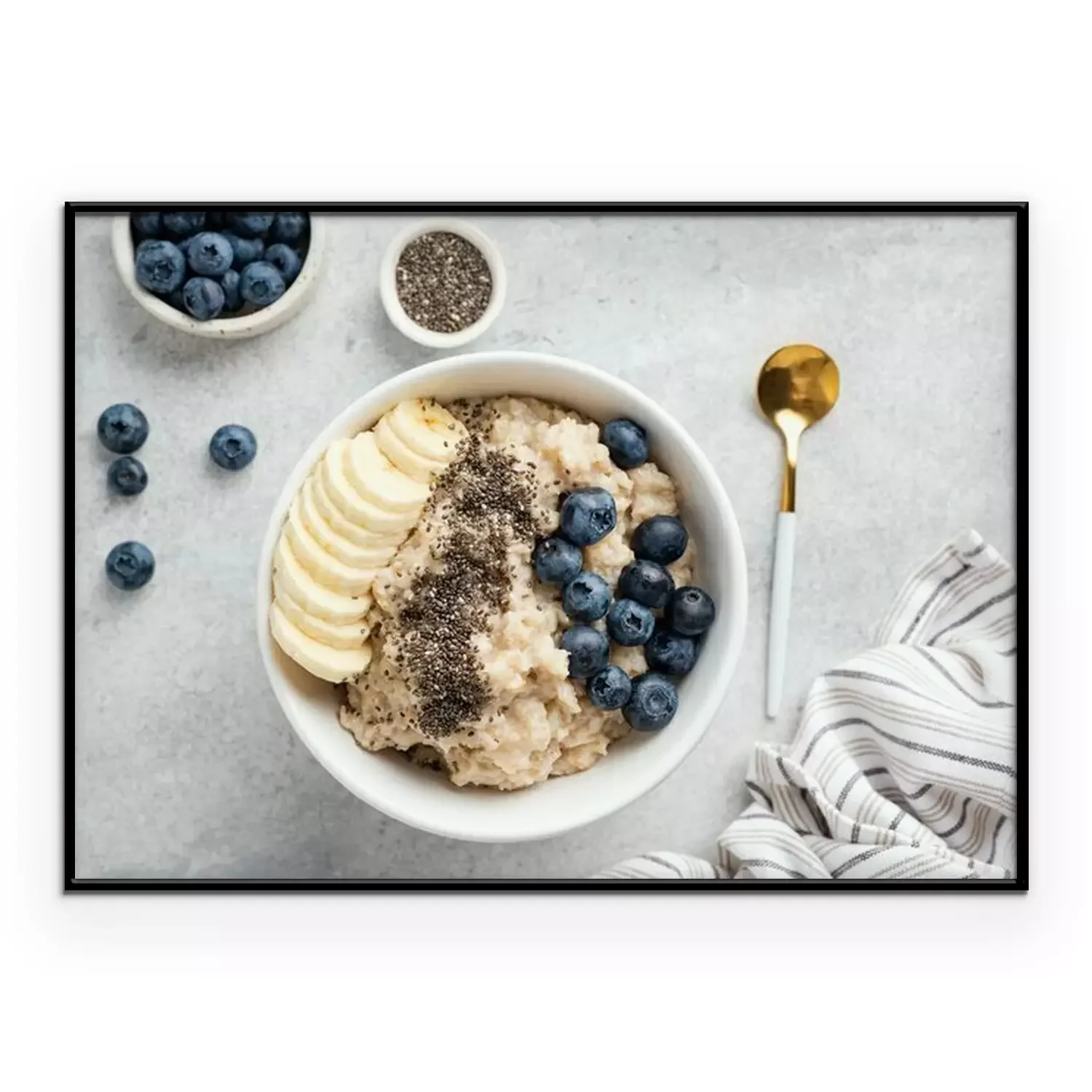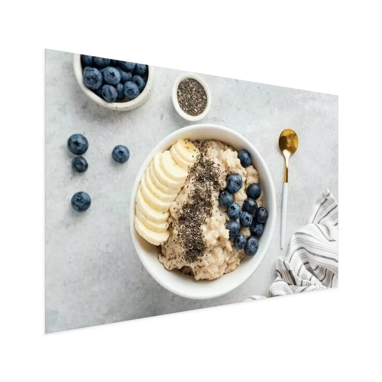 Poster  Breakfast oatmeal porridge with banana, blueberries, chia seeds on grey concrete background. Table top view of healthy food for weight loss, clean eating, vegan and vegetarian diet