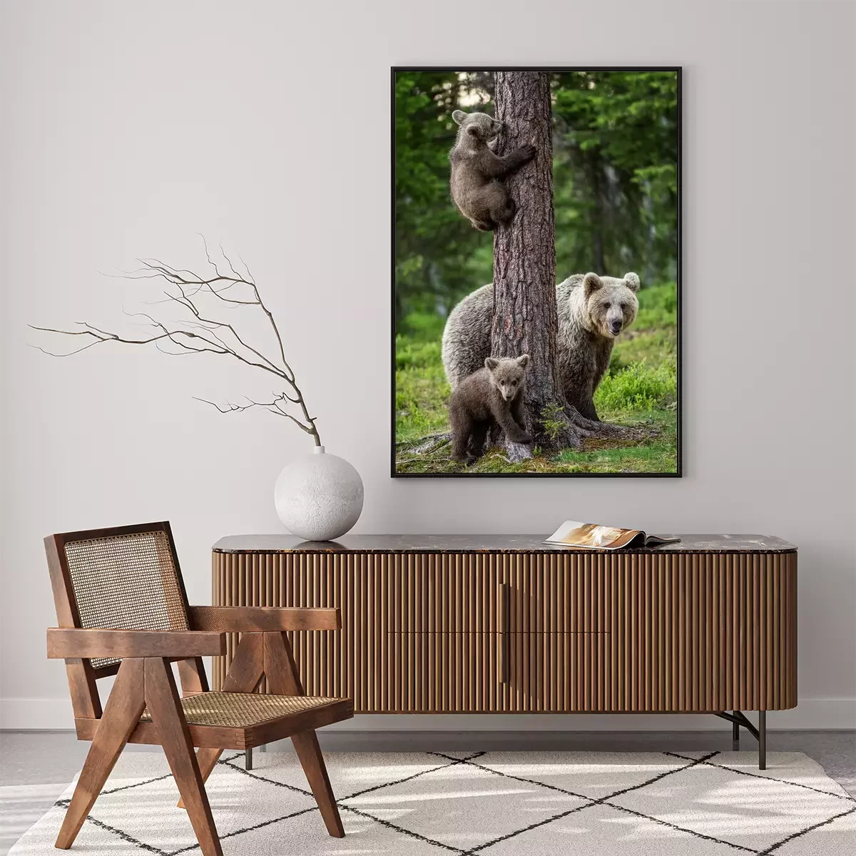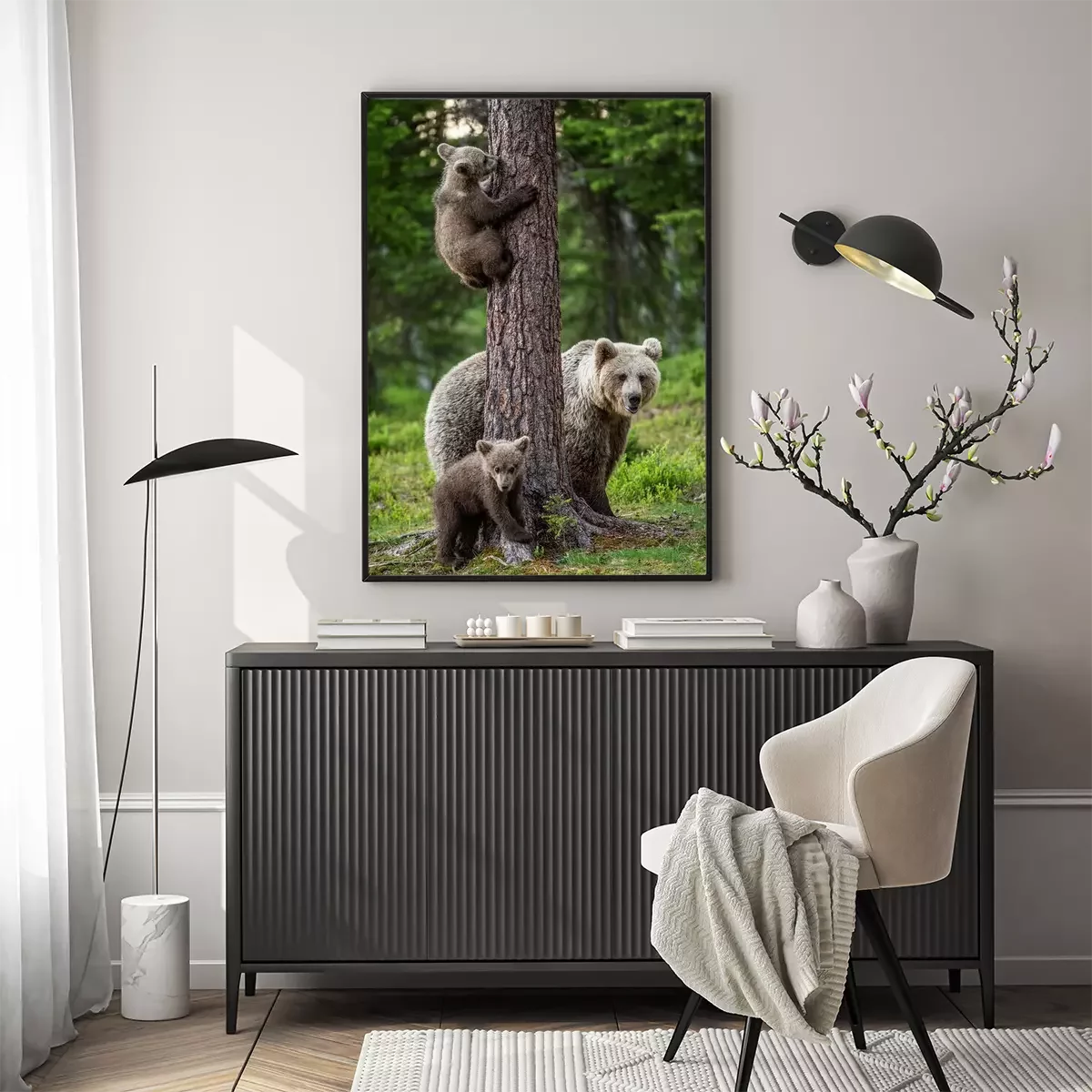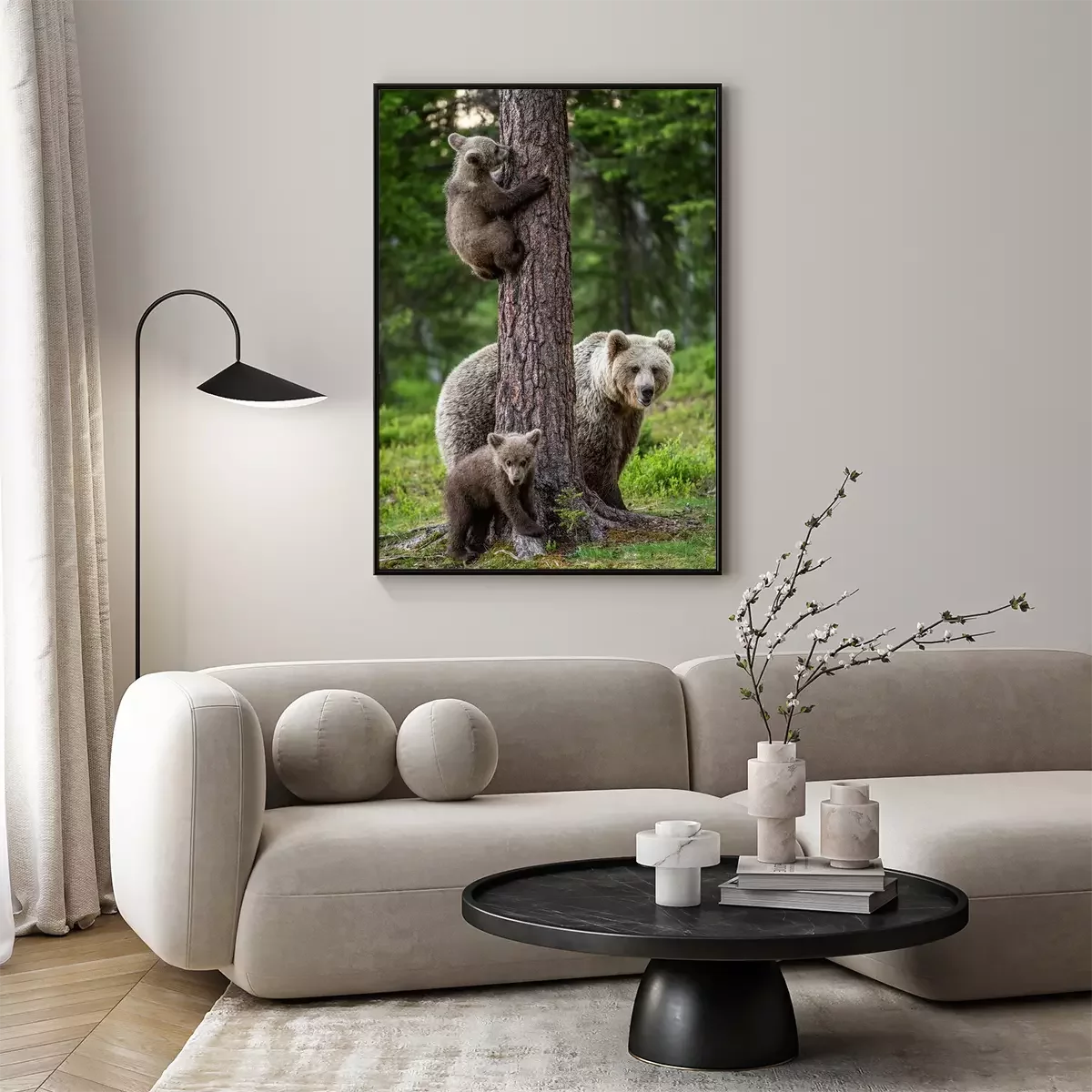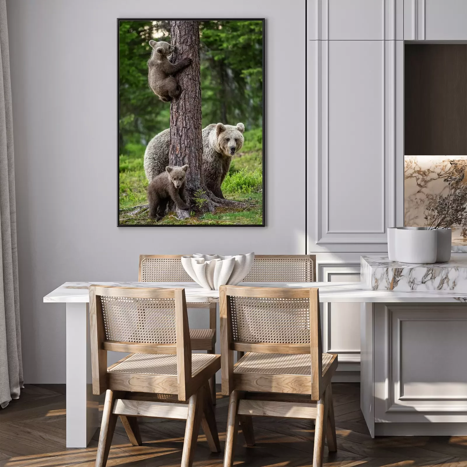 Poster  Brown bear cubs climbs a tree. She-bear and cubs in the summer forest. Brown bear. Scientific name: Ursus arctos. Summer season, natural habitat.