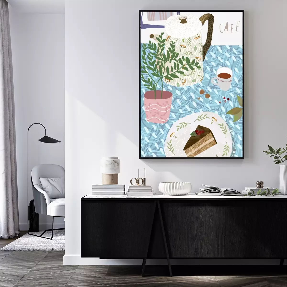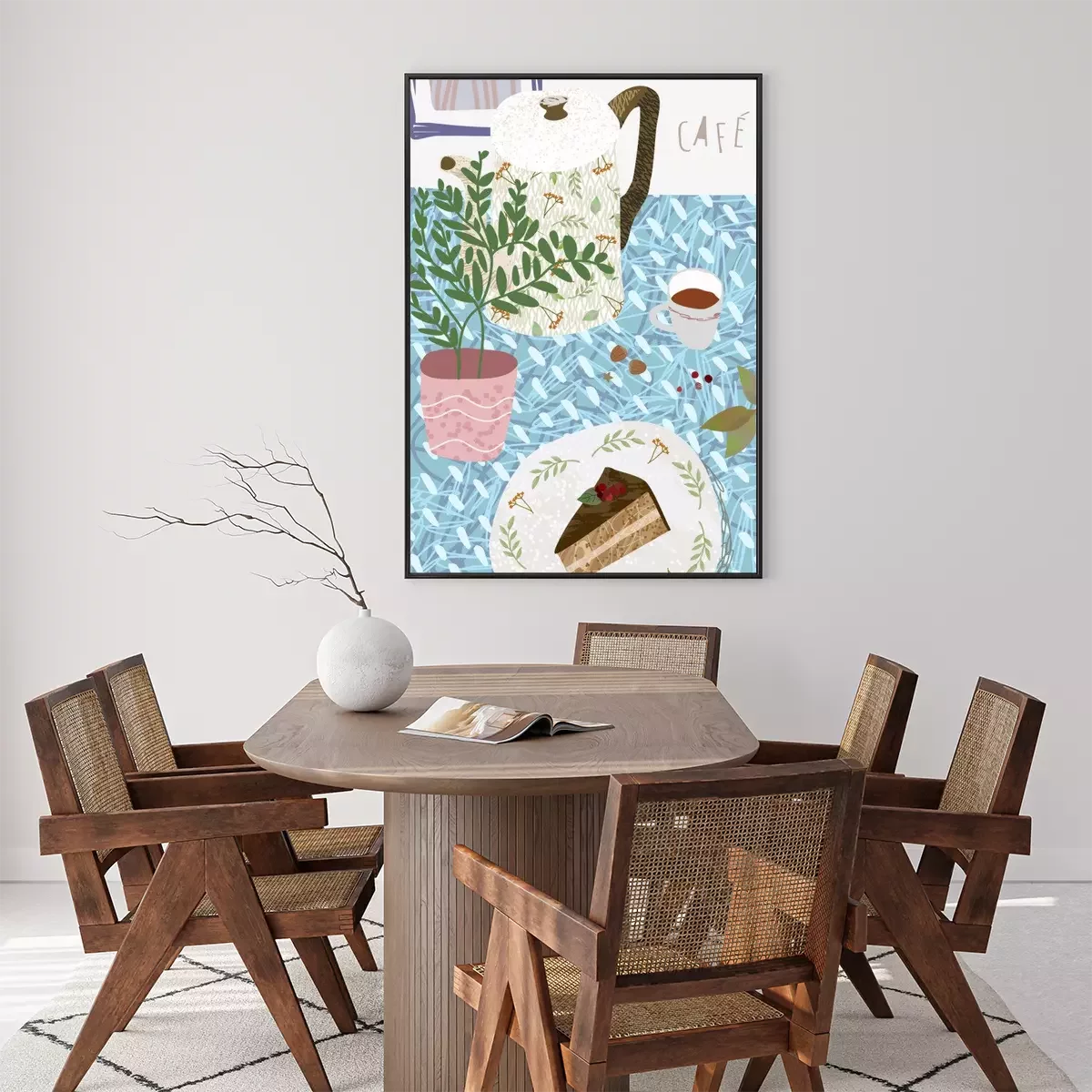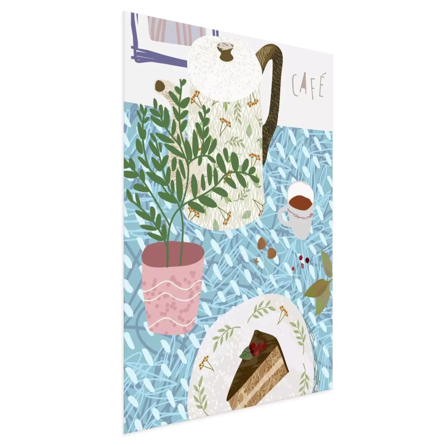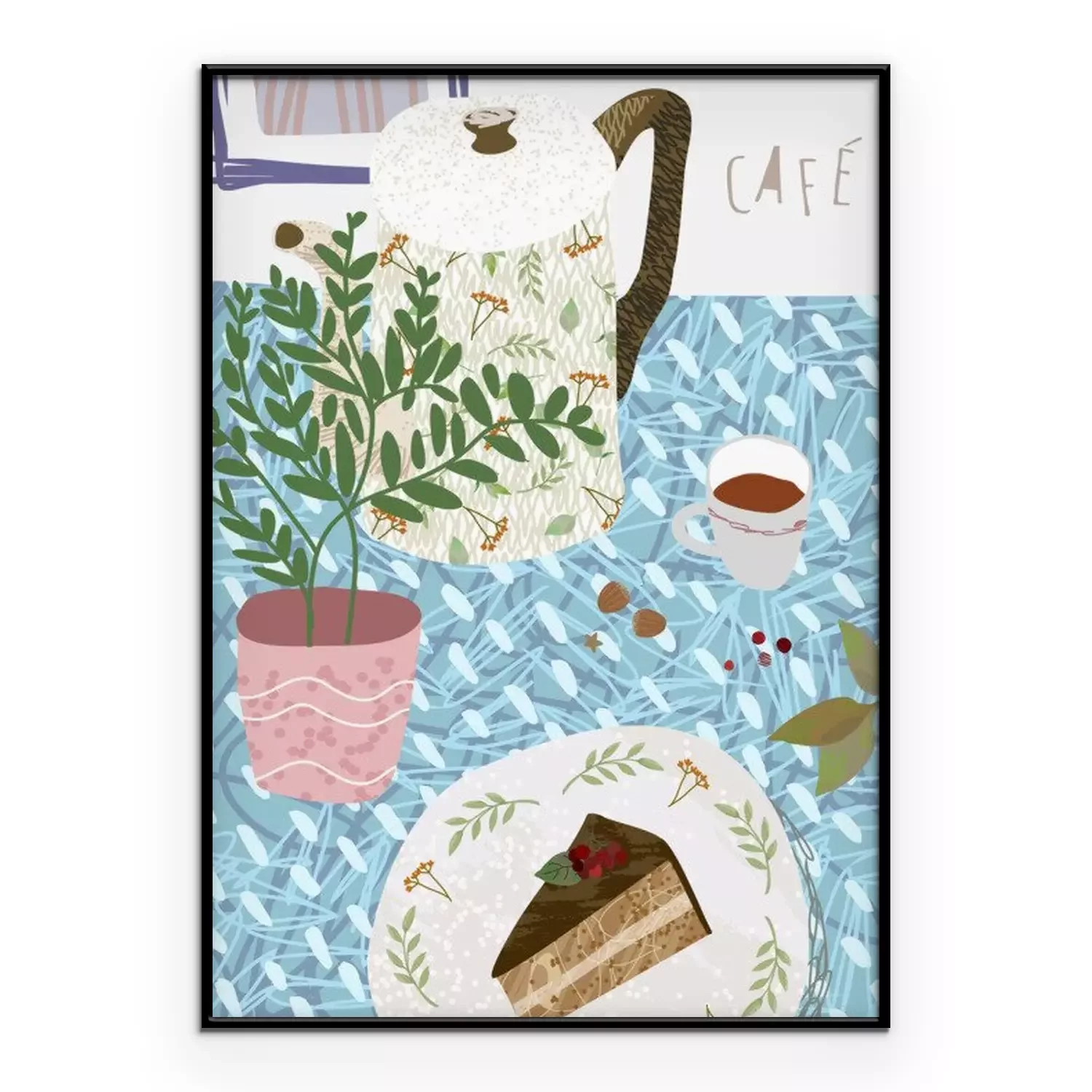 Poster  Cafe. Vector cute illustration of a still life on a table in the kitchen. Top view on teapot, coffee, plant and dessert. Drawings of objects of the Scandinavian style hugg