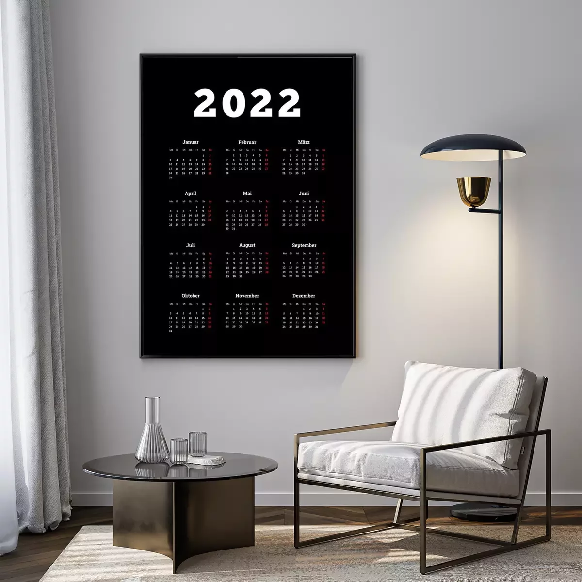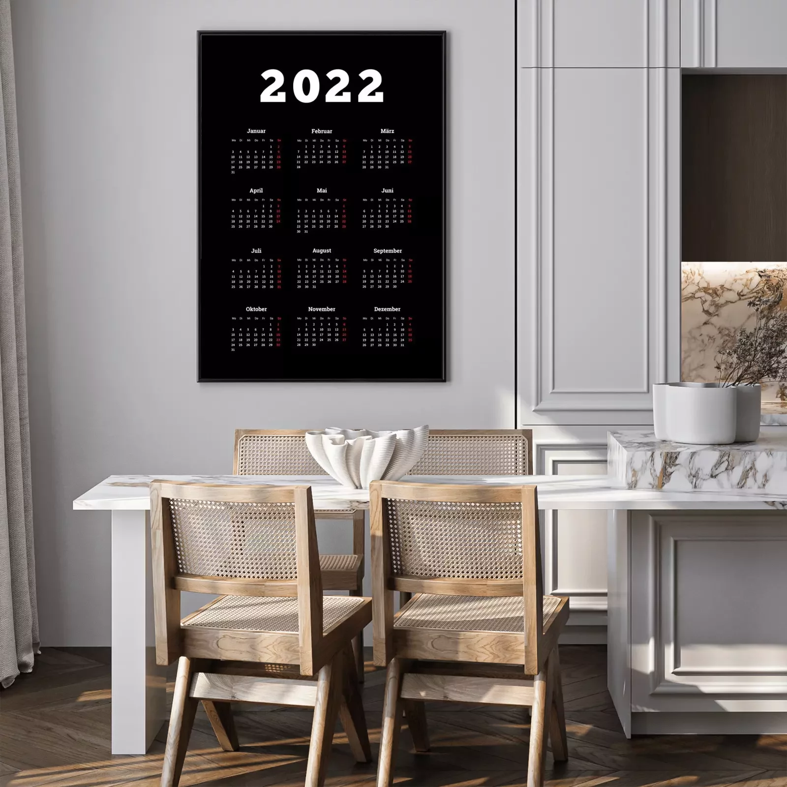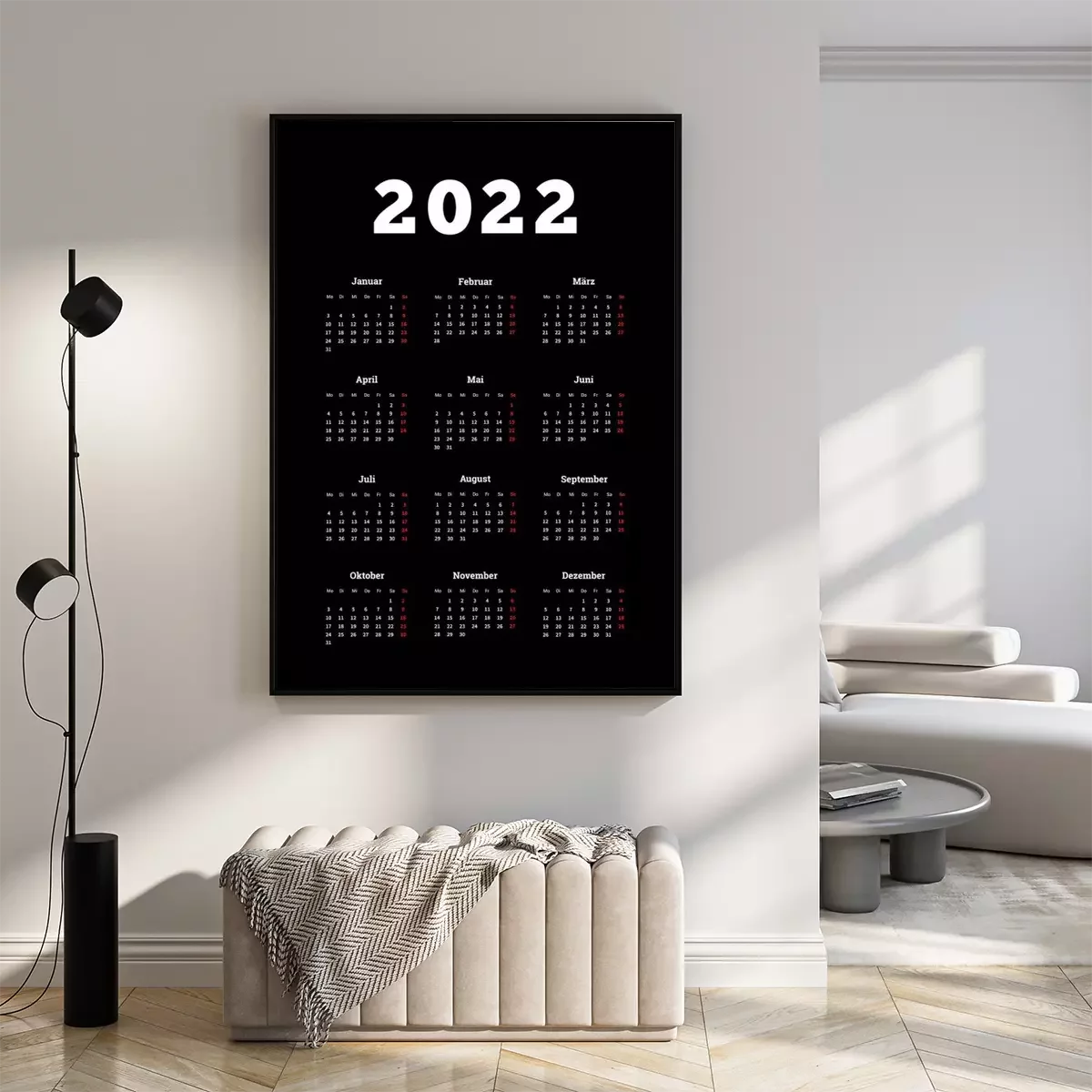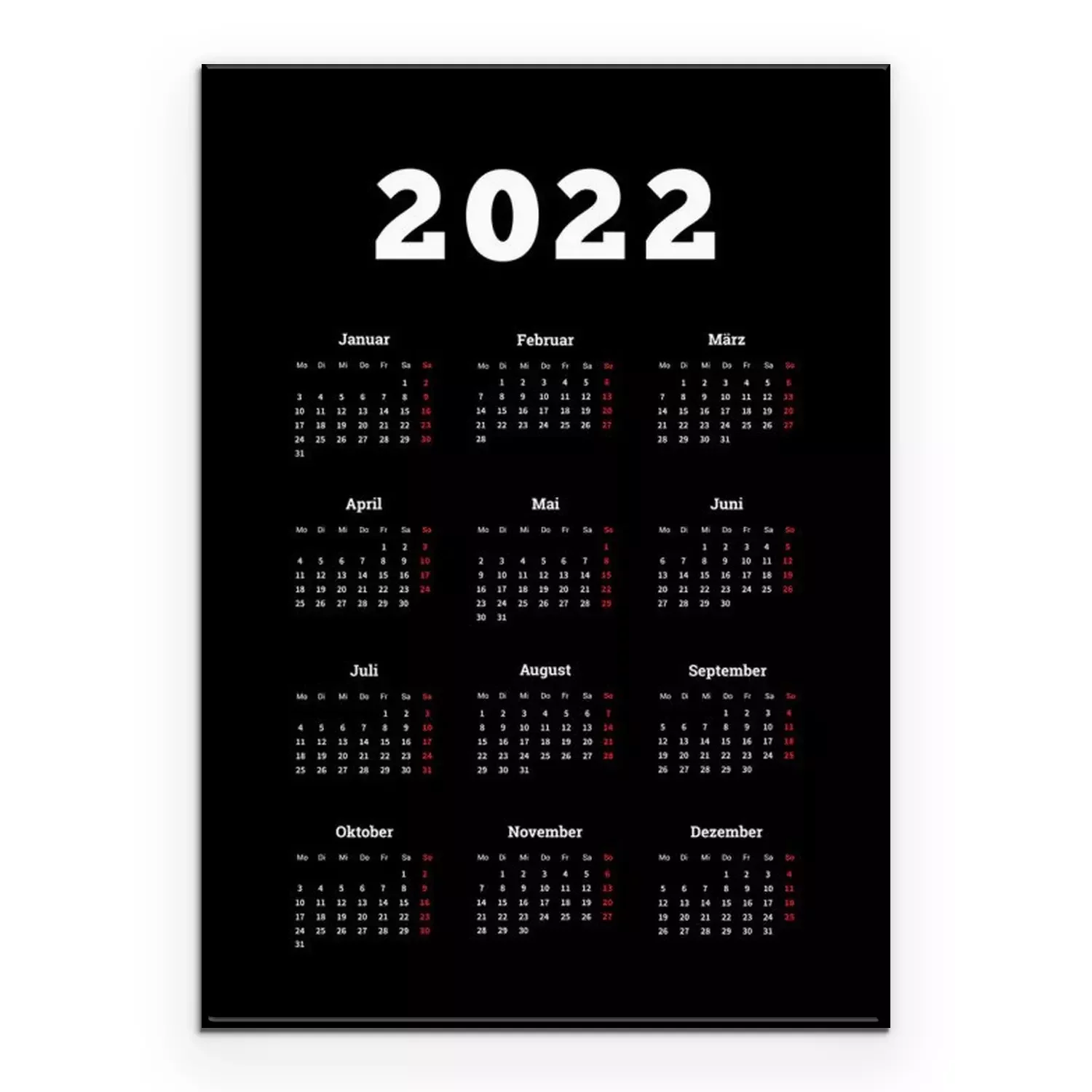 Poster  Calendrier simple de 2022 ans en allemand, feuille verticale de format A4 sur fond sombre
