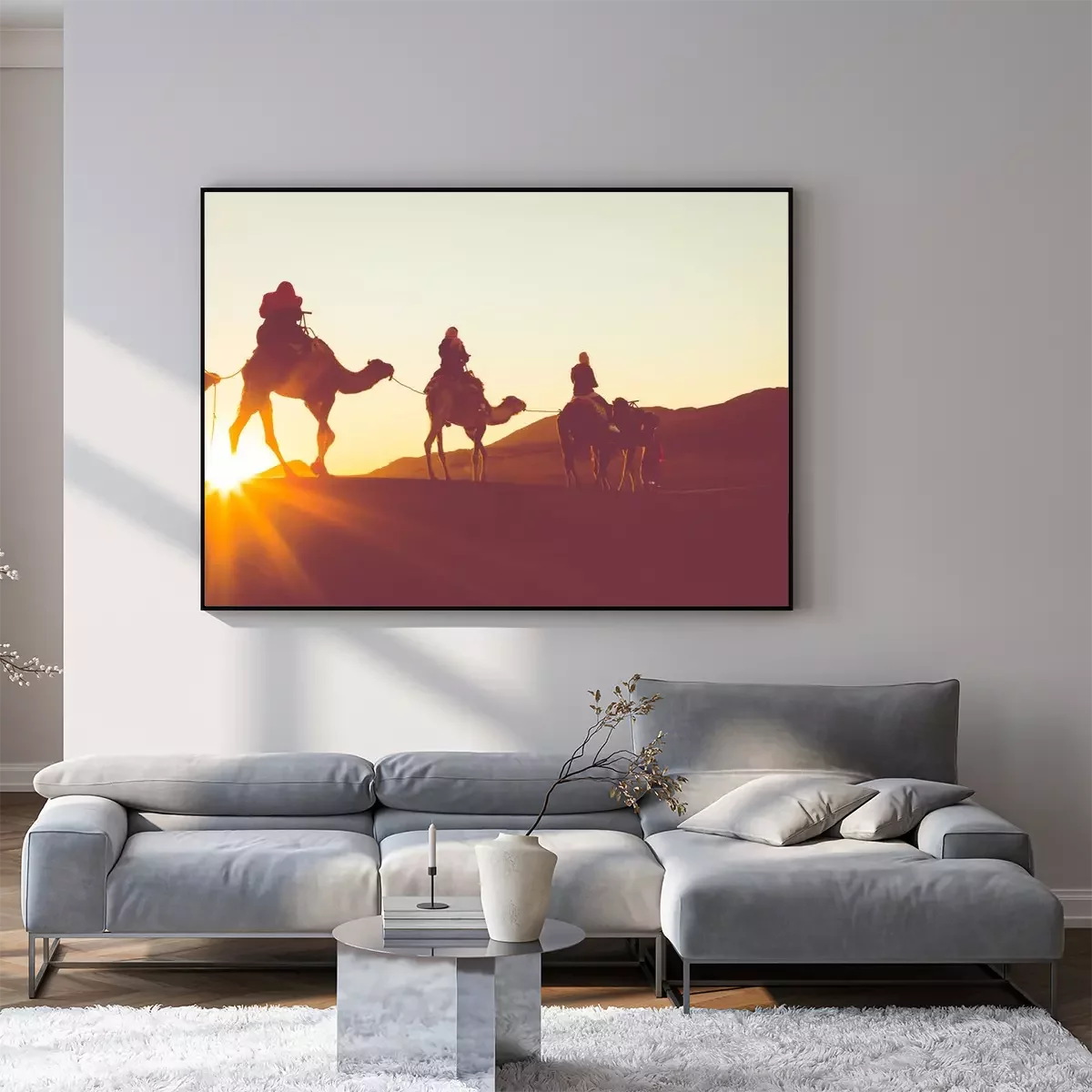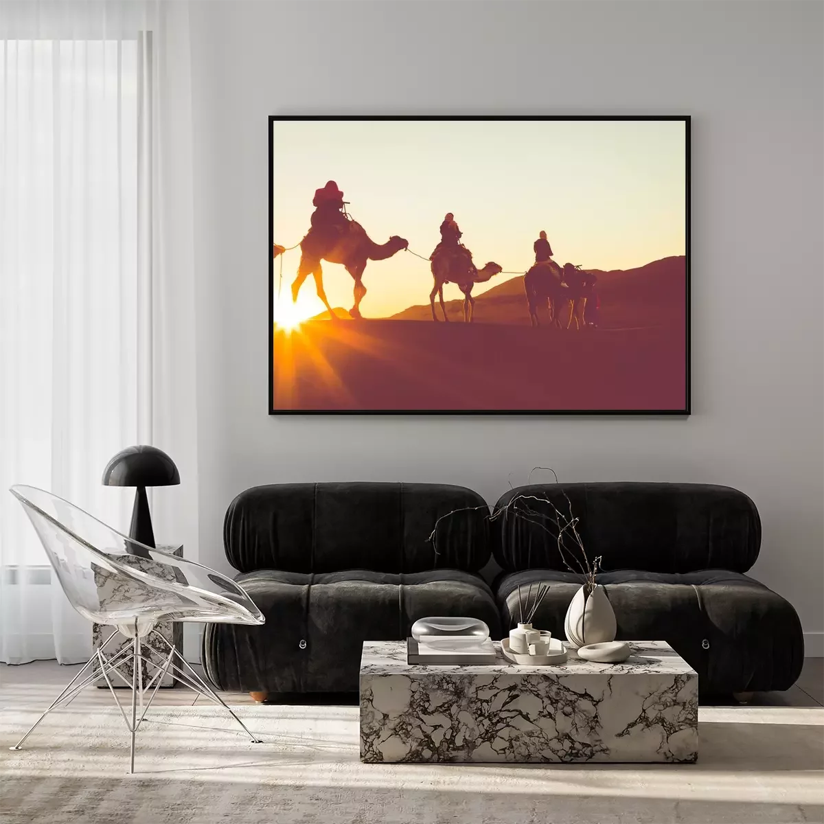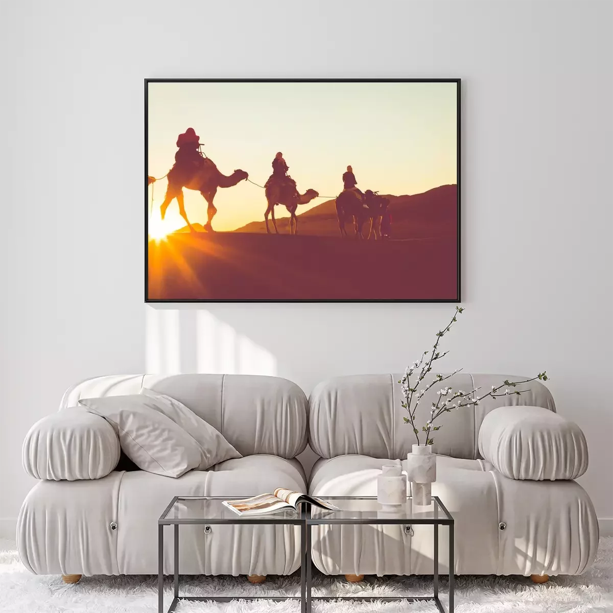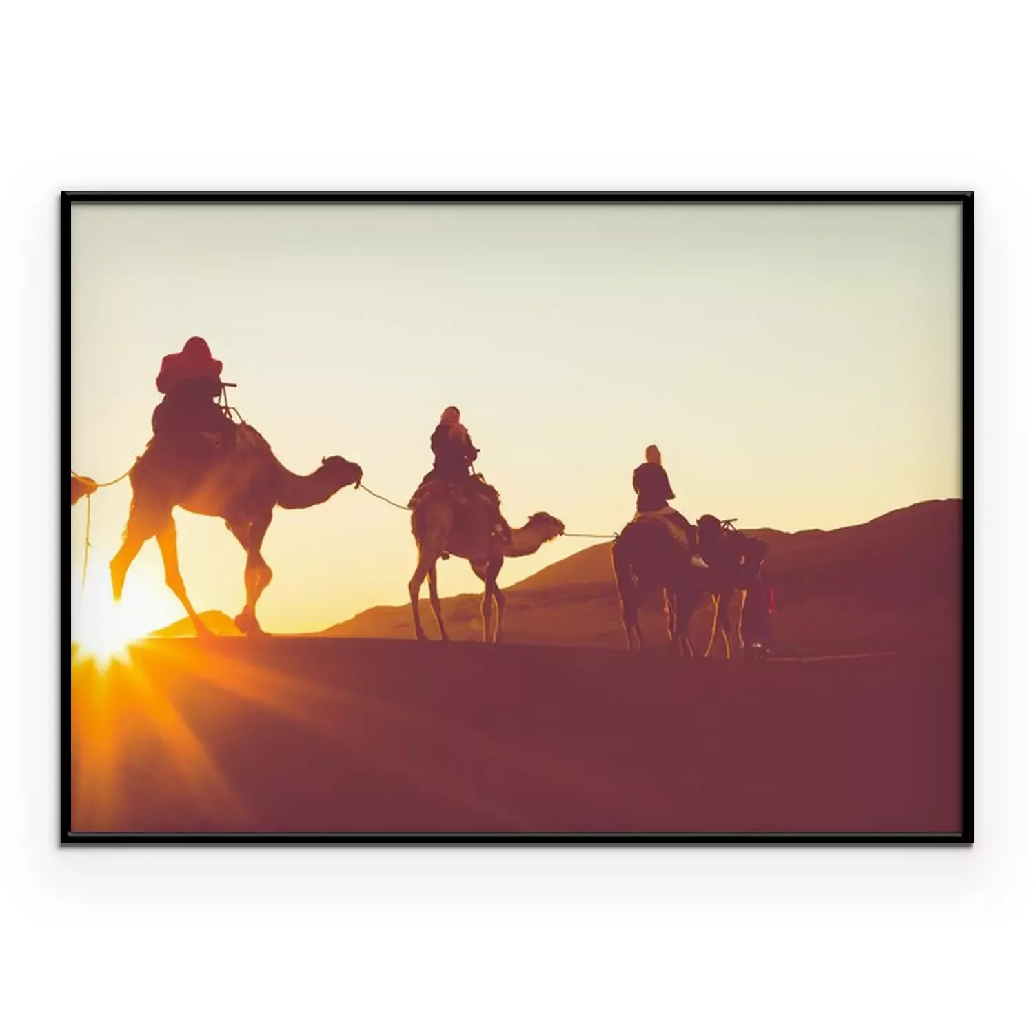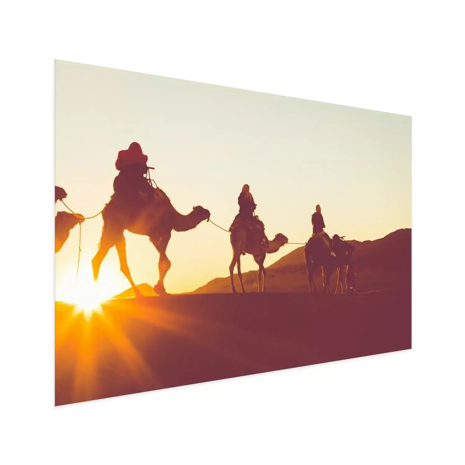 Poster  Camel caravane avec des gens qui traversent les dunes de sable dans le désert du Sahara. Maroc, Afrique.