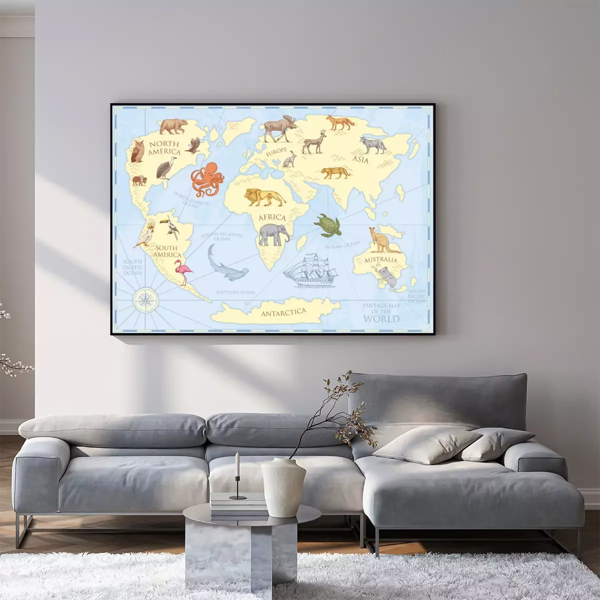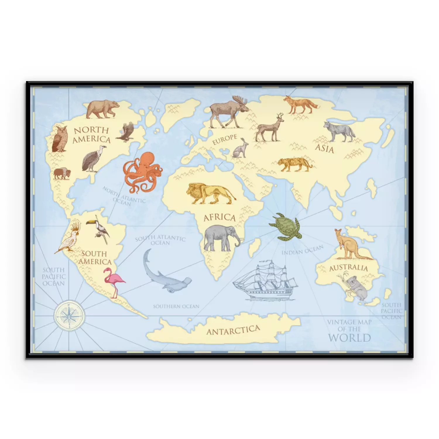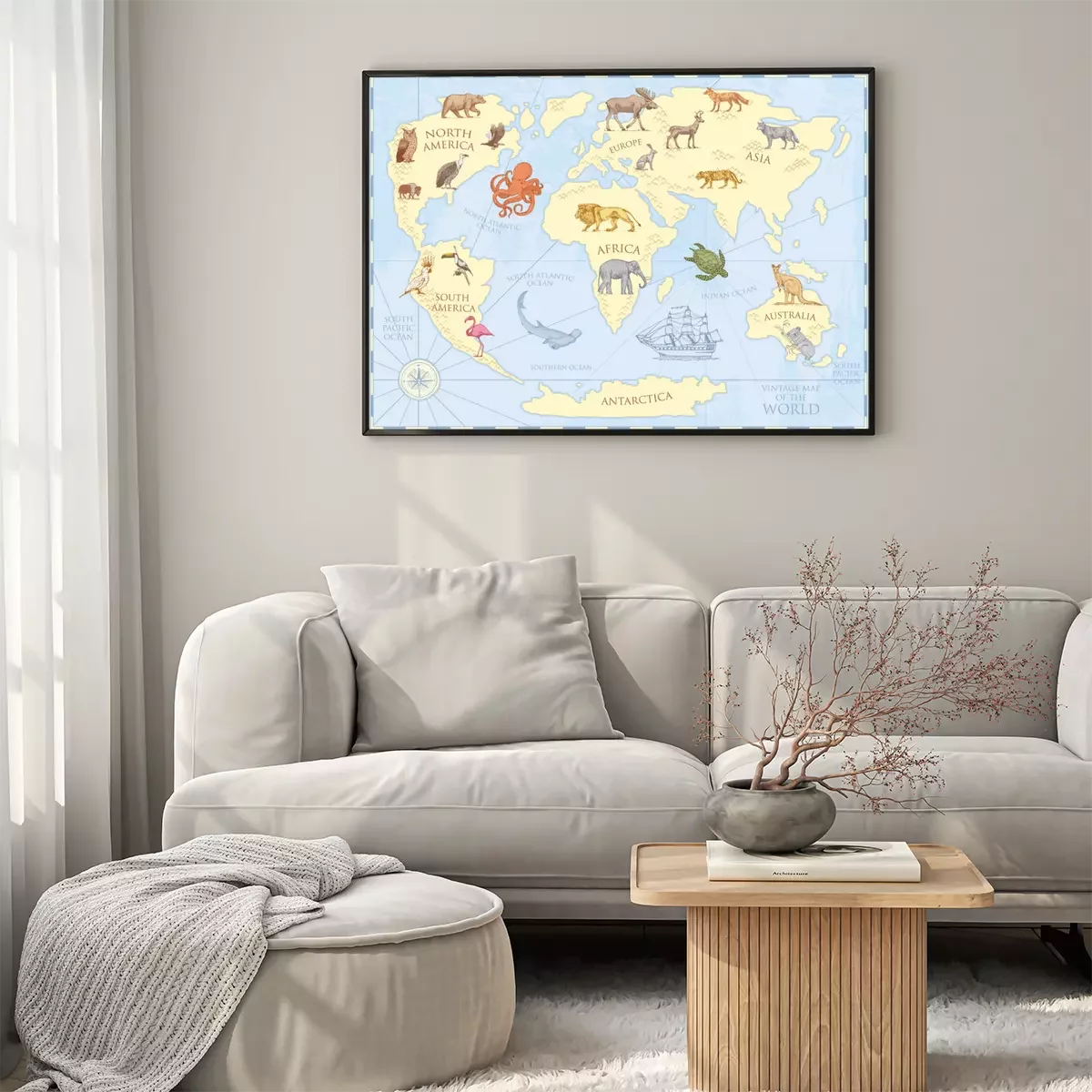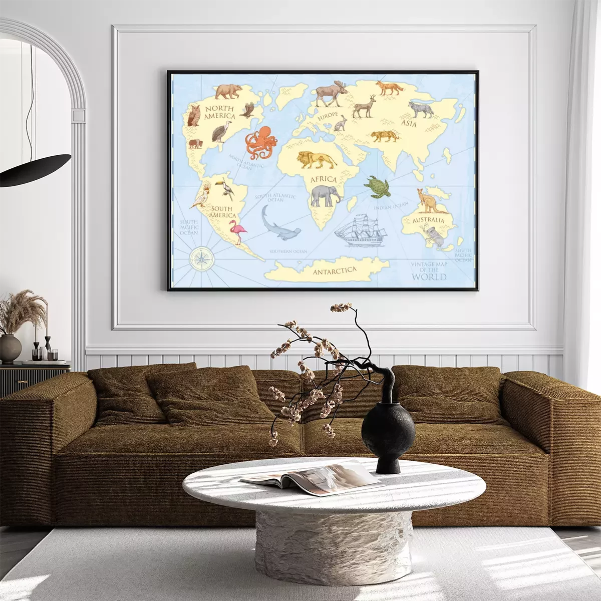 Poster  Carte du monde vintage avec des animaux sauvages et des montagnes. Créatures marines dans l'océan. Vieux parchemin rétro. concept de la faune sur la terre. fond ou une affiche pour les enfants. dessin