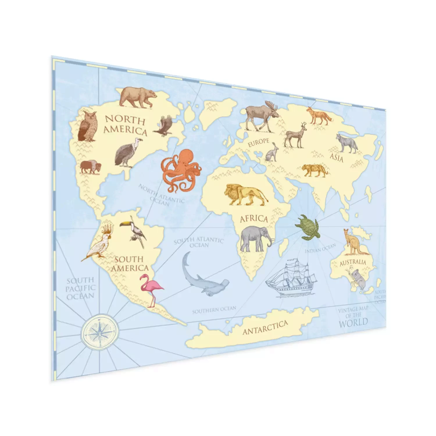 Poster : Carte du monde vintage avec des animaux sauvages et des montagnes. Créatures marines dans l'océan. Vieux parchemin rétro. concept de la faune sur la terre. fond ou une affiche pour les enfants. dessin