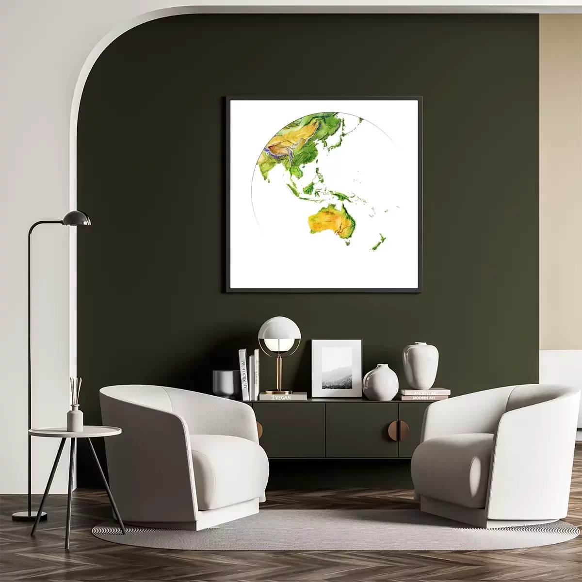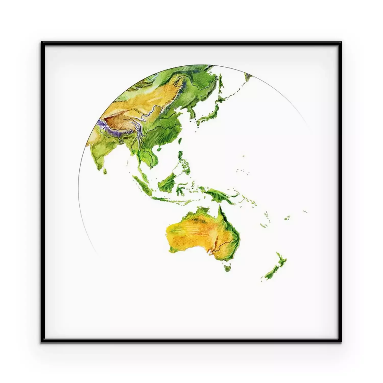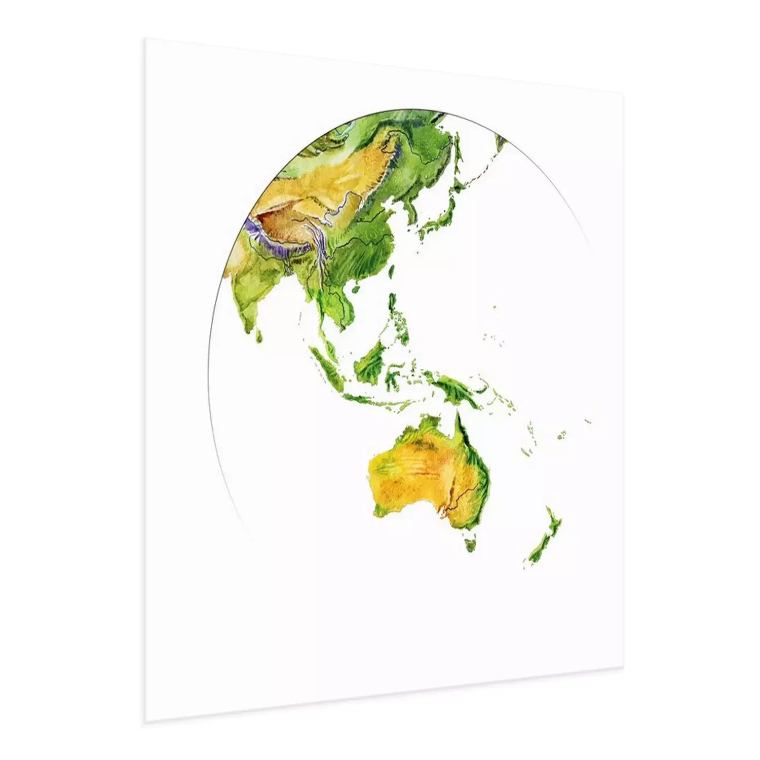 Poster  Carte géographique aquarelle du monde. Carte physique du monde. Fragment. Asie, Australie, Indonésie. Image réaliste Isolé sur fond blanc