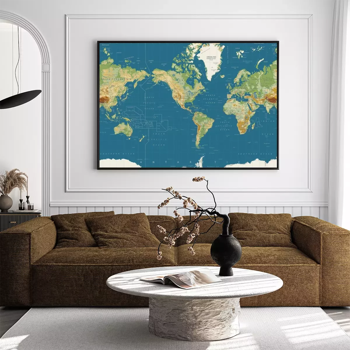 Poster  Carte physique au centre de la carte du monde. Vintage Colors. Pas de bathymétrie