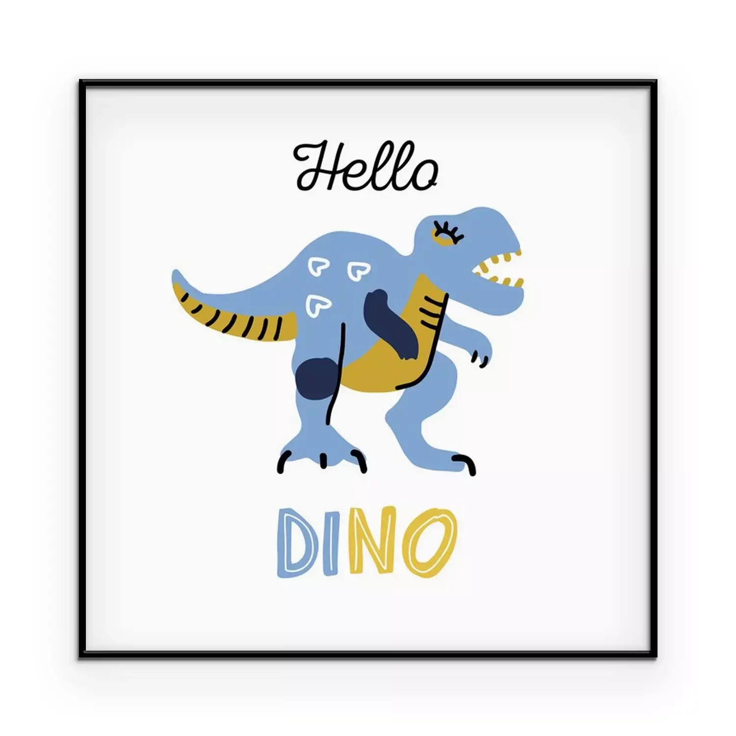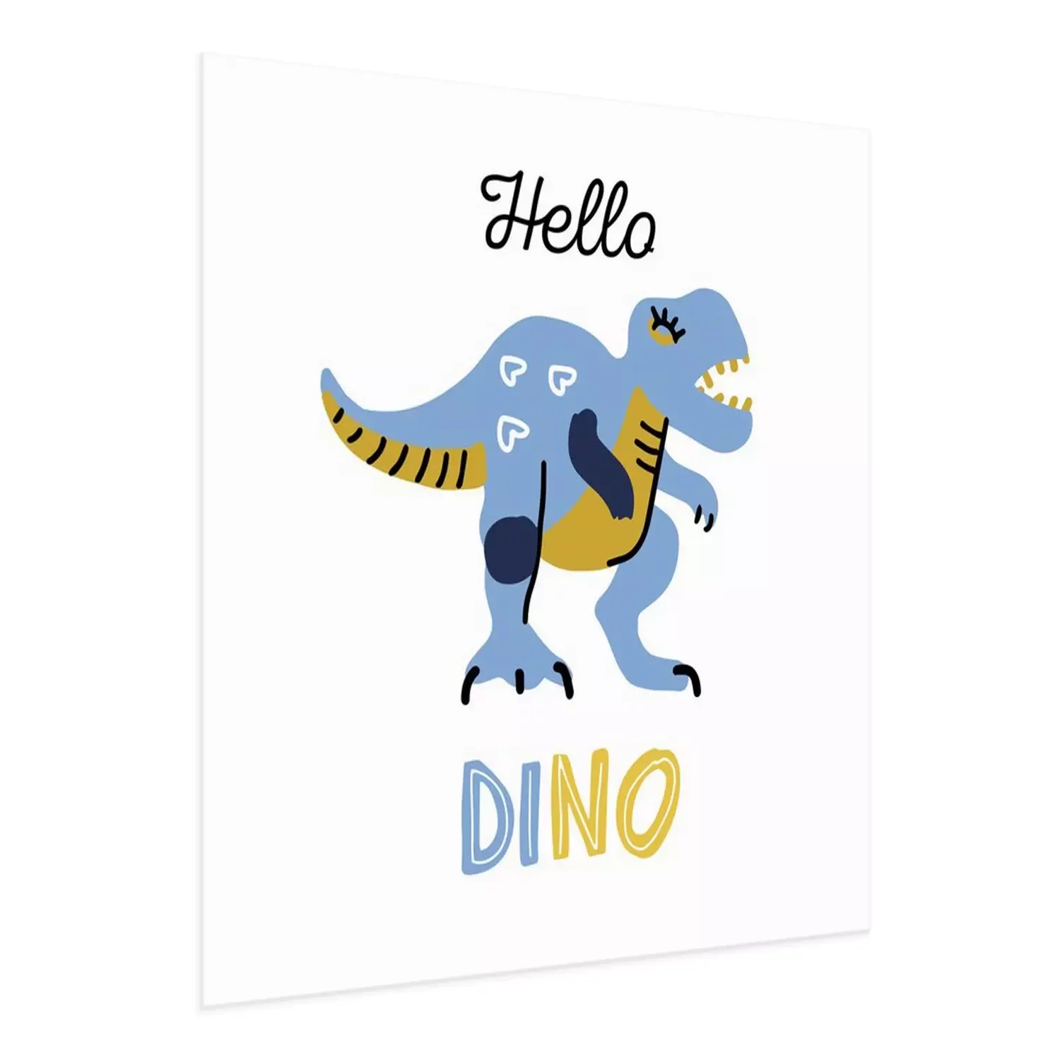 Poster  Cartoon little dinosaur. Cute dino color hand drawn character. T-rex flat clipart with lettering quote hello dino. Sketch jurassic reptile. Isolated cartoon print for kids game, textile, book