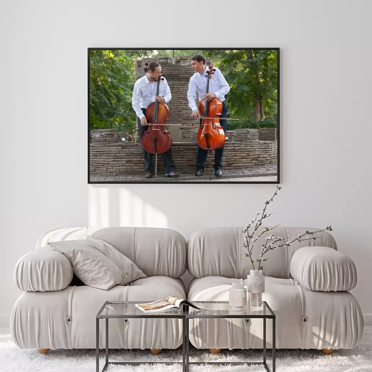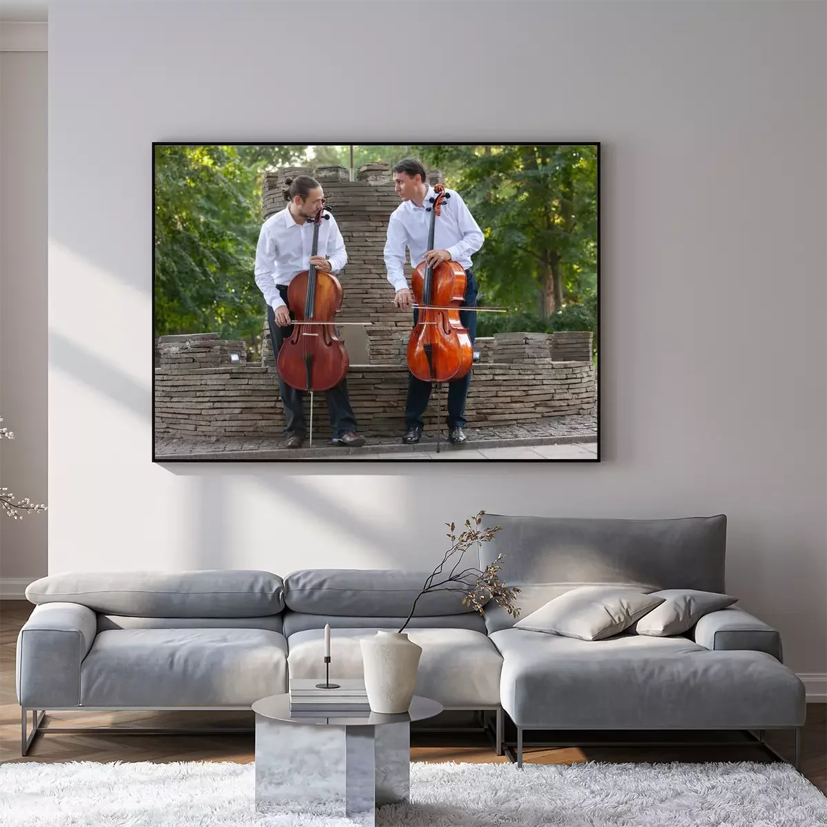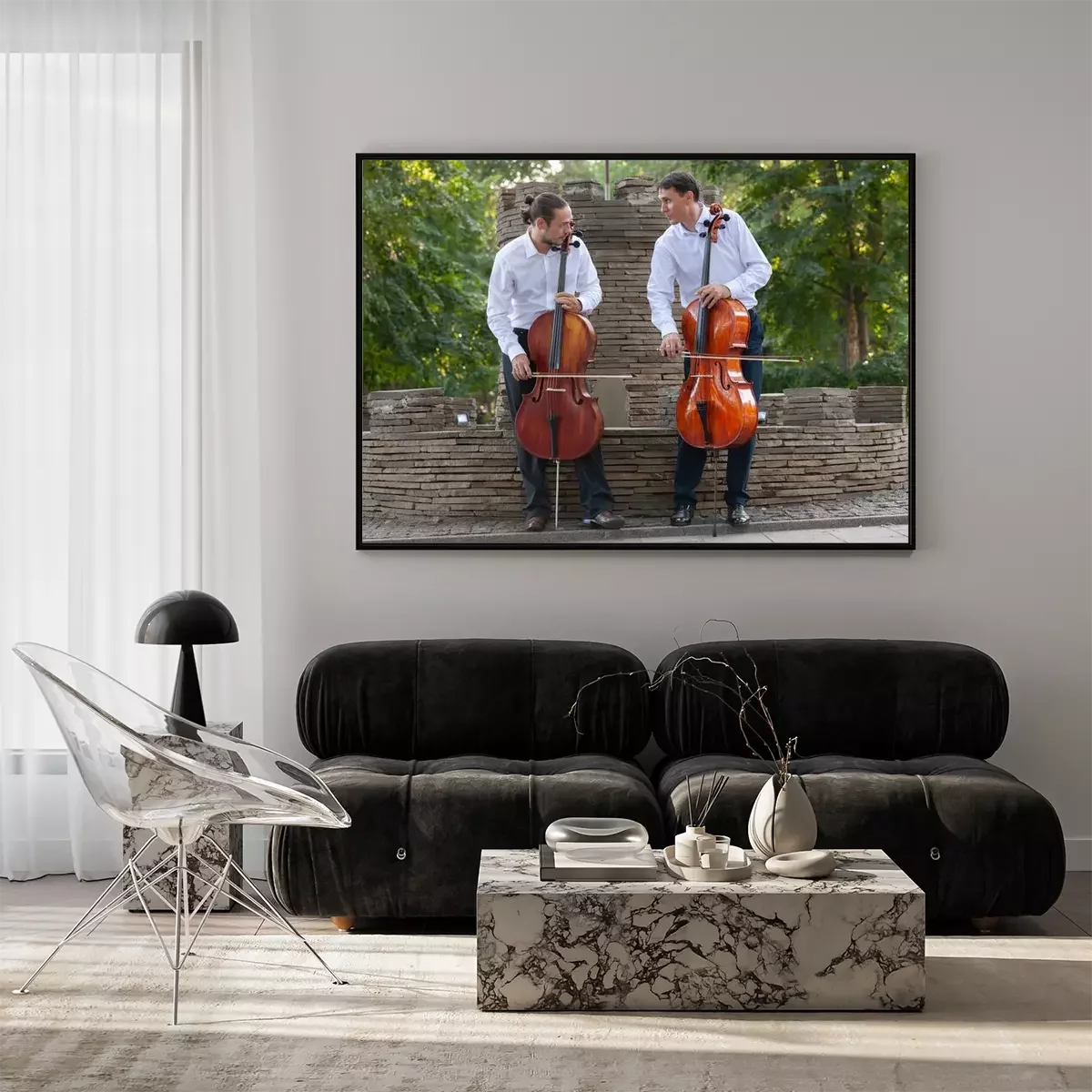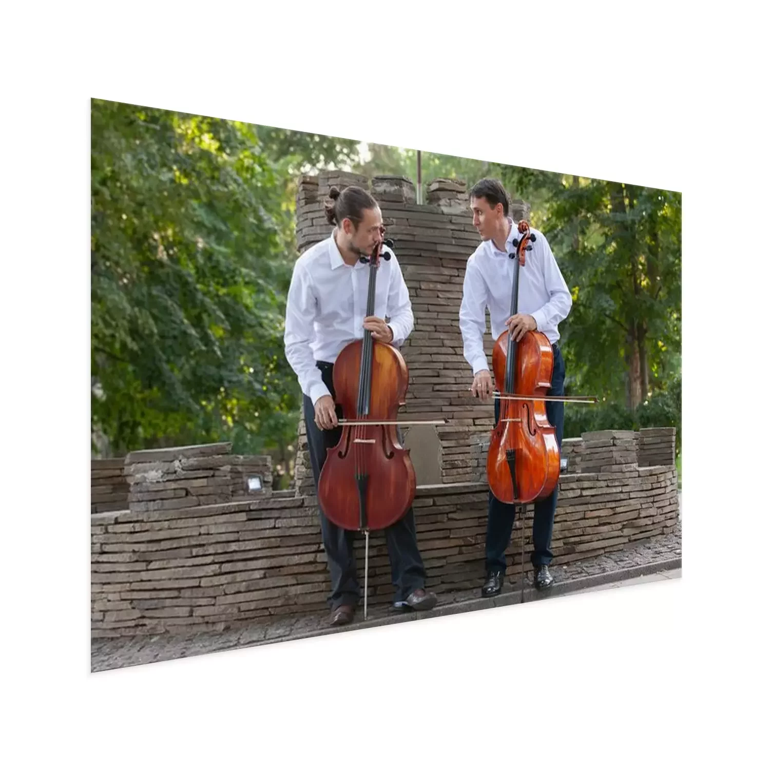 Poster  Cellist musician group perform music in the street, close up man playing violin