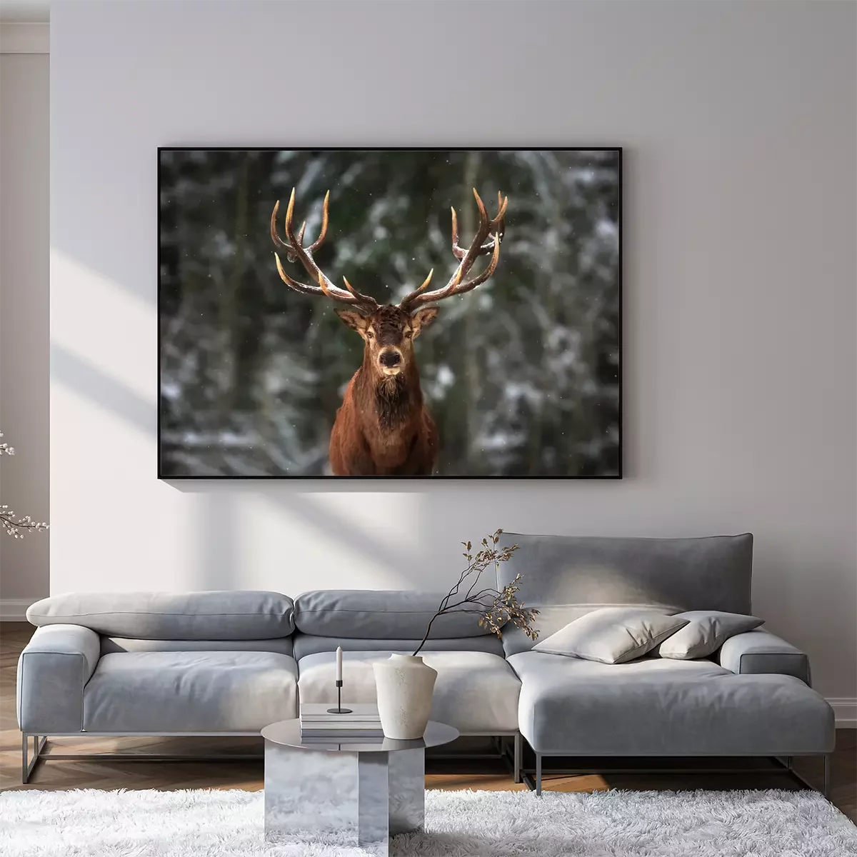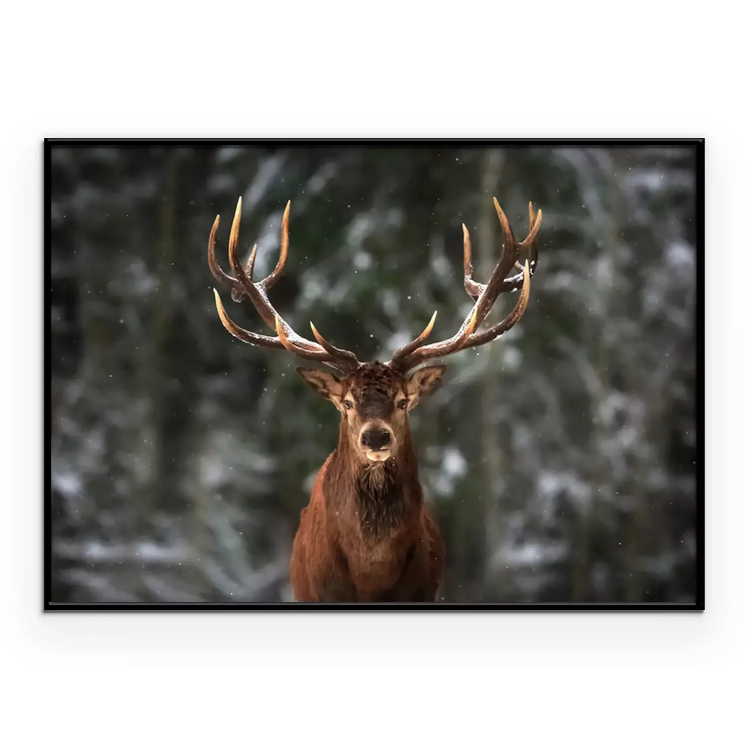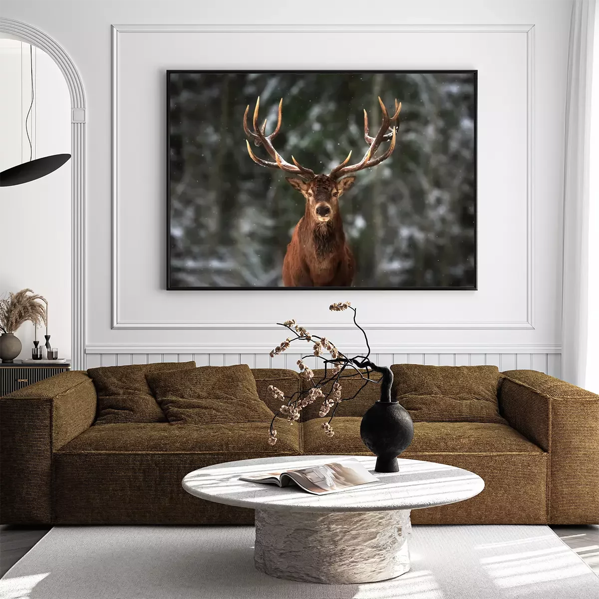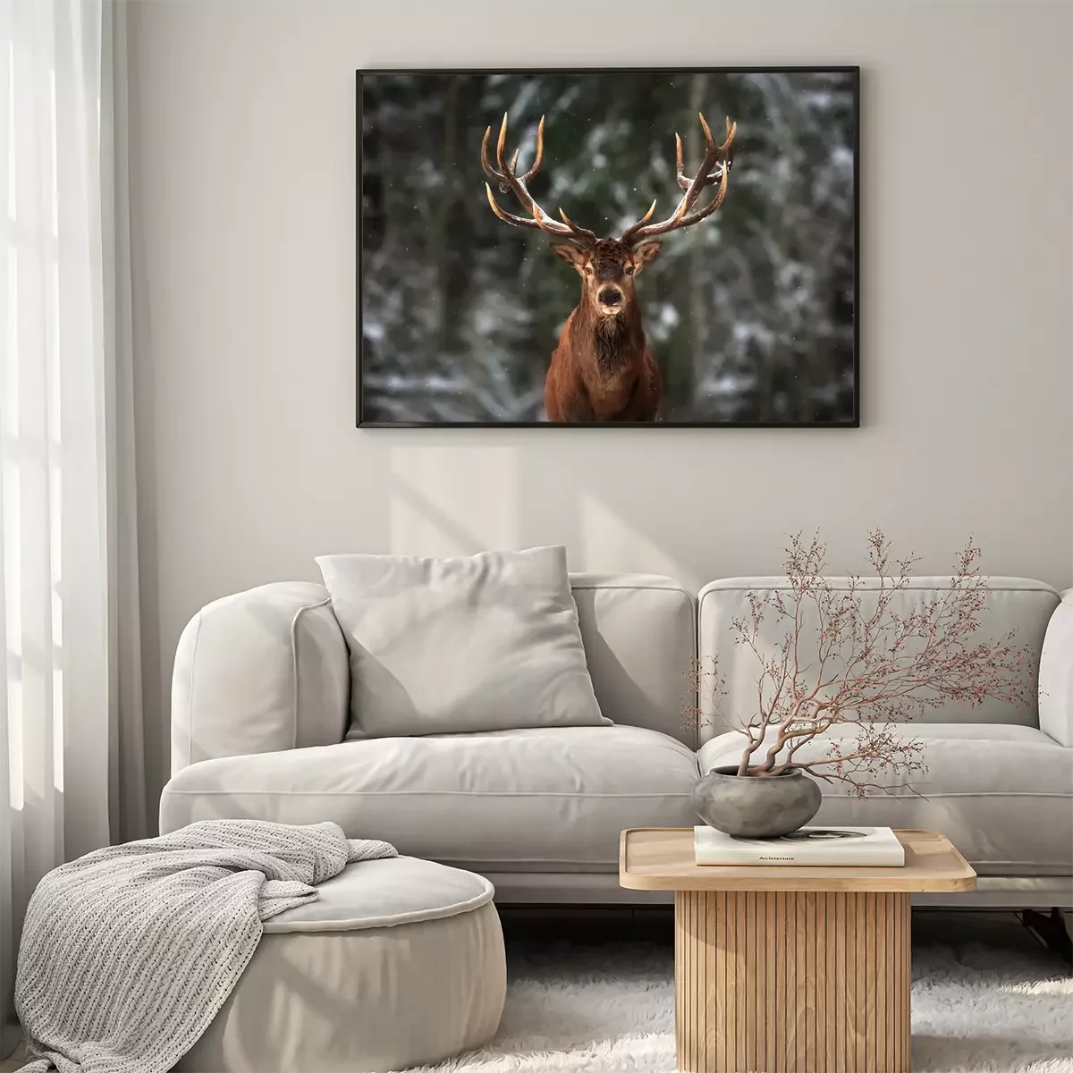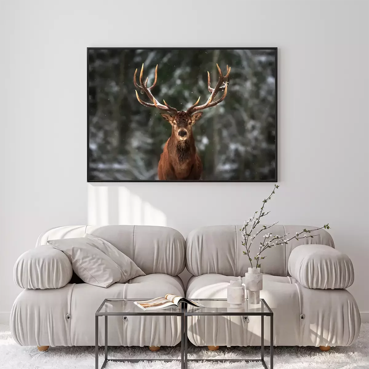Poster  Cerf dans la neige avec un paysage forestier en arrière-plan