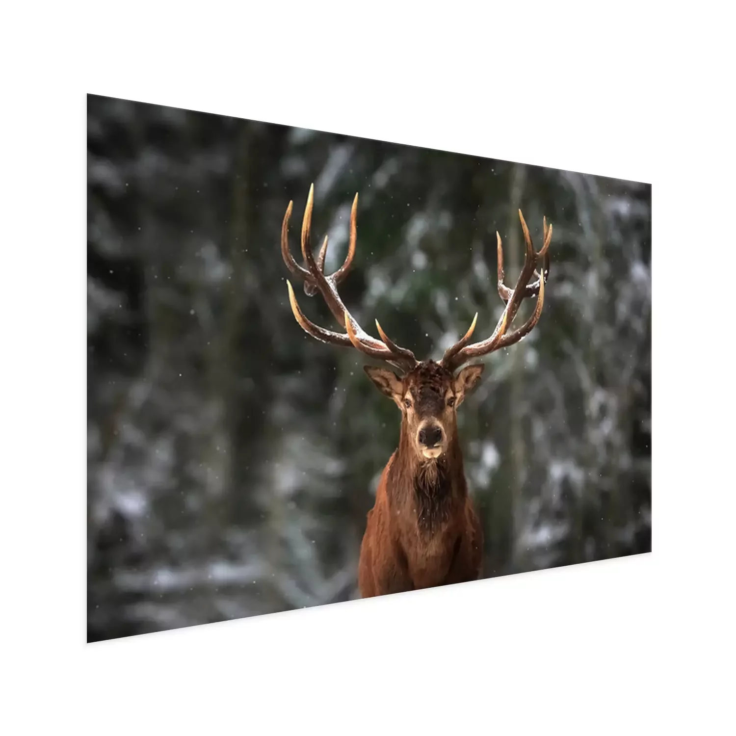 Poster : Cerf dans la neige avec un paysage forestier en arrière-plan