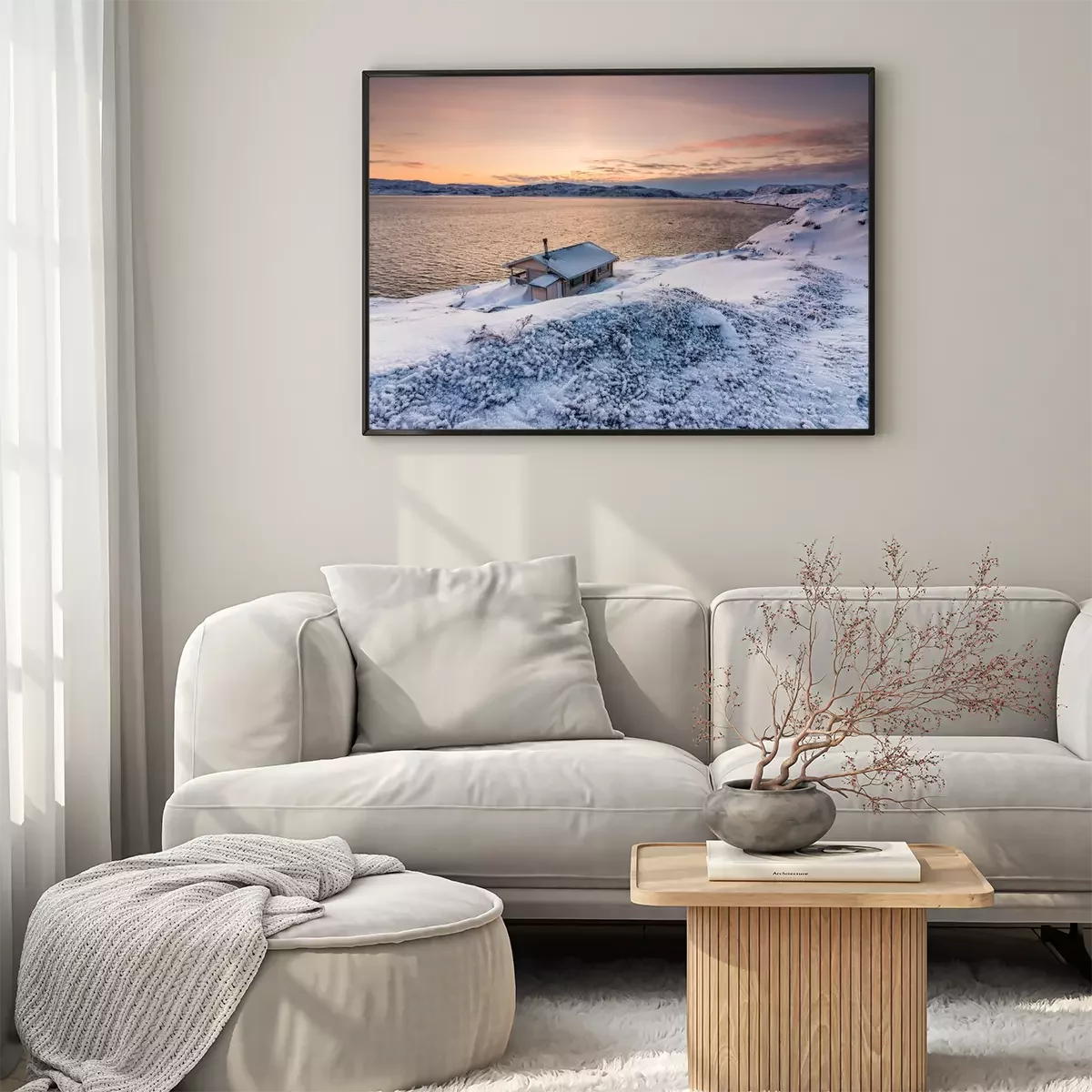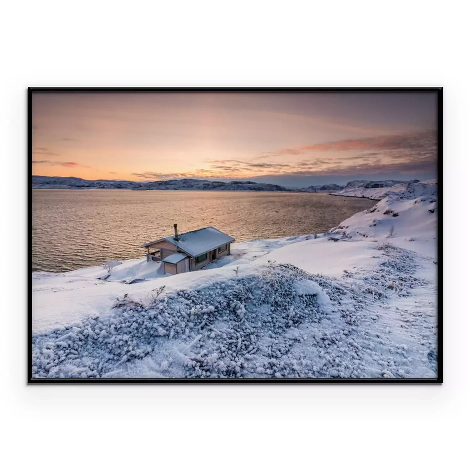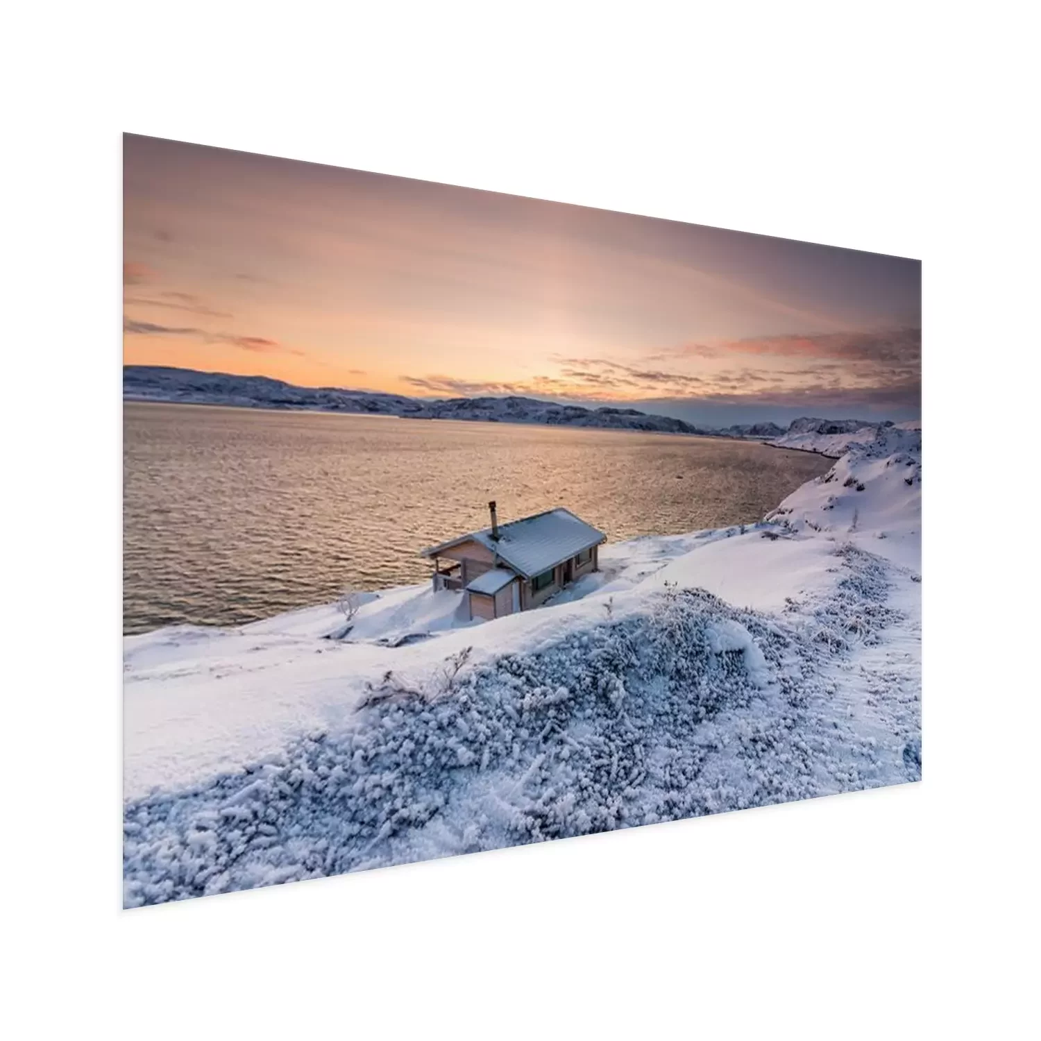 Poster  Chalet au bord de l'océan Arctique au coucher du soleil en hiver