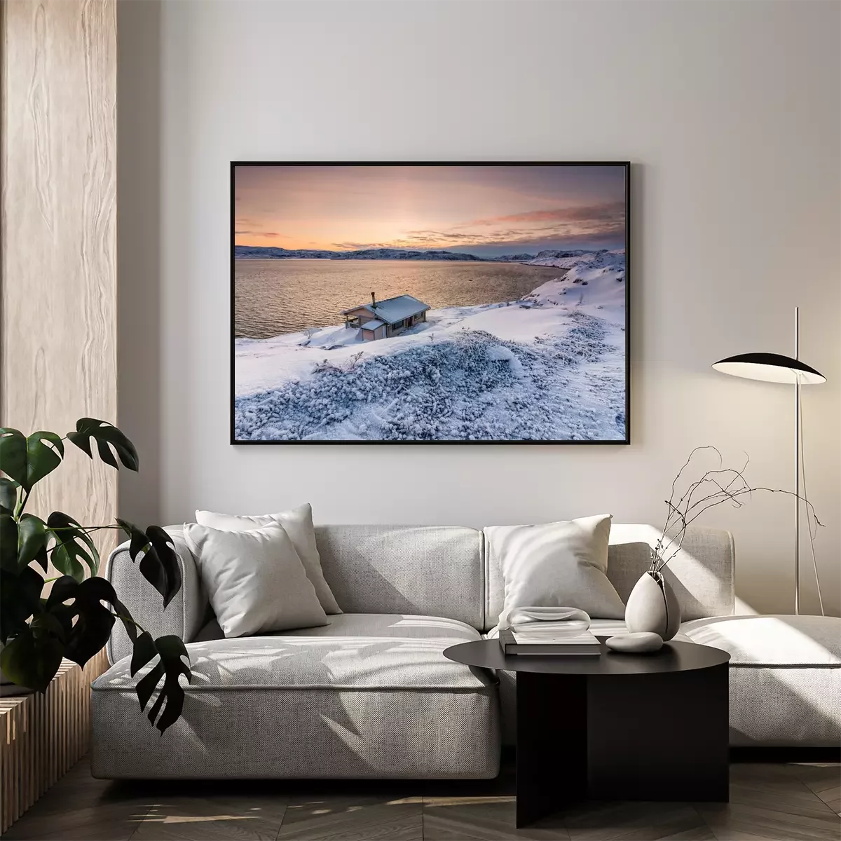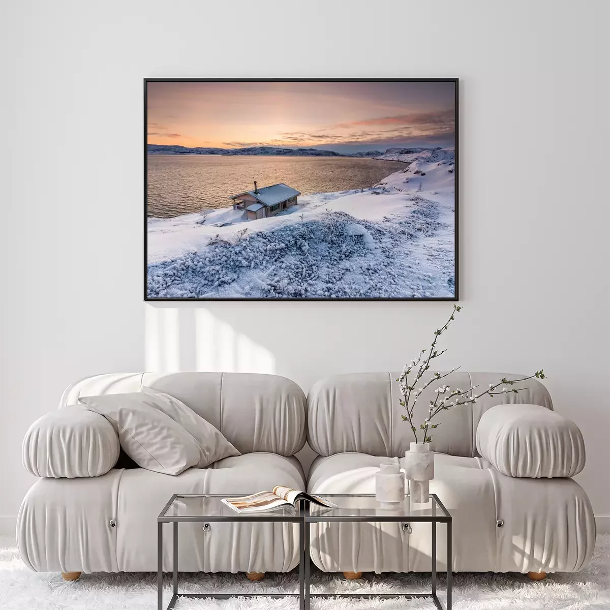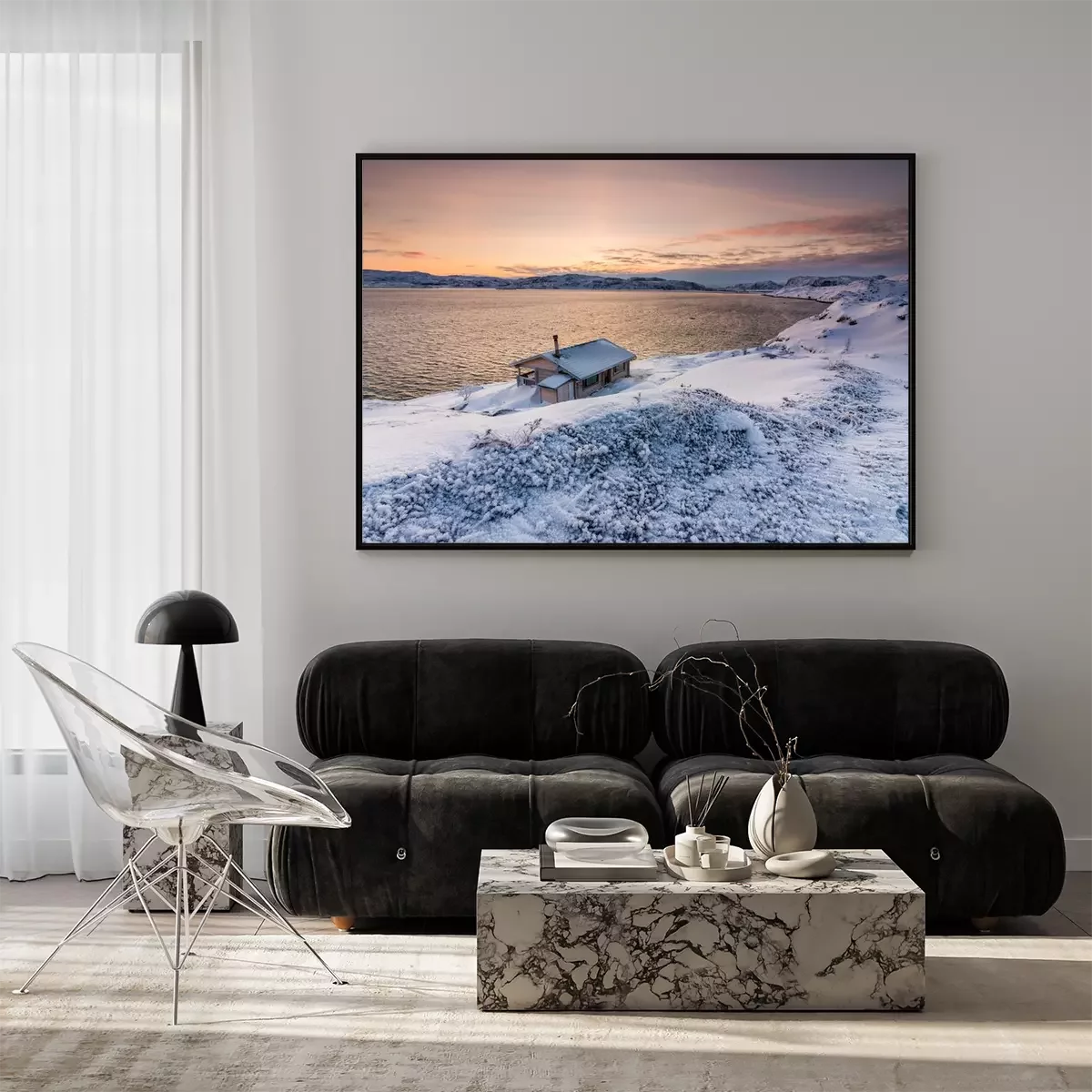 Poster  Chalet au bord de l'océan Arctique au coucher du soleil en hiver