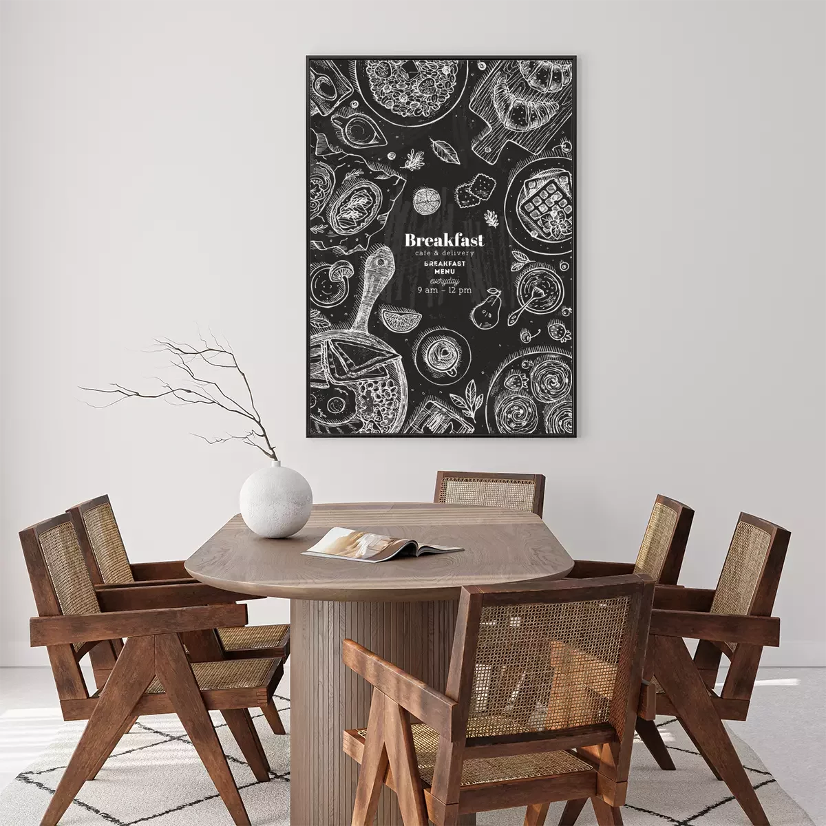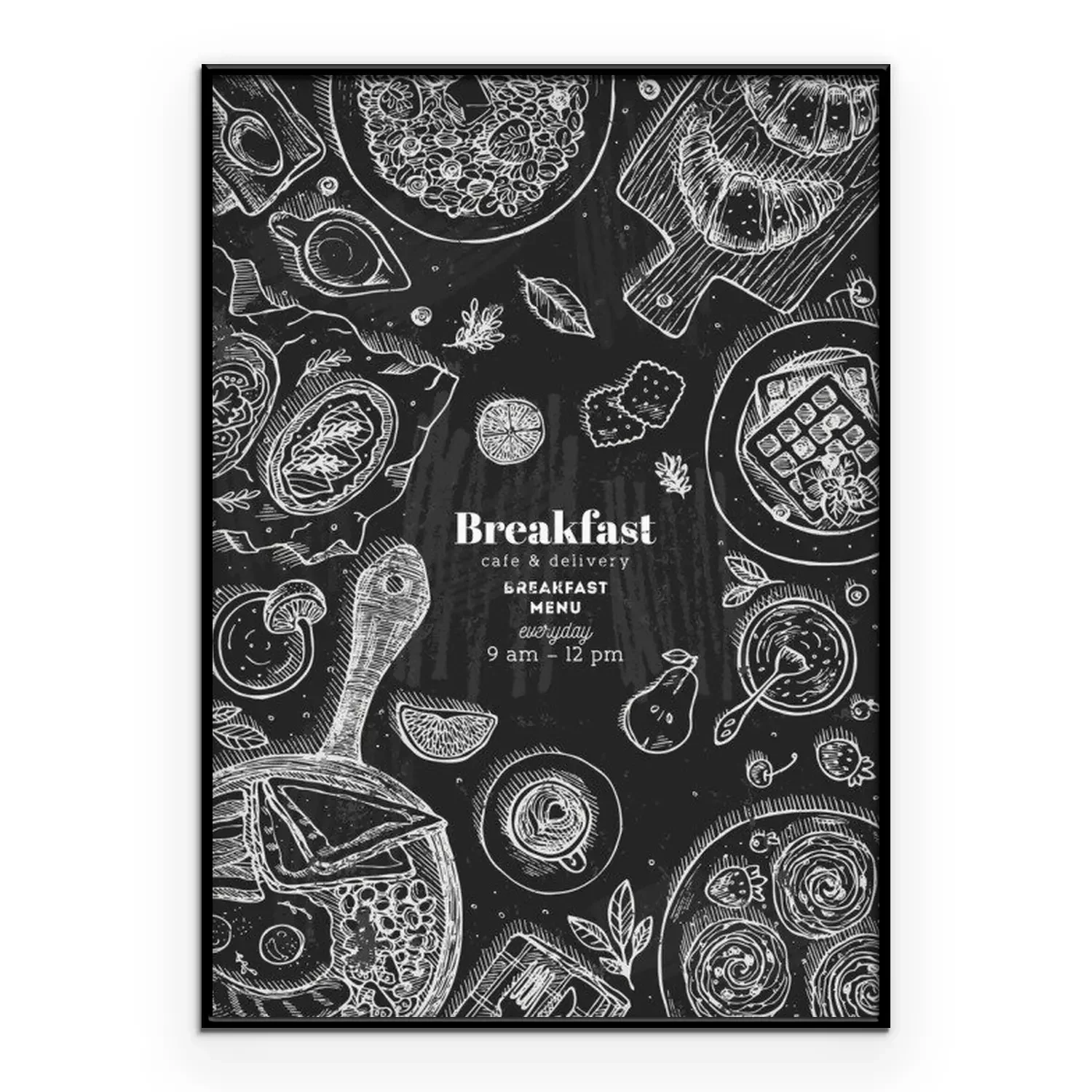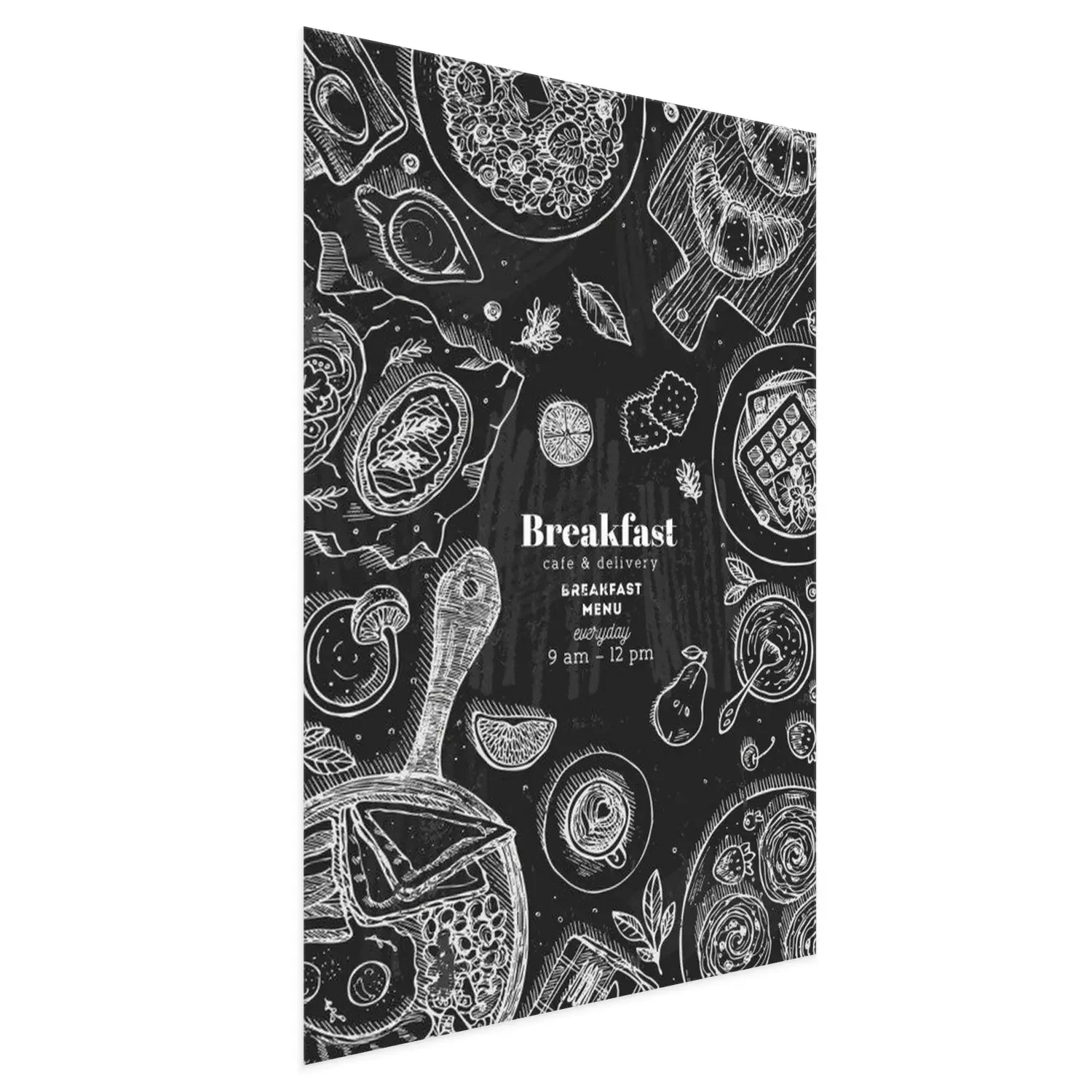 Poster  Chalkboard vertical breakfast top view illustration. Various food background. Engraved style illustration. Hero image. Vector illustration