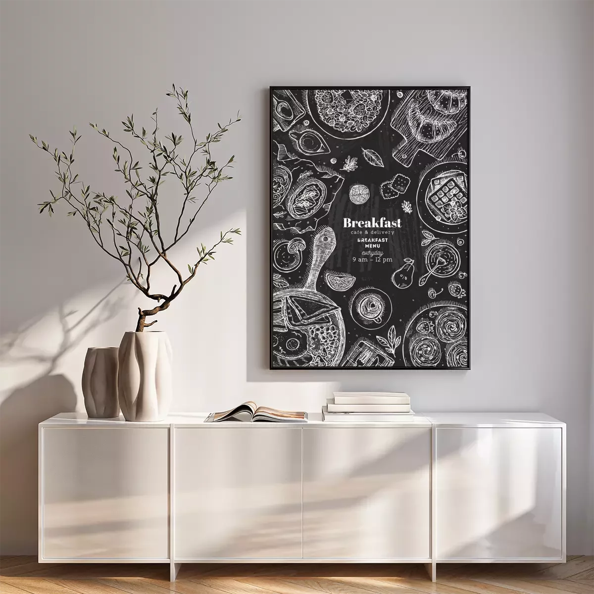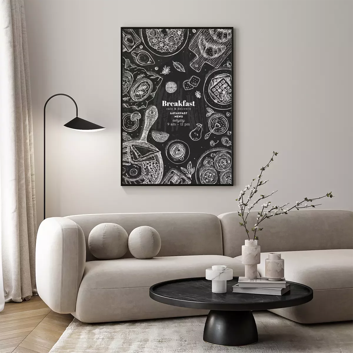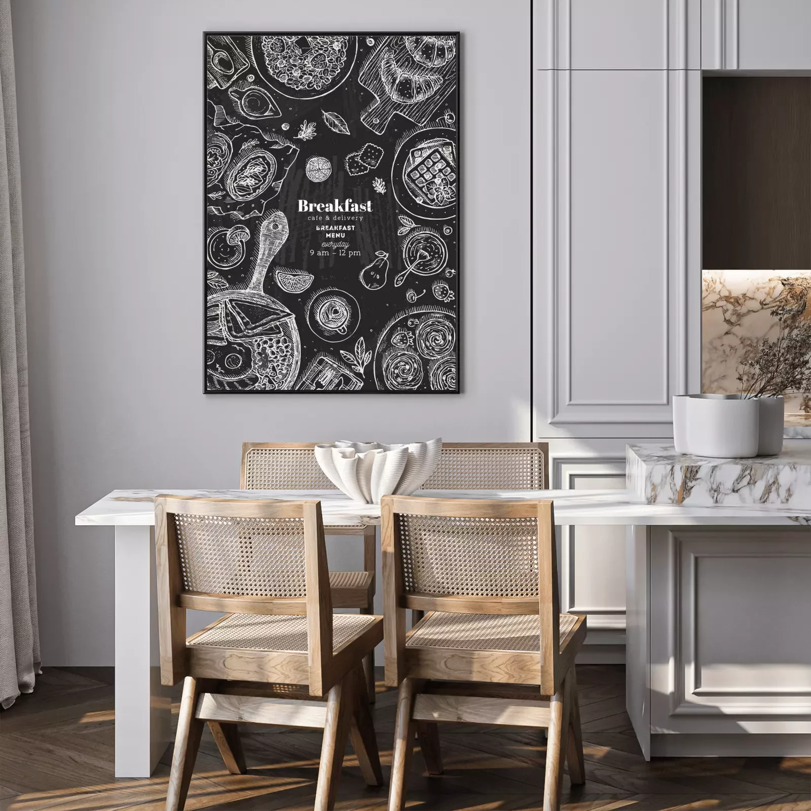 Poster  Chalkboard vertical breakfast top view illustration. Various food background. Engraved style illustration. Hero image. Vector illustration
