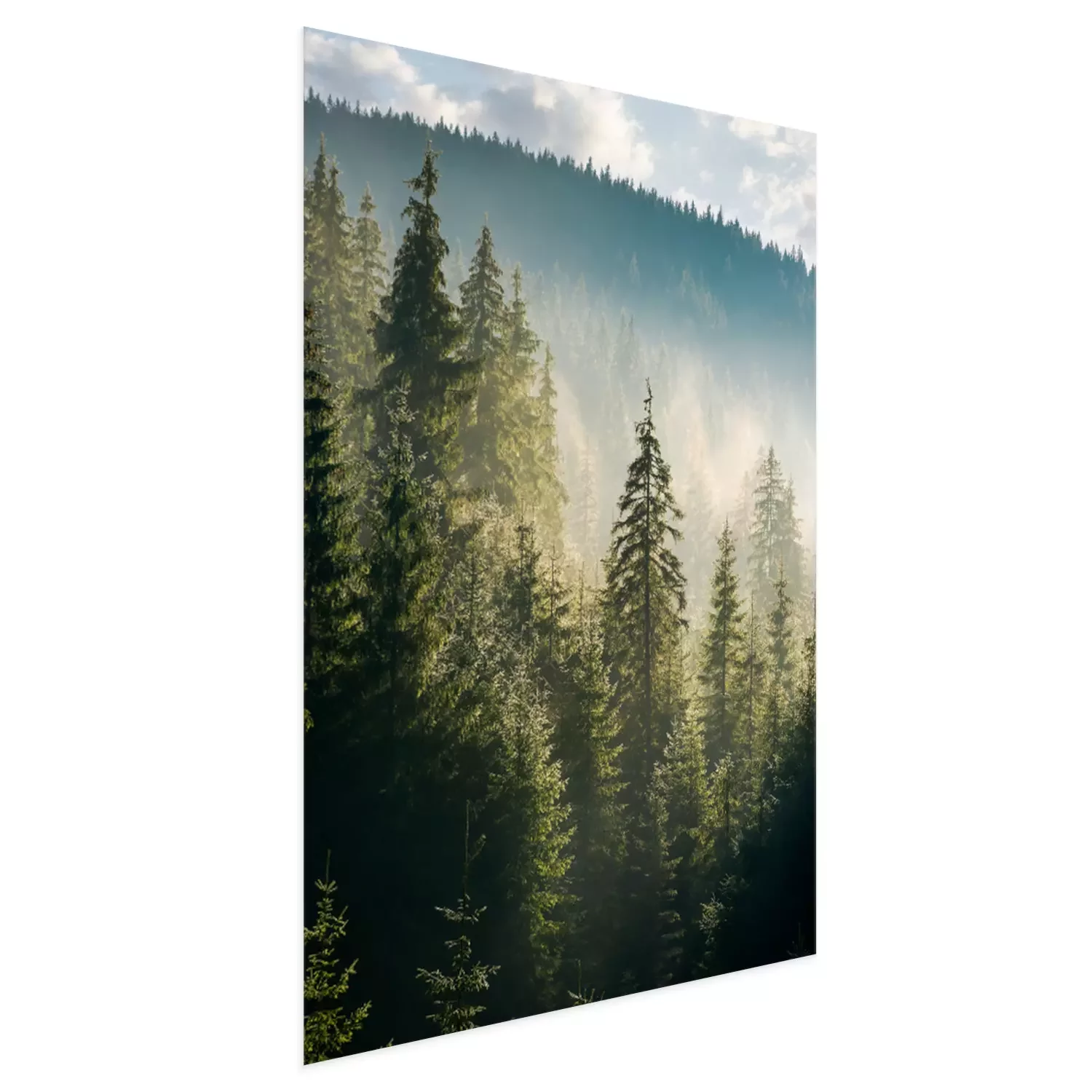 Forêt de conifères dans les montagnes enveloppée de brouillard