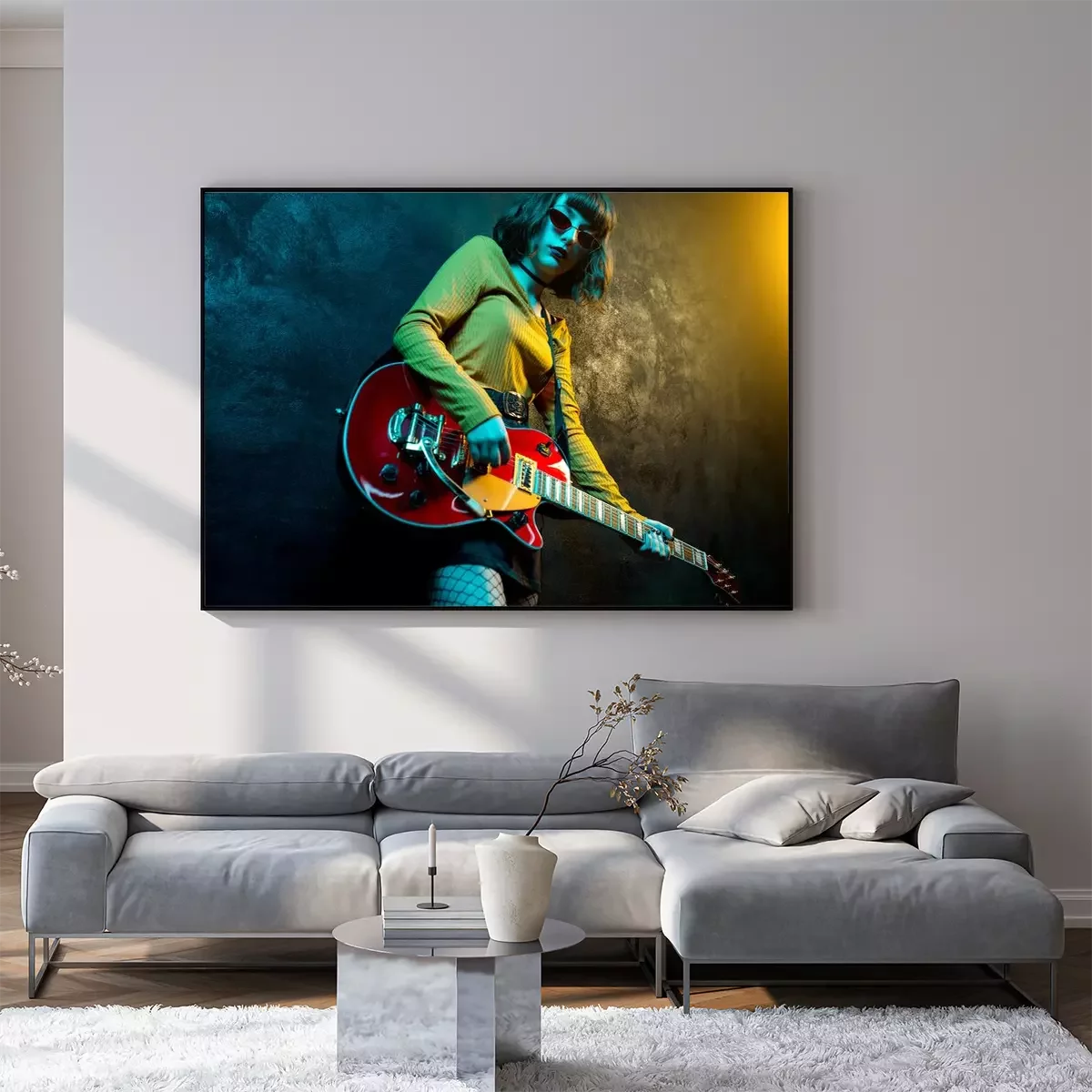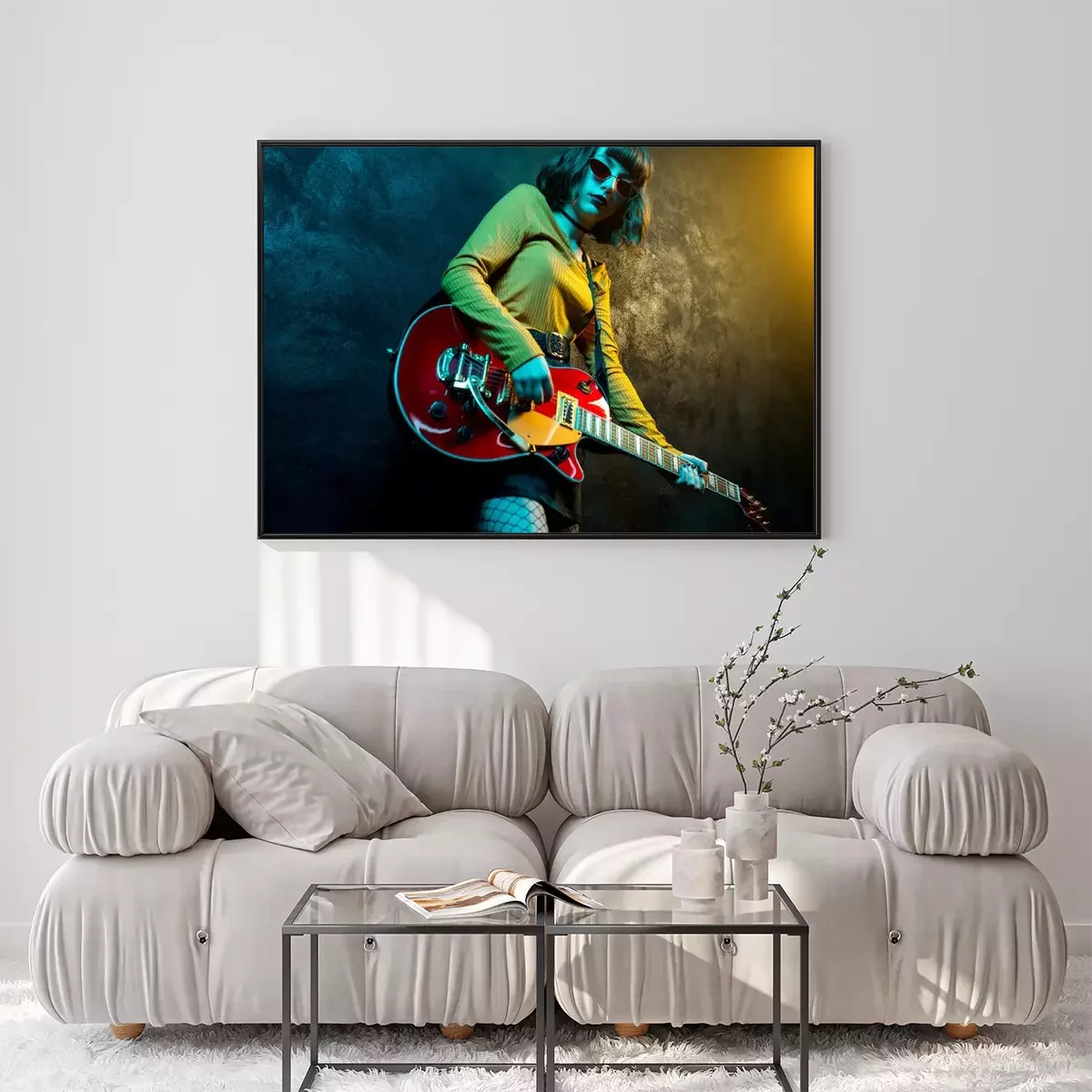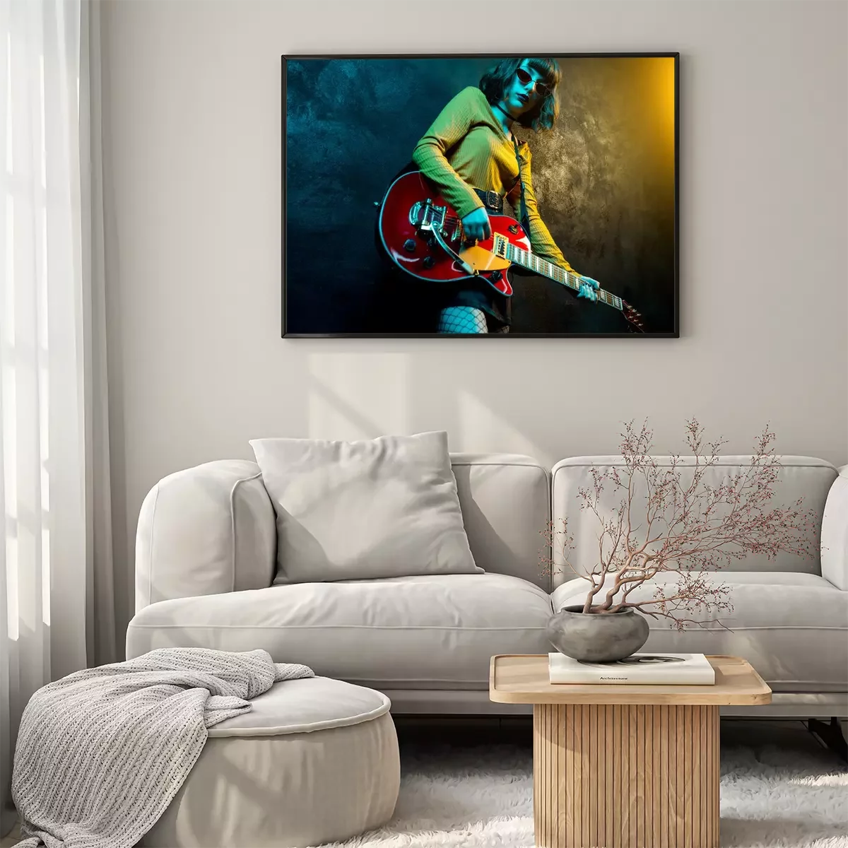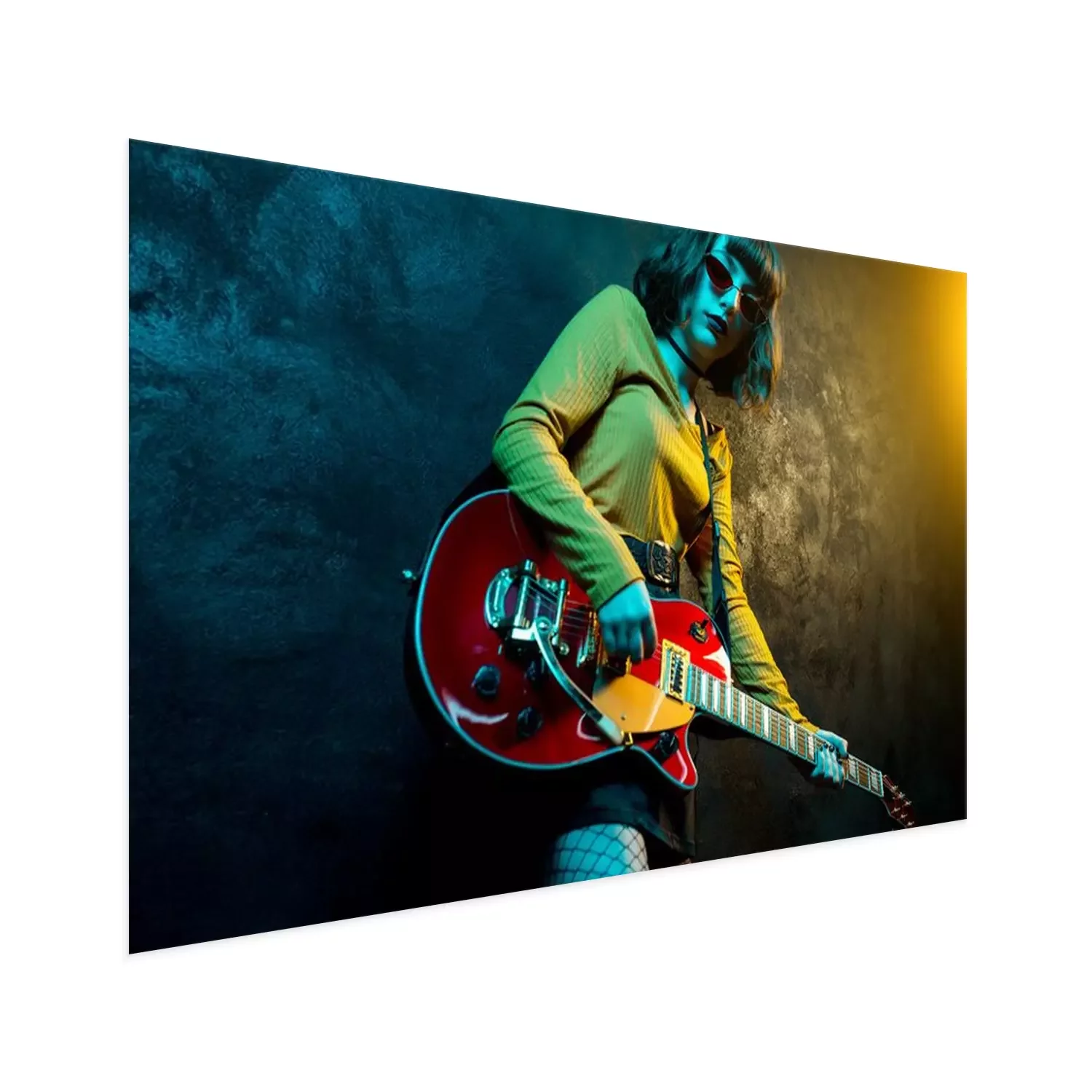 Poster : Charming hipster woman with curly hair with red guitar in neon lights. Rock musician is playing electrical guitar. 90s style concept.