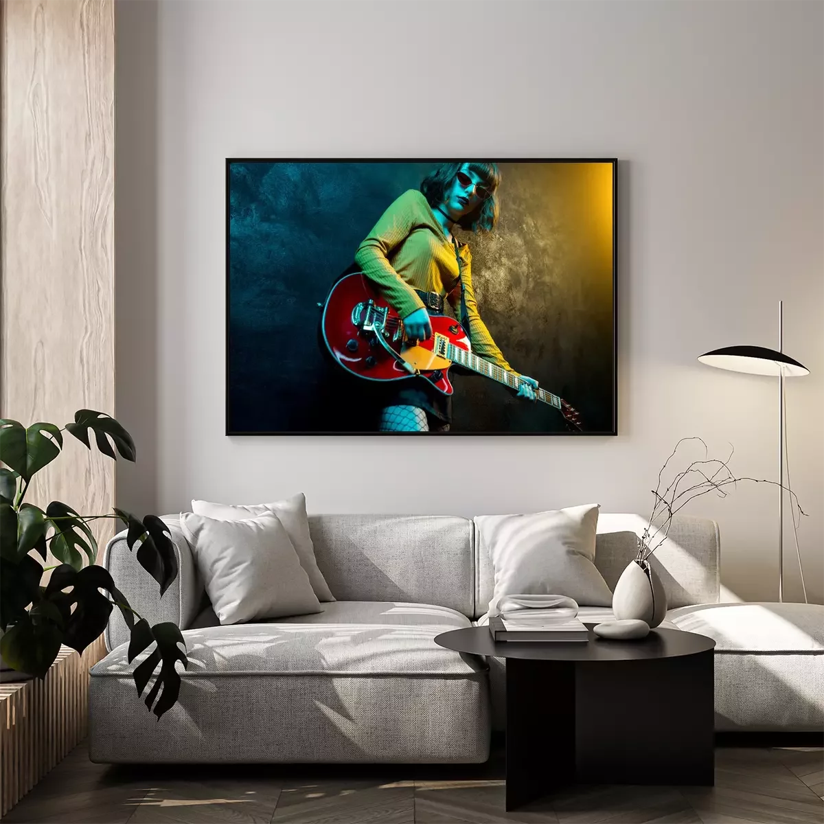 Poster  Charming hipster woman with curly hair with red guitar in neon lights. Rock musician is playing electrical guitar. 90s style concept.