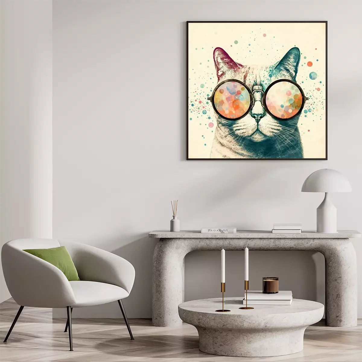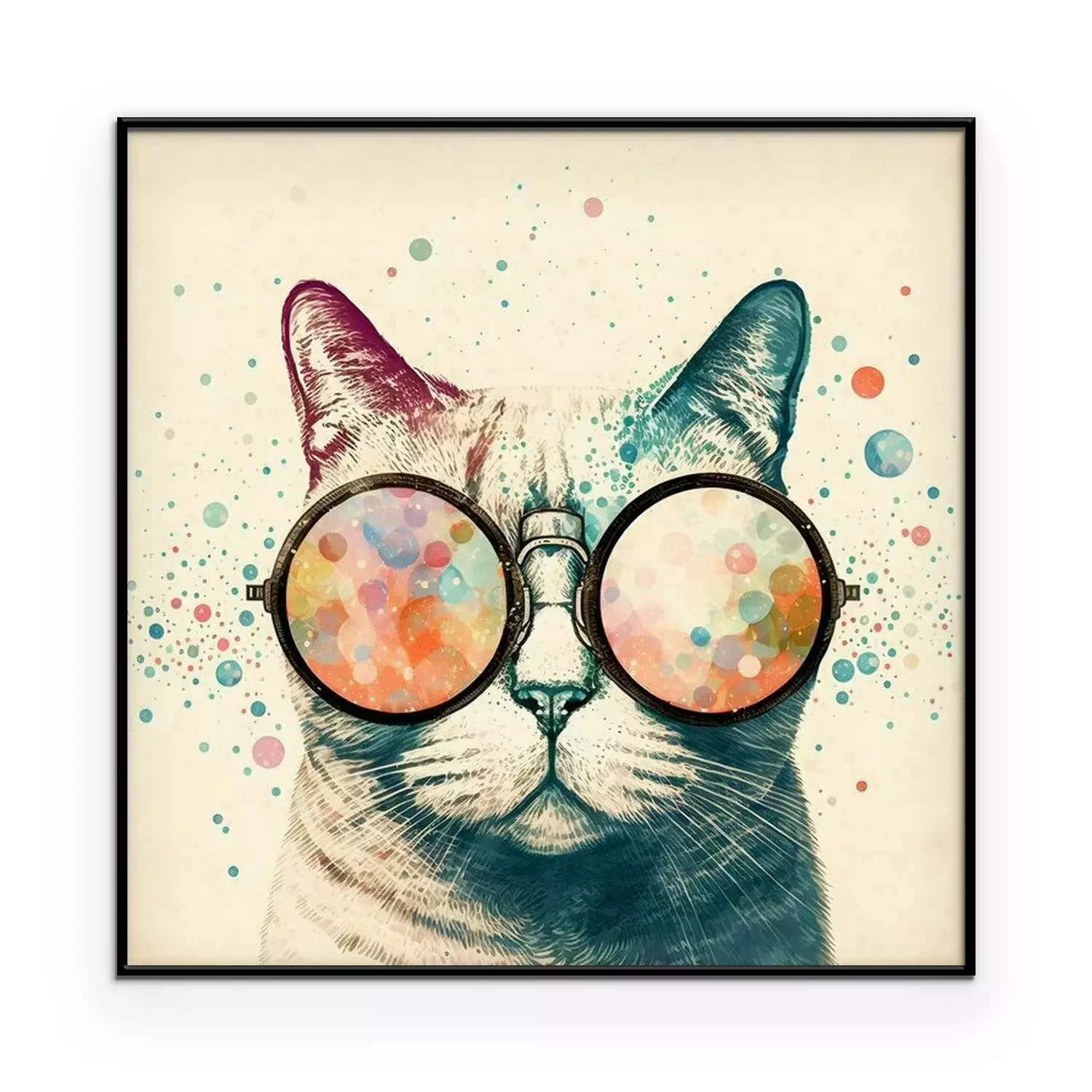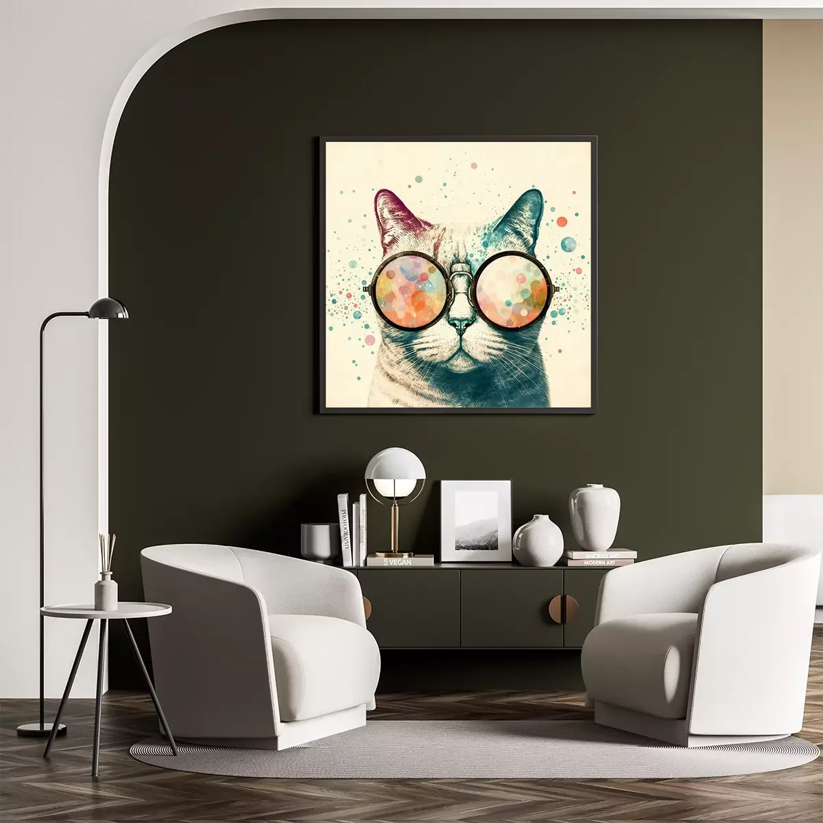 Place à un poster exceptionnel avec un chat ! Si vous adorez les ronronnements, rien ne vaut le choix d’une telle décoration murale chez vous. Pour beaucoup d'entre nous, les animaux sont des membres à part entière de la famille, voilà pourquoi nous pensons qu'il est important de souligner aussi leur présence dans la décoration d’intérieur. Un poster avec un chat deviendra ainsi une solution pour embellir le salon ou la chambre à coucher et un moyen de souligner l’importance qu’ont ces petits félins pour vous. Un tel motif ne sera pas une simple décoration éphémère - tant qu'il est tendance et ne devient pas lassant - mais s'invitera dans votre décoration d’intérieur pour de nombreuses années, ravissant les yeux de tous les membres du foyer. Grâce à sa combinaison d’esthétiques différentes, notre poster chaton offre également l’avantage de s'adapter à de nombreux styles différents. D'un côté, ce portrait est réaliste, de l'autre, le chat porte des lunettes « lennon » sur son nez, ce qui rend ce poster chat amusant. Le tout est maintenu dans une palette de couleurs discrète, mais le motif est enrichi de pois colorés tels des confettis qui tombent du ciel ce qui donne à ce poster chaton un caractère particulièrement expressif. Ce portrait de chat trouvera sa place, par exemple, dans un salon moderne, formant un contraste avec le caractère minimaliste et discret de l'intérieur. Il conviendra également à une décoration d’intérieur rétro inspirée des années 70 du siècle dernier. Nous recommandons aux amateurs de solutions décoratives expressives le choix d’un tel poster chaton pour la chambre à coucher, accroché au-dessus de la tête de lit, il donnera un tout nouveau visage à votre décoration d’intérieur. Nous le recommandons également pour parfaire une ambiance de style boho et kawaii reposant sur la présence de couleurs pastel et de meubles aux formes douces et arrondies. Ce poster chat conviendra également à merveille pour la décoration d’une chambre d’ado. Les lunettes « lennon » que porte l'animal font référence au célèbre chanteur du groupe The Beatles, c'est donc une idée parfaite pour combiner l'amour des animaux et celui de la musique ! Pour obtenir le meilleur effet visuel, nous vous conseillons le choix d’un cadre noir pour votre poster chaton. Le portrait amusant d’un petit chat est également une excellente option pour la décoration d’une chambre d'enfant. Tous les petits adorent les animaux, donc si votre enfant rêve d'avoir un animal, mais est encore trop petit pour s'en occuper, les posters de chats pour le mur représentent une excellente alternative. Les chats deviendront les compagnons de jeu de l'enfant tout en rendant la décoration d’intérieur chaleureuse et agréable à l’œil. Et puisque, comme nous l'avons souligné, il ne s’agit pas d’un motif infantile, il pourra accompagner votre enfant pendant de nombreuses années, car il ne s’en lassera pas rapidement.