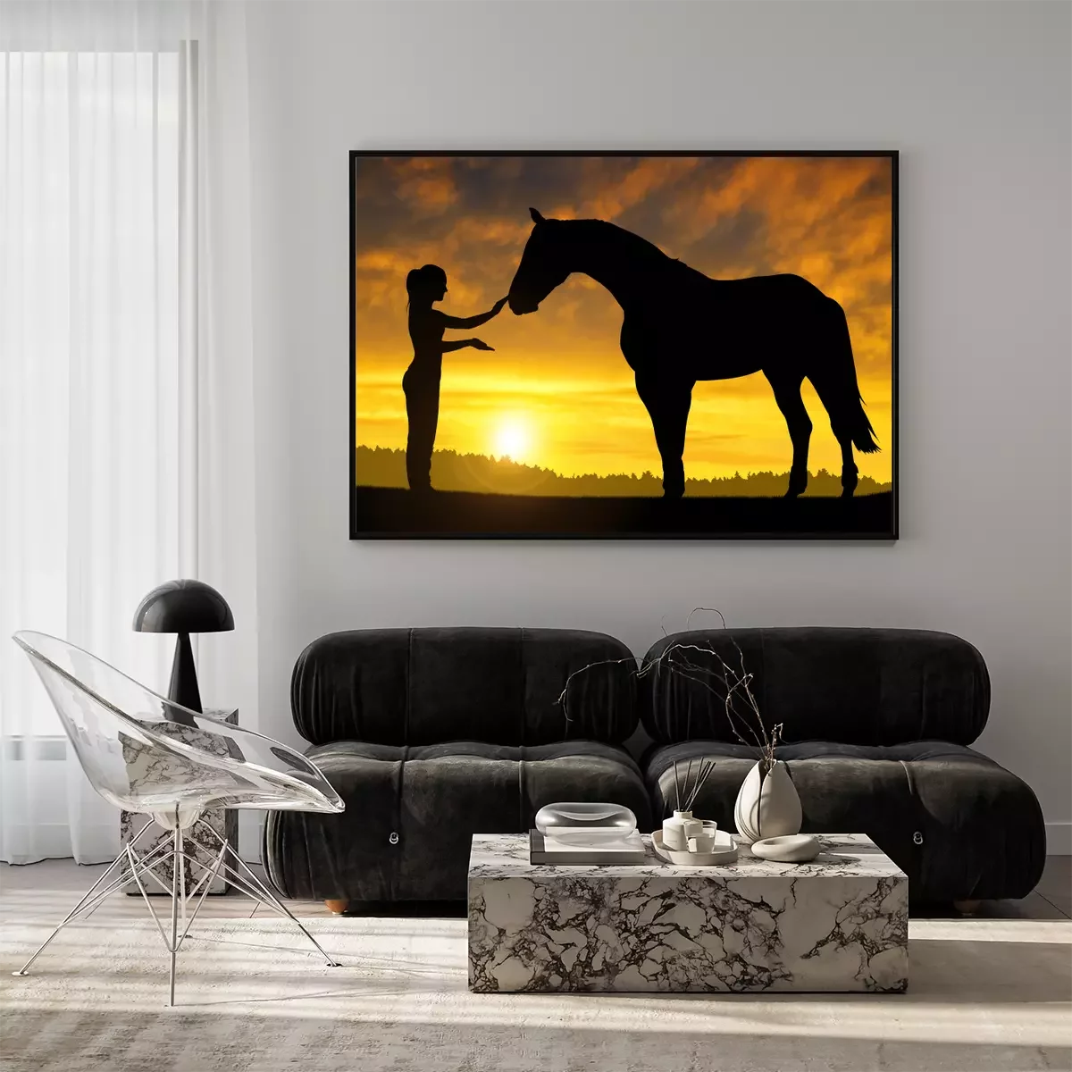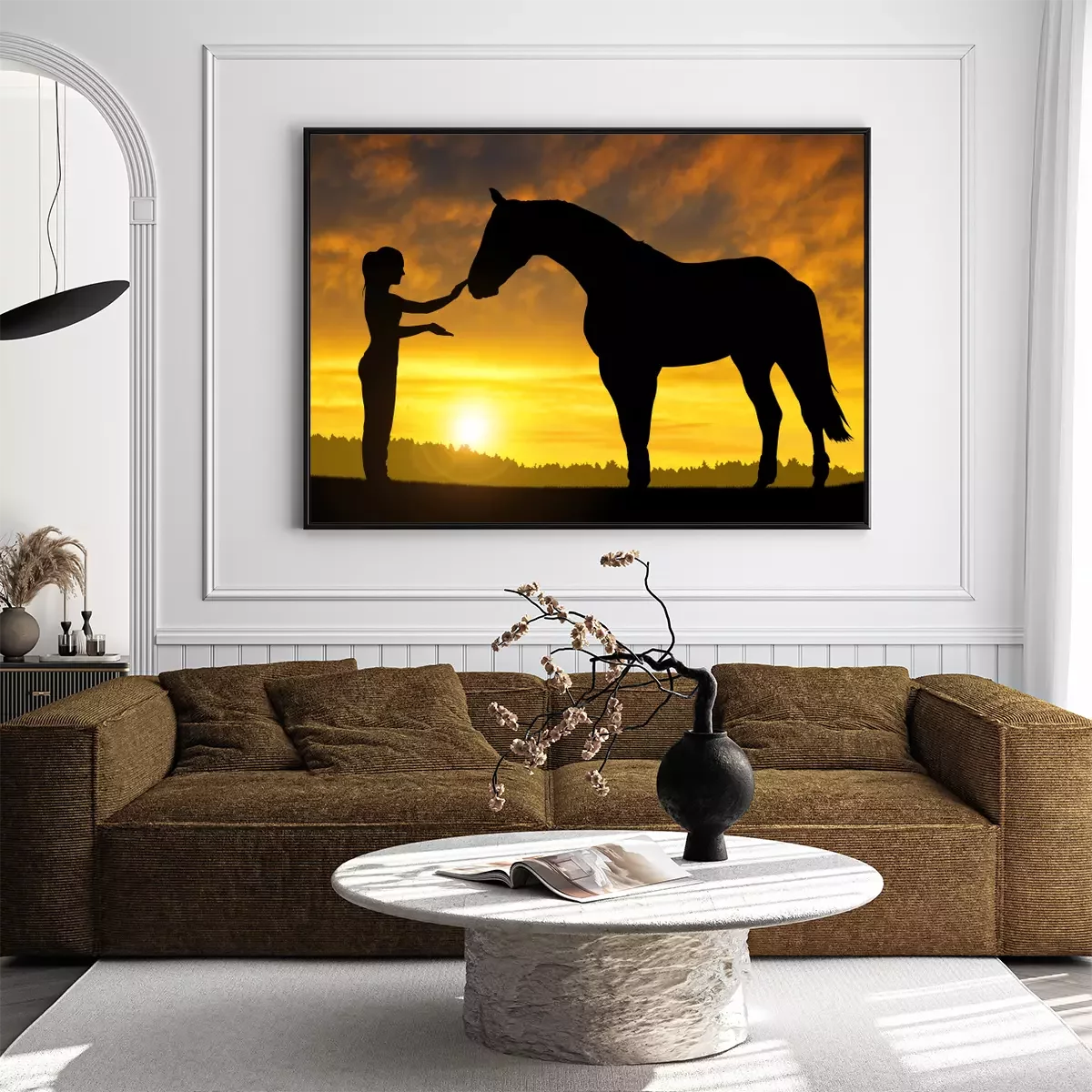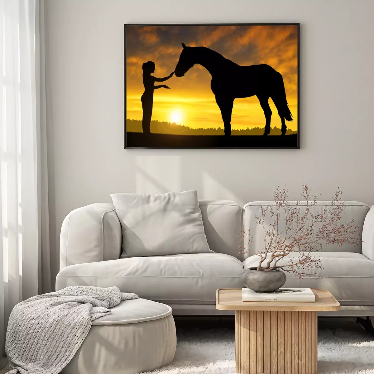 Poster  Cheval et femme au coucher du soleil
