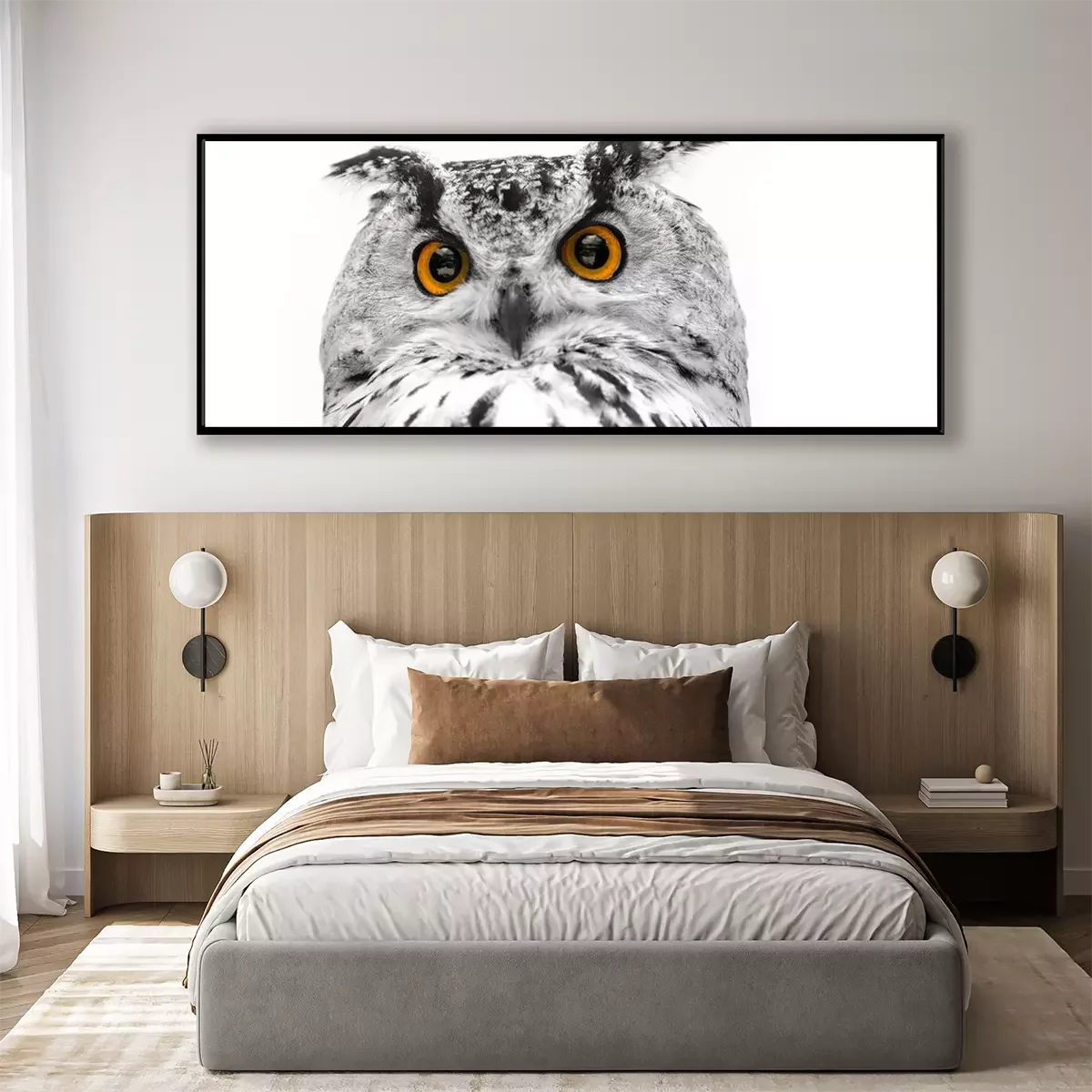 Les yeux jaunes du hibou cornu se bouchent sur un fond sombre.