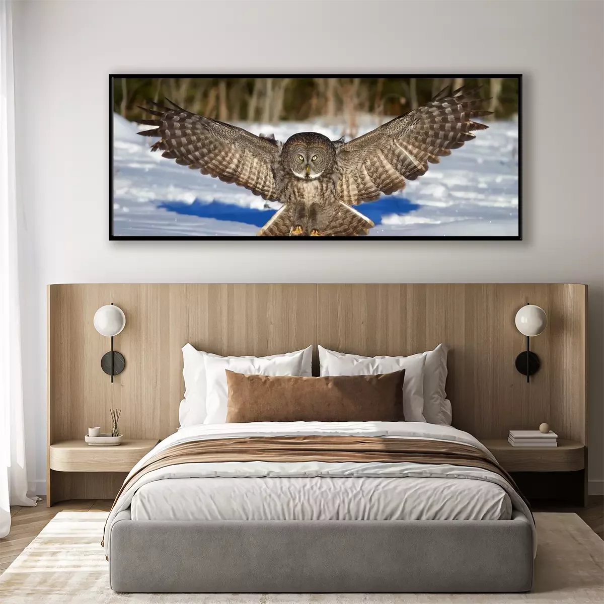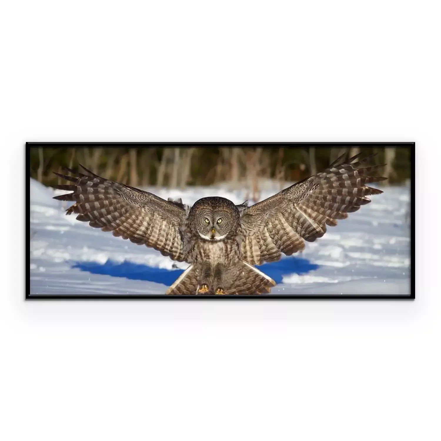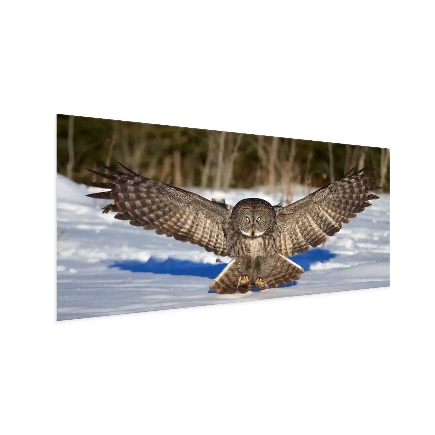 Snowy owl (Bubo scandiacus) isolated against a blue sky taking flight to hunt over a snow covered field in Ottawa, Canada
