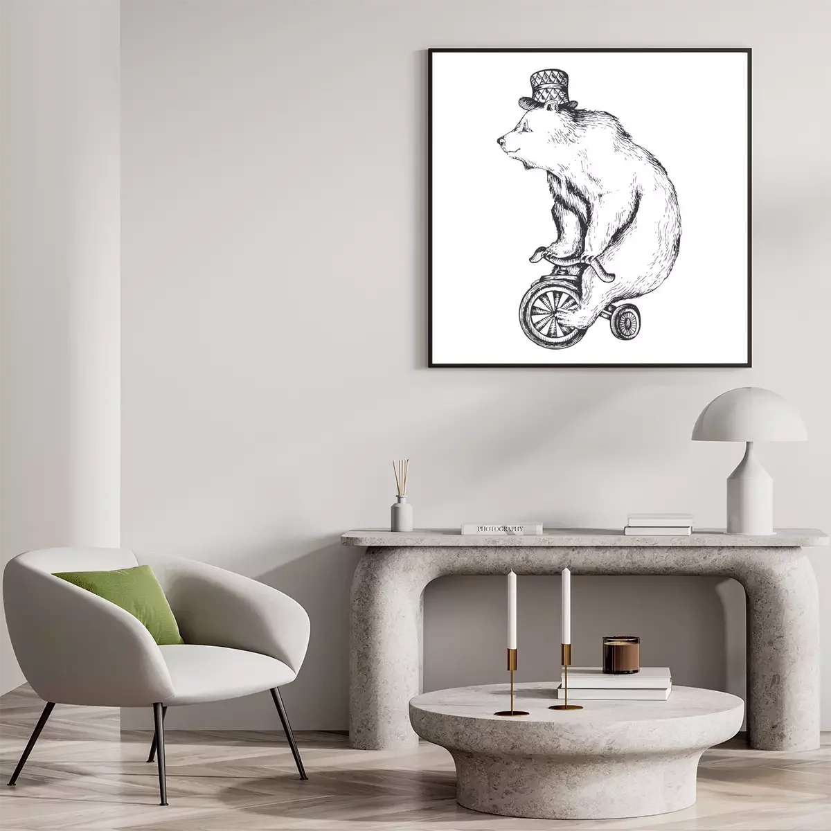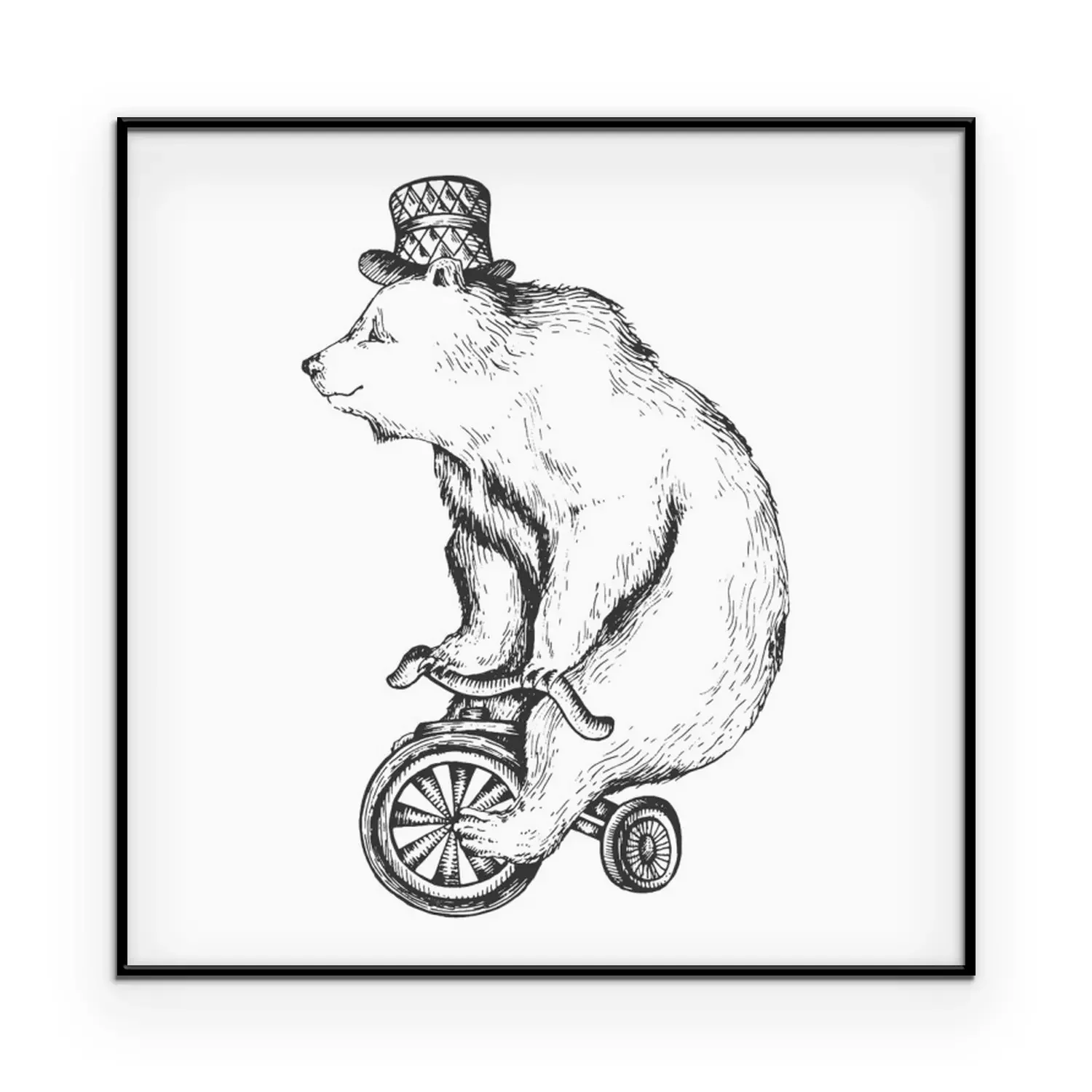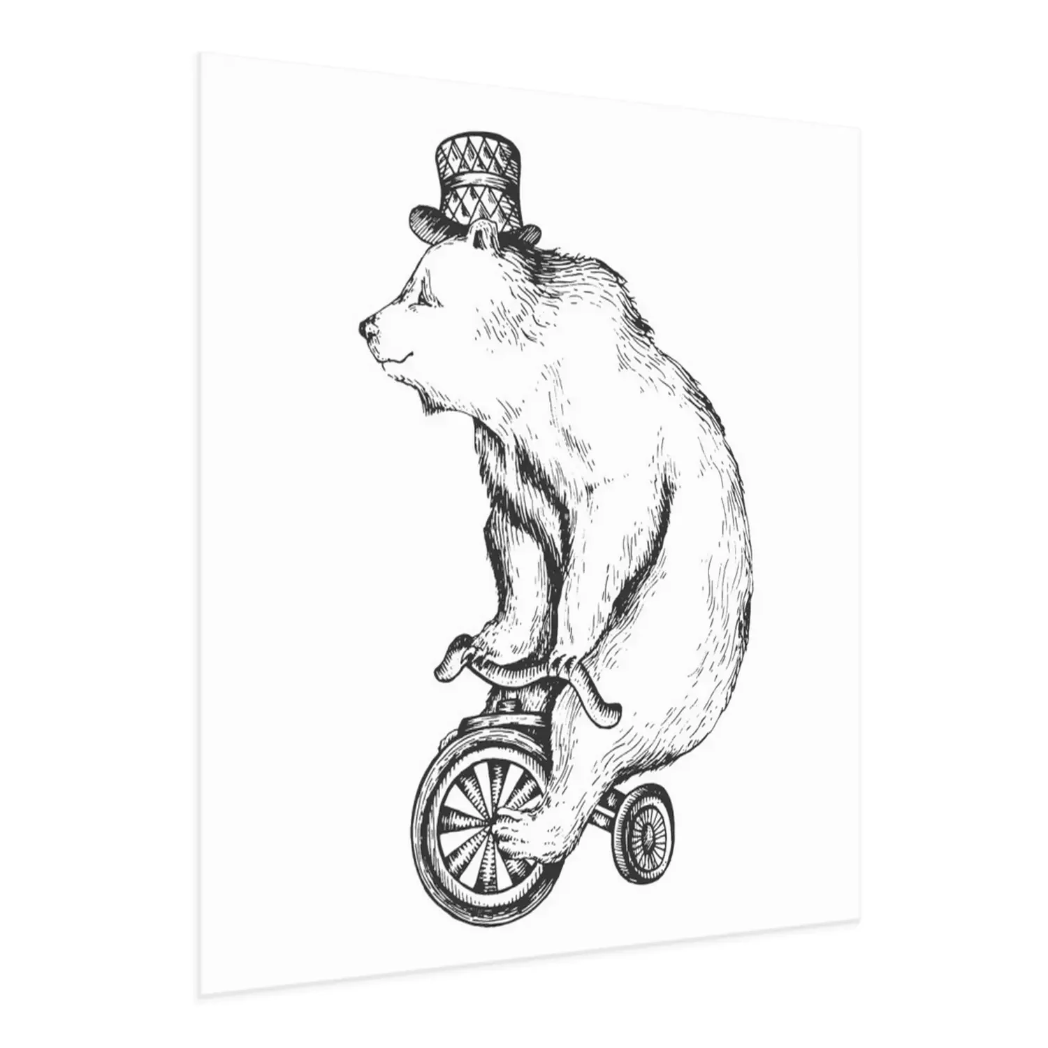 Poster : Circus bear on bicycle sketch engraving vector illustration. Scratch board style imitation. Hand drawn image.