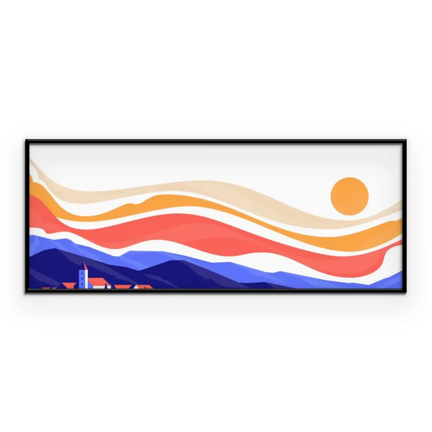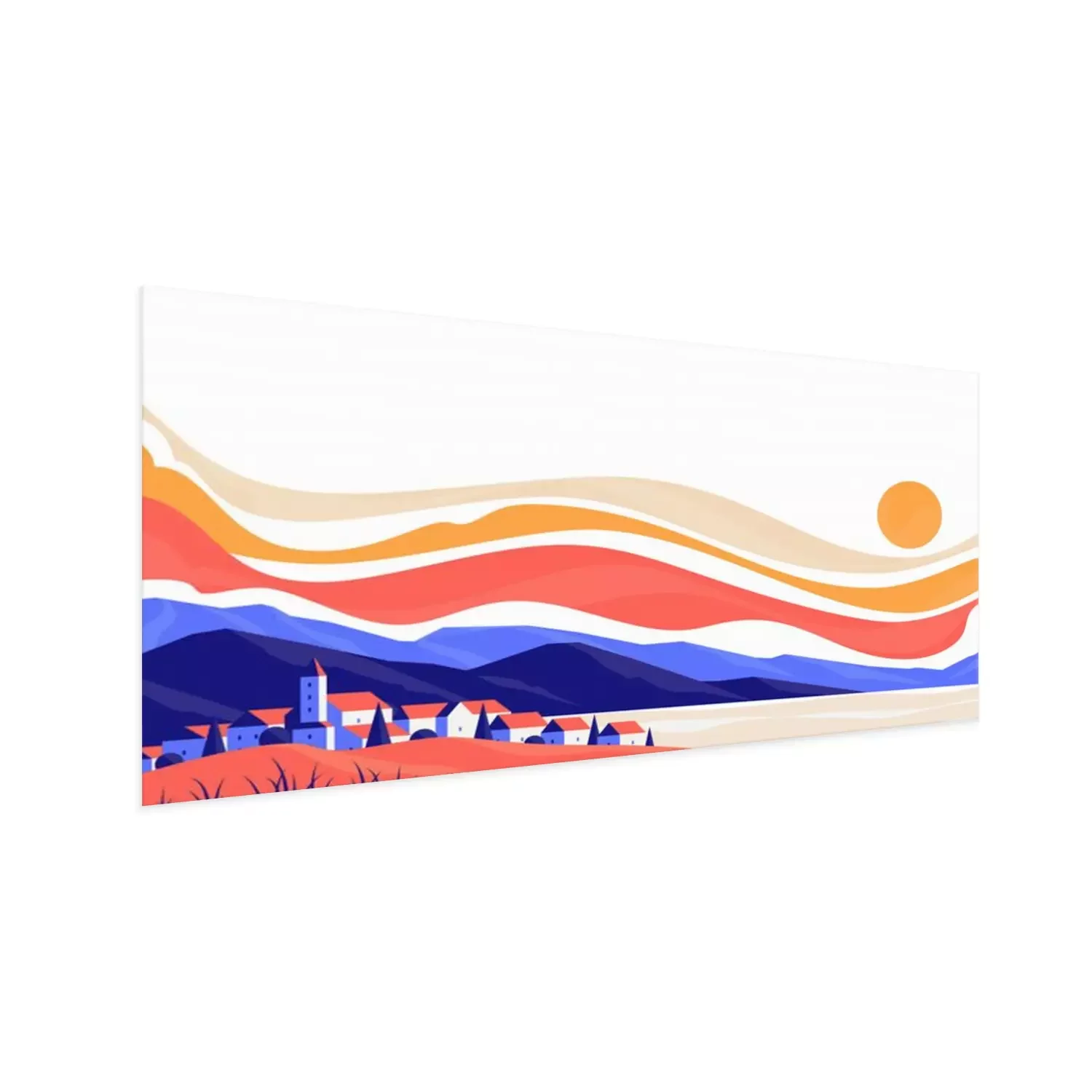 Poster  City landscape of cute small buildings on background of rocky mountains at sunrise