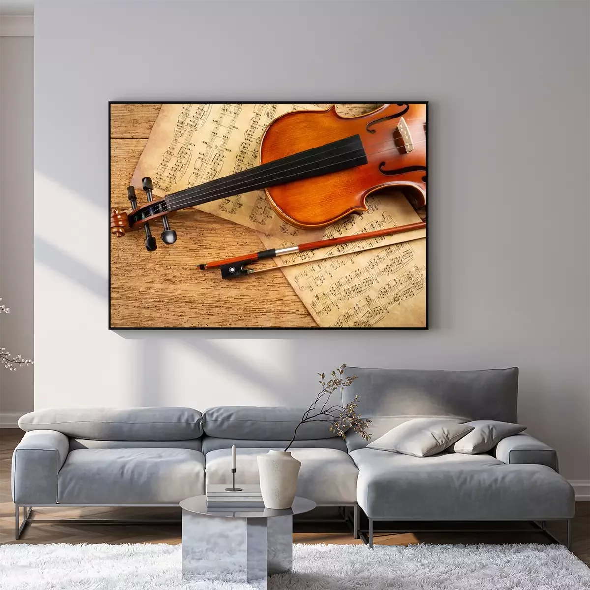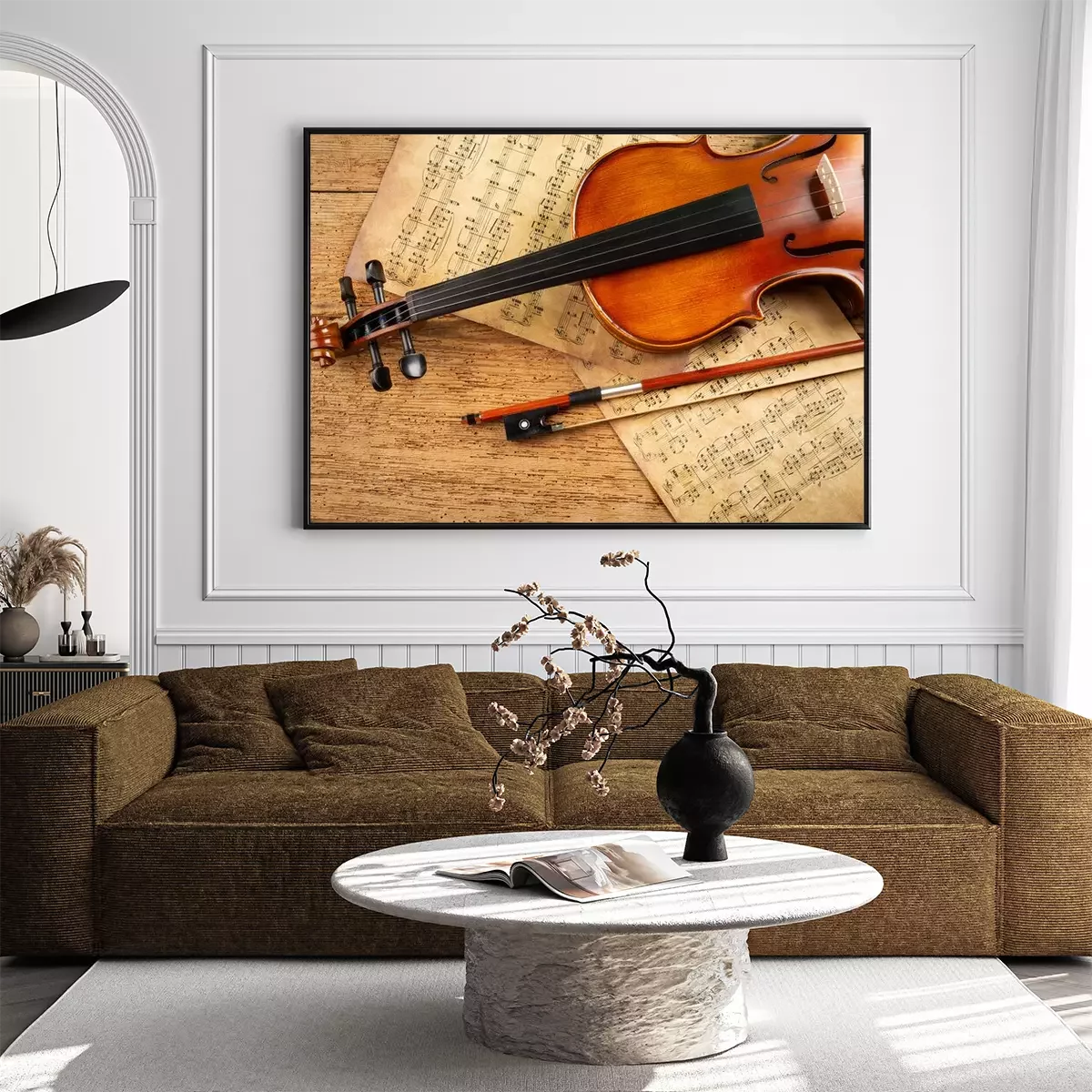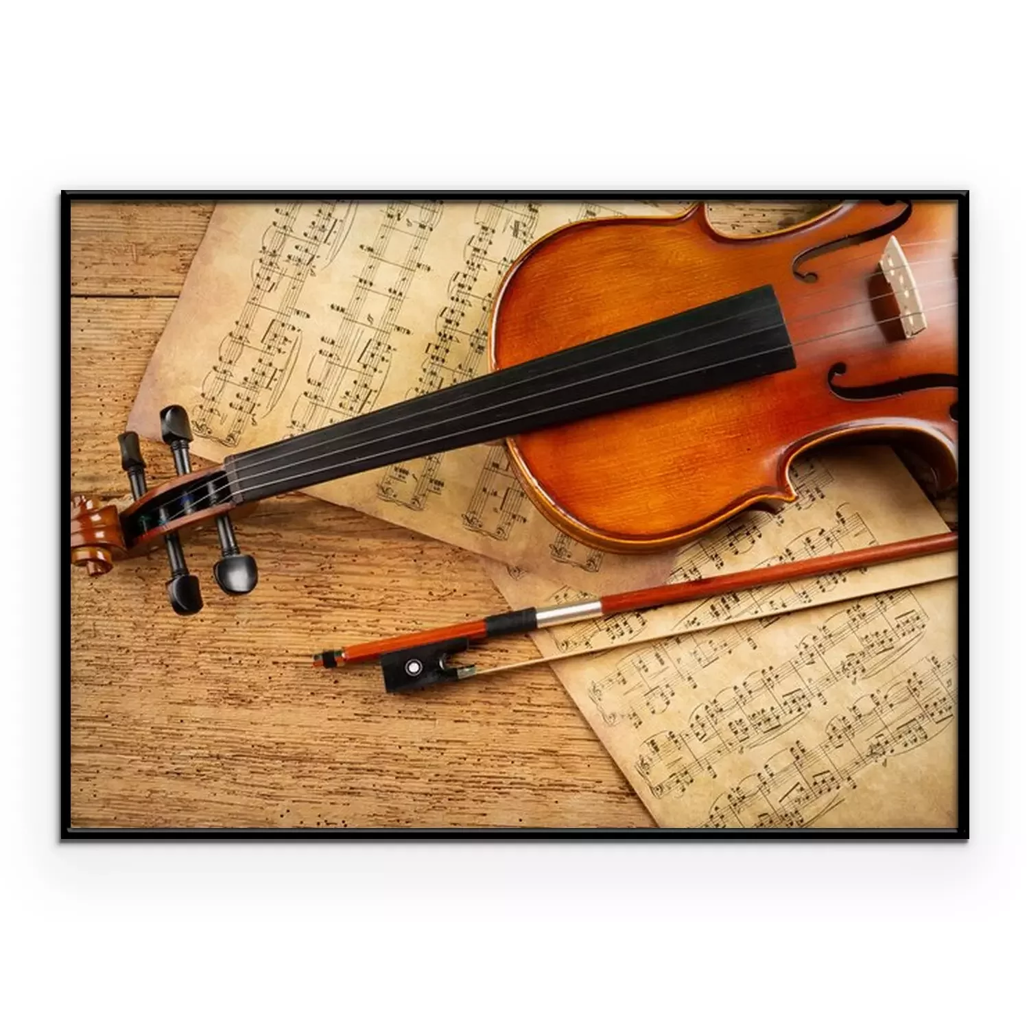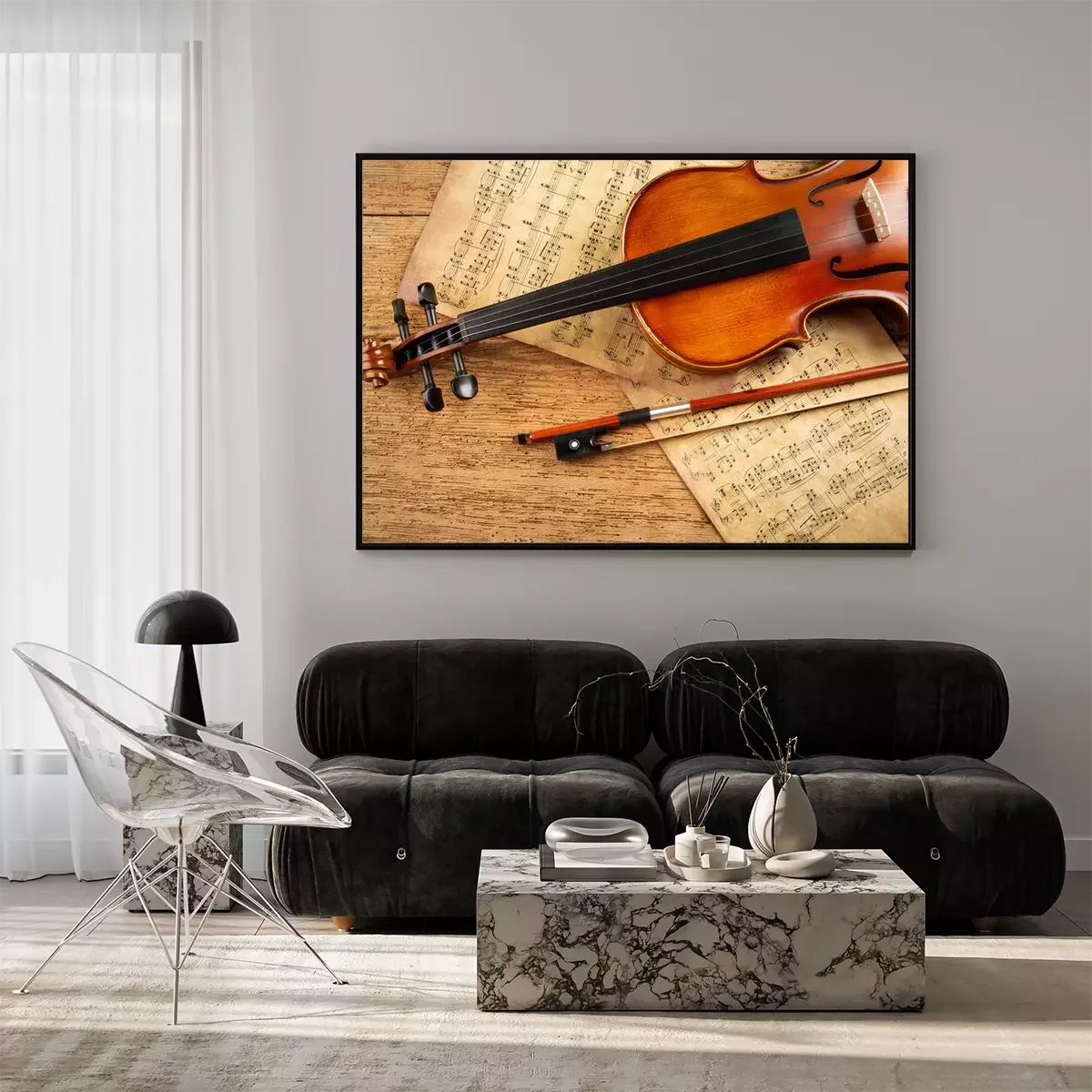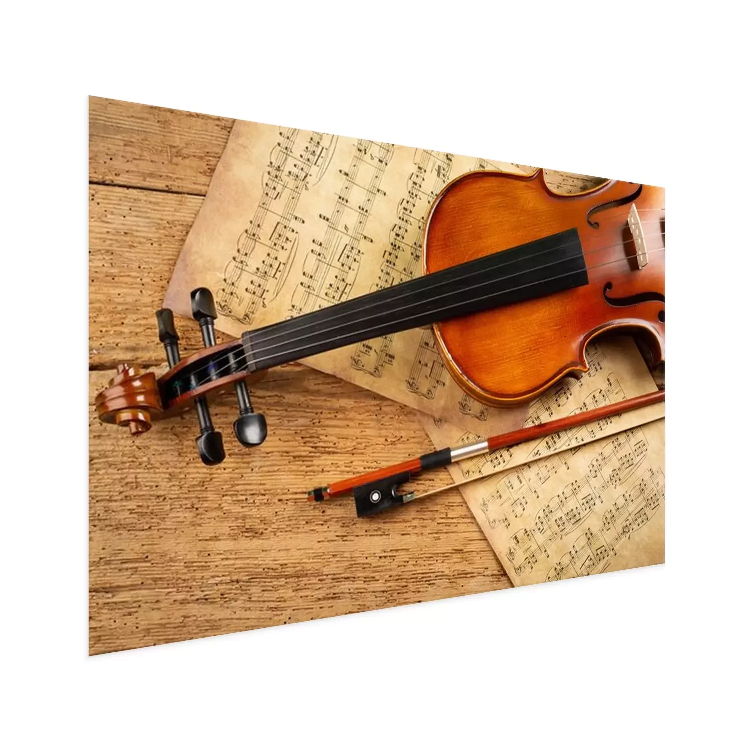 Poster : classic retro violin music string instrumt with old music note sheet paper old oak wood wooden background. classical musical romantic valentines day concept.