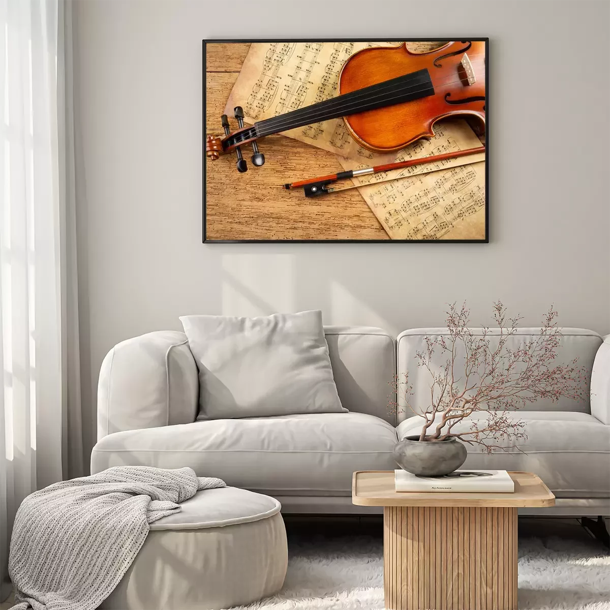 Poster  classic retro violin music string instrumt with old music note sheet paper old oak wood wooden background. classical musical romantic valentines day concept.
