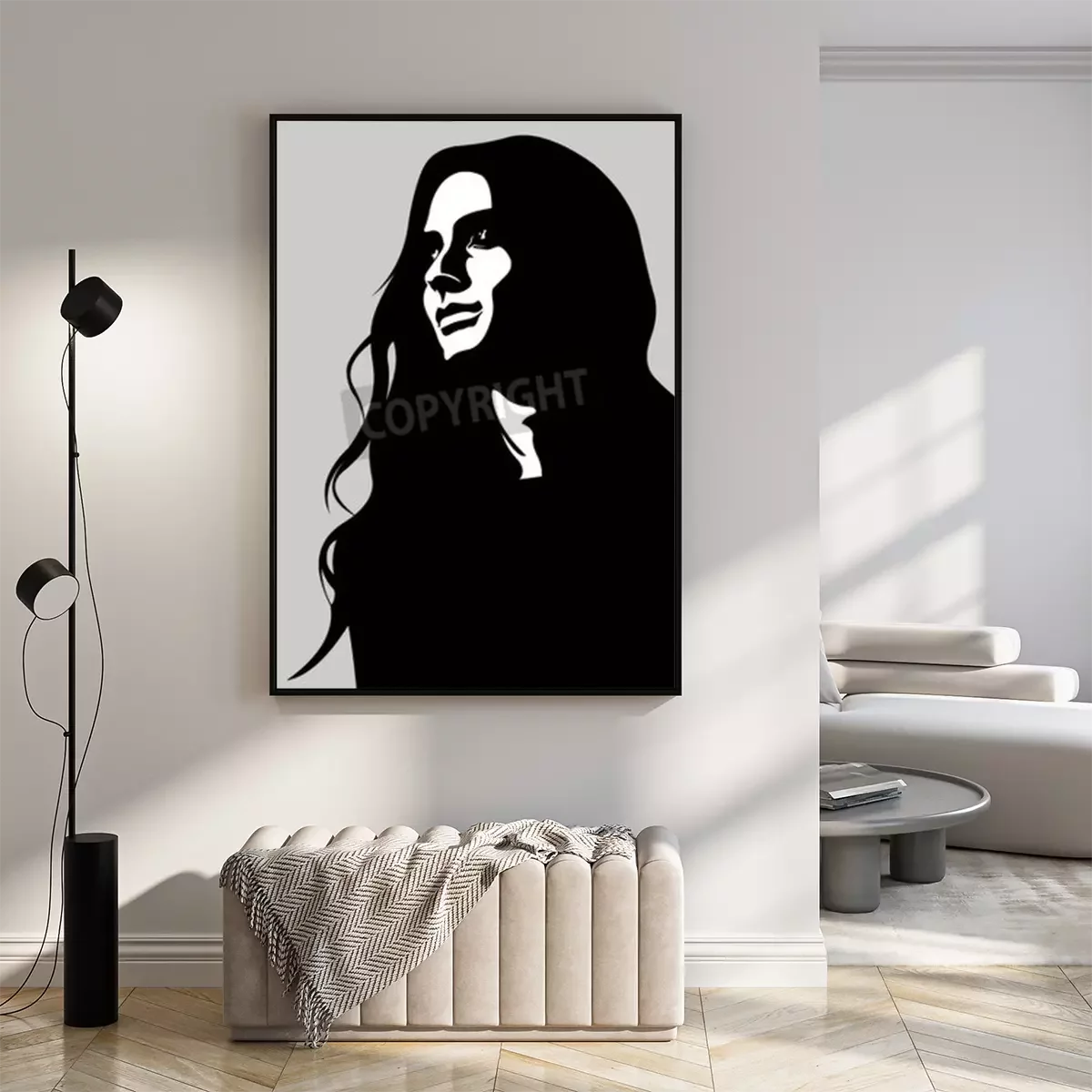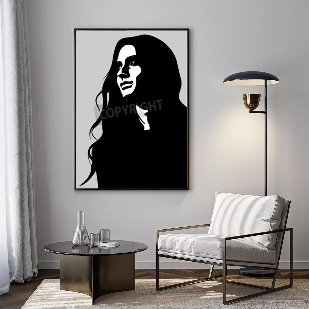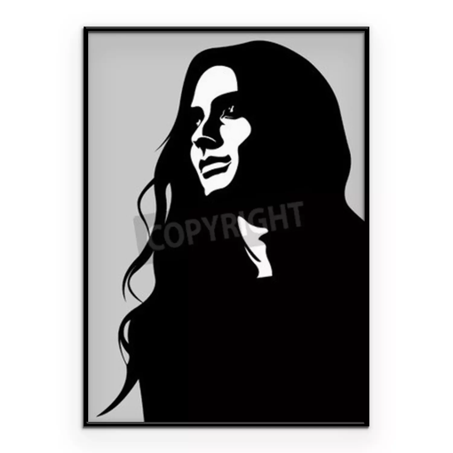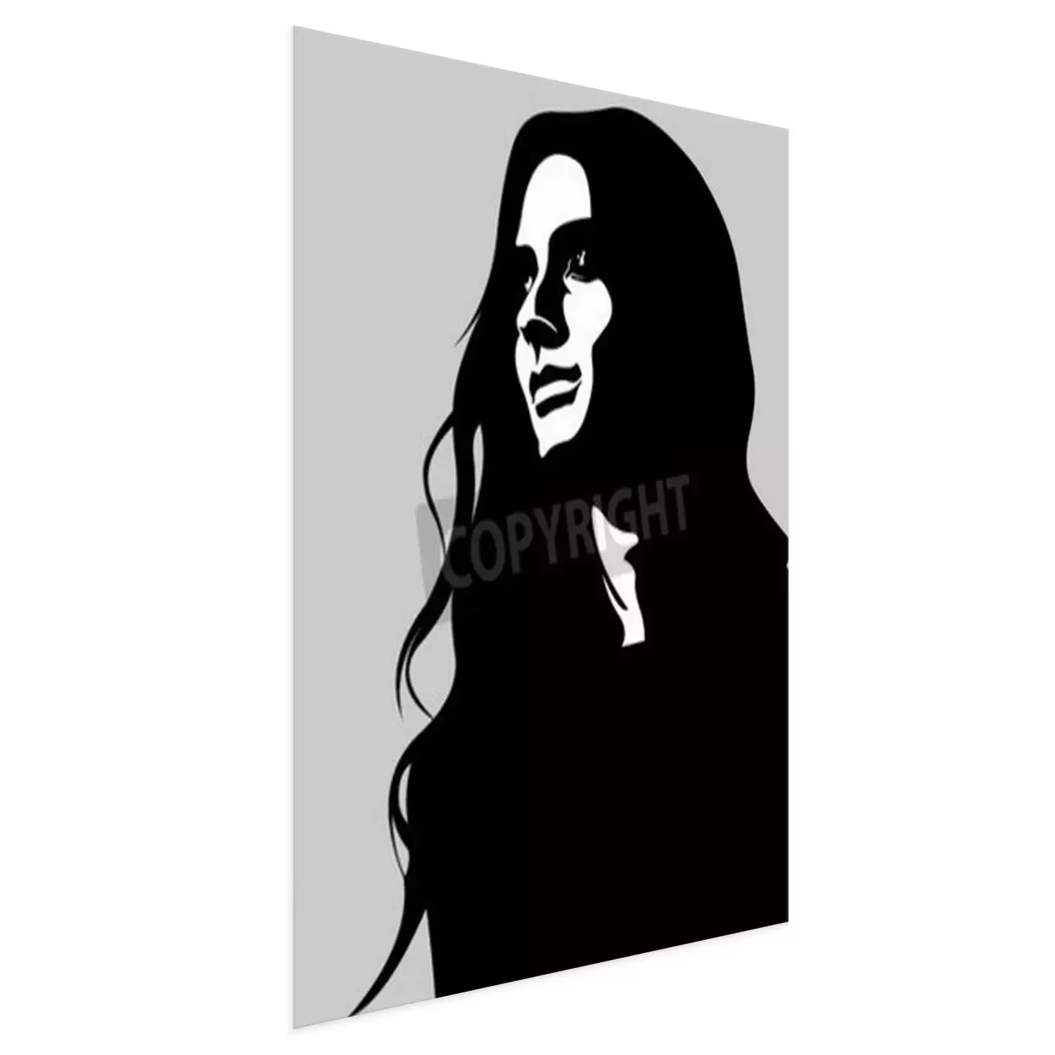 Poster  Clip art, bas, clef, portrait, pensif, long, cheveux, femme, regarder, haut. Facile editable illustration vectorielle en couches.