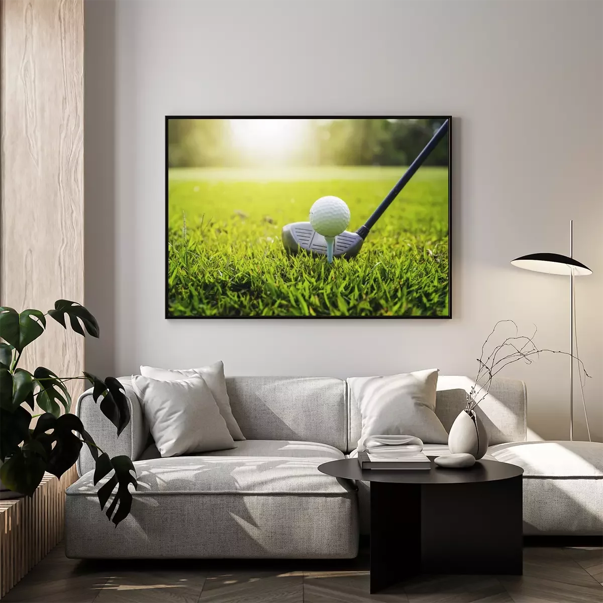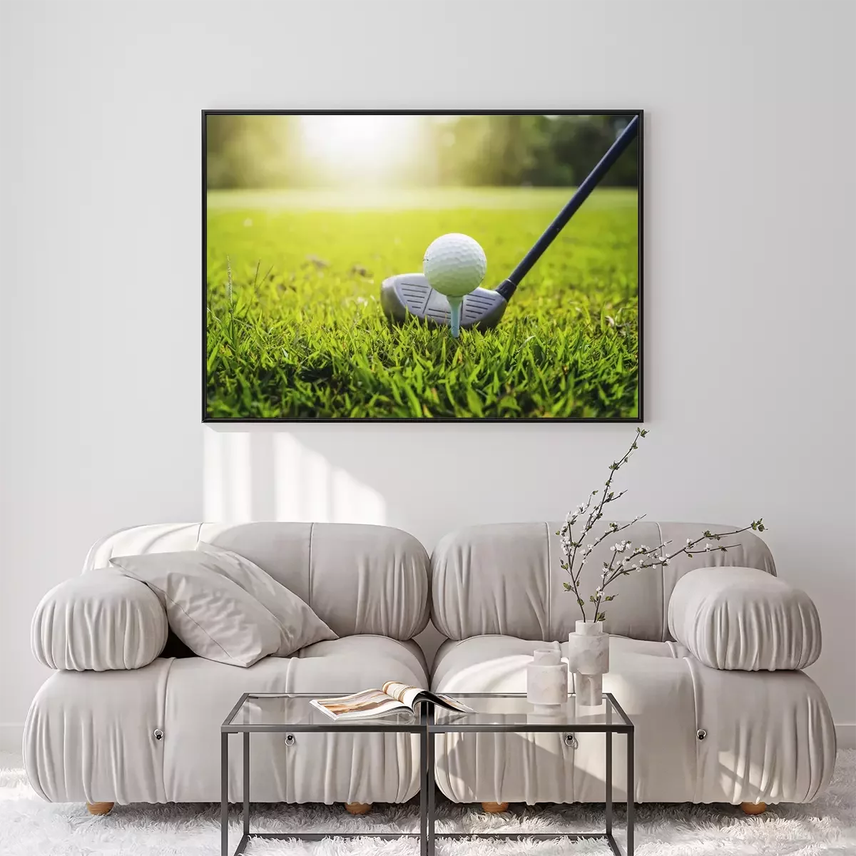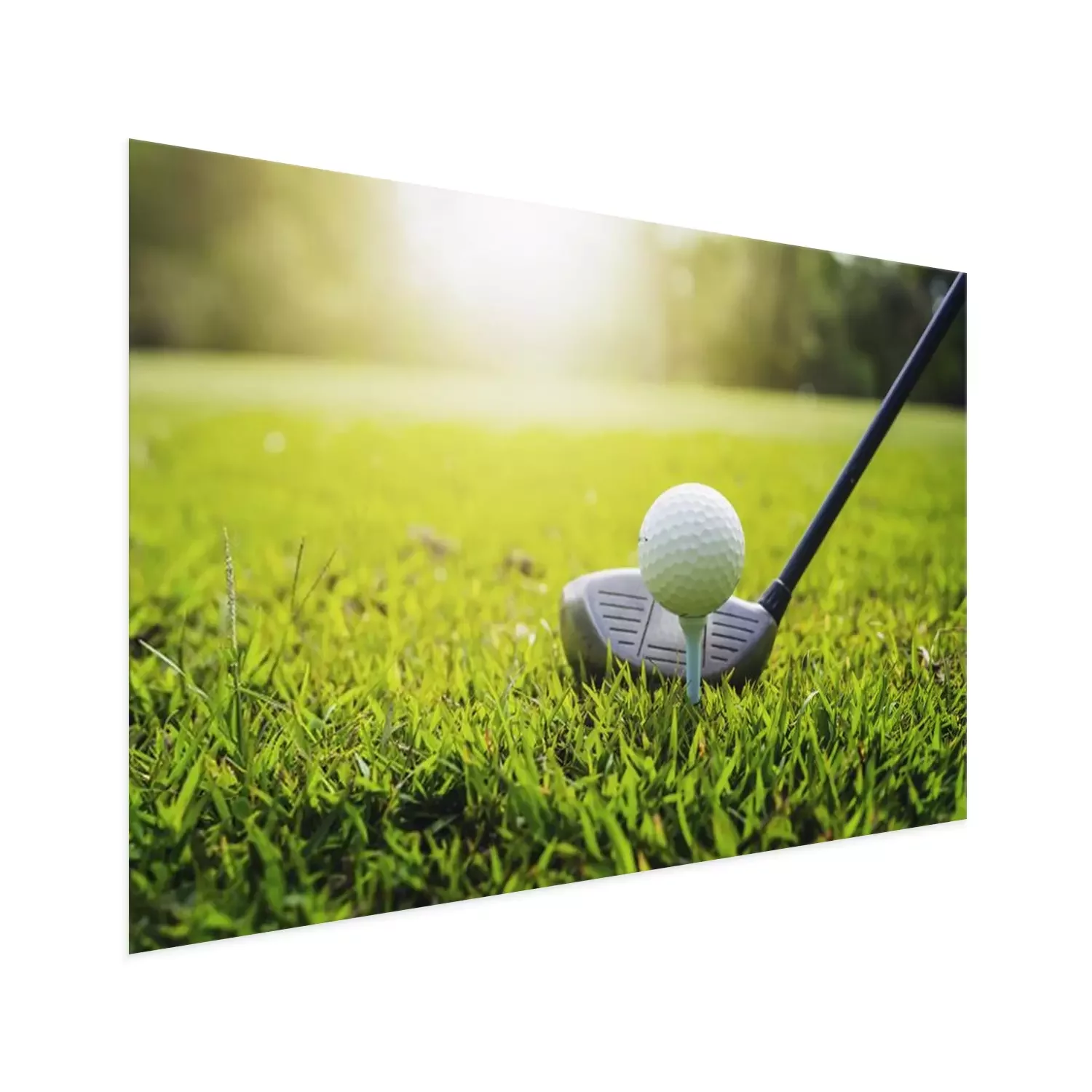 Poster : closeup golf club and golf ball on green grass wiht sunset