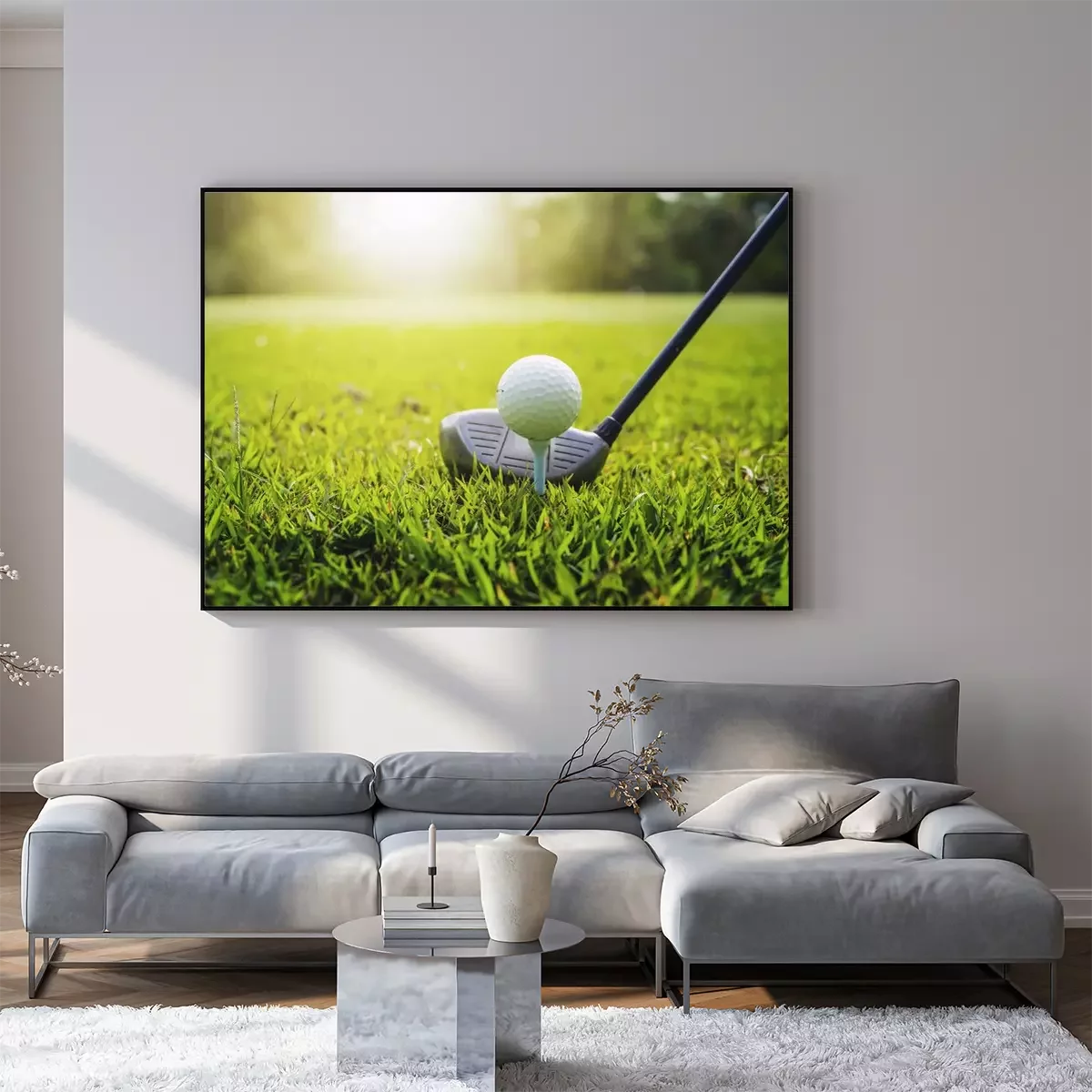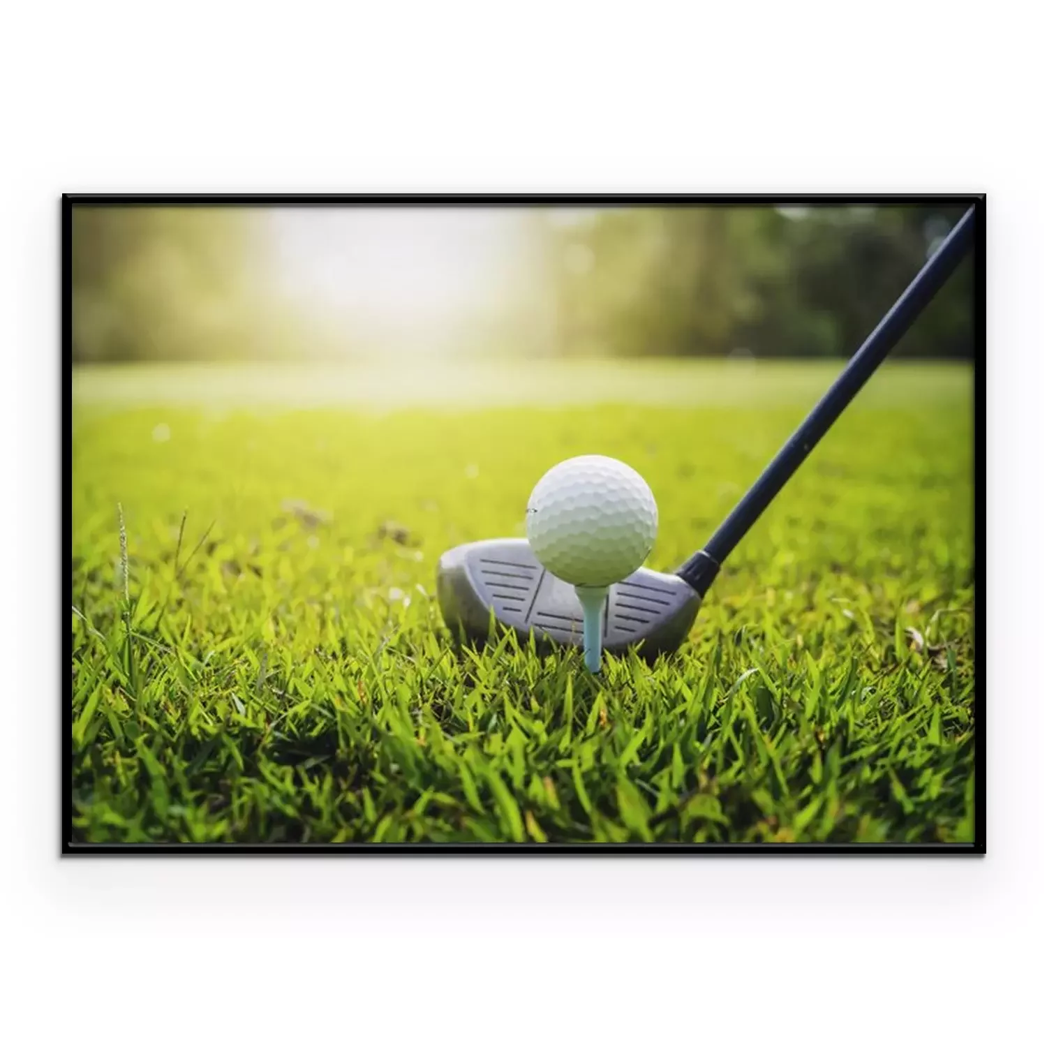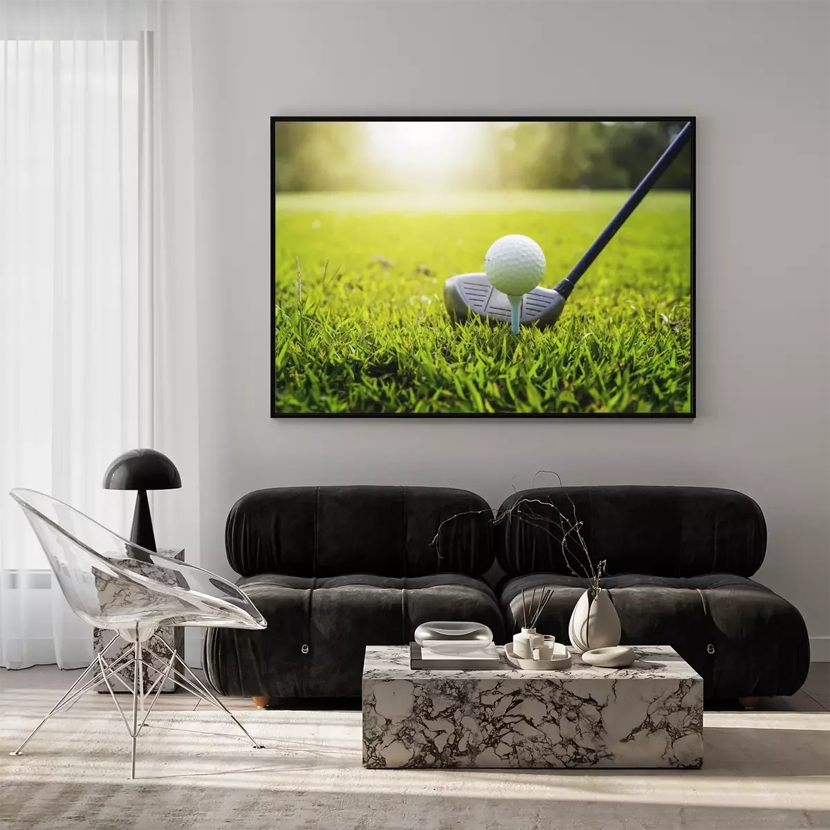 Poster : closeup golf club and golf ball on green grass wiht sunset