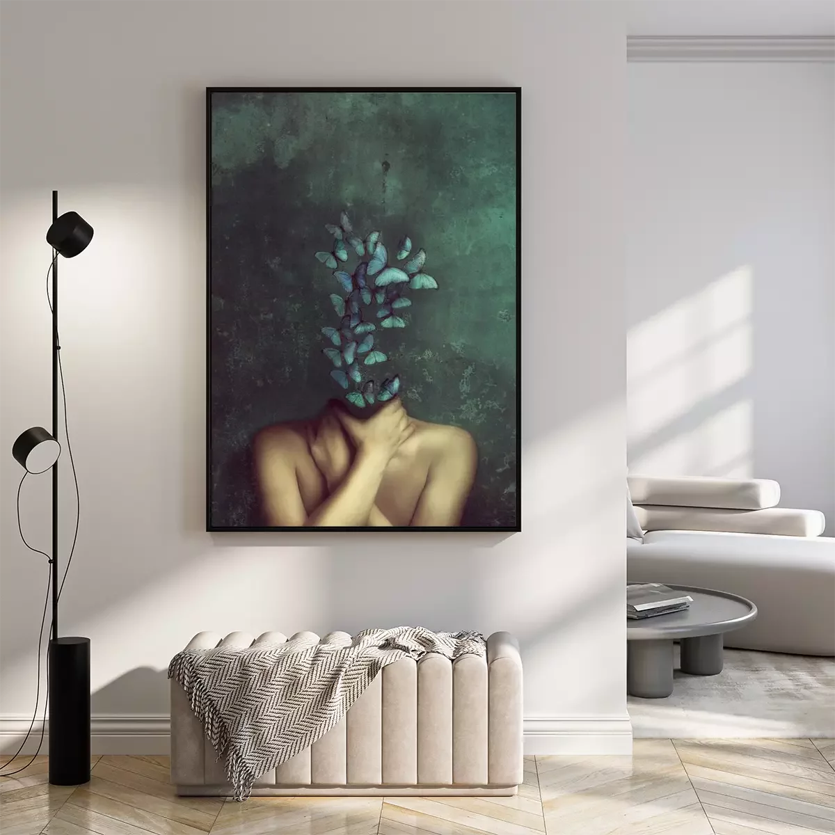 Conception artistique surréaliste d'une femme avec une tête de pivoine