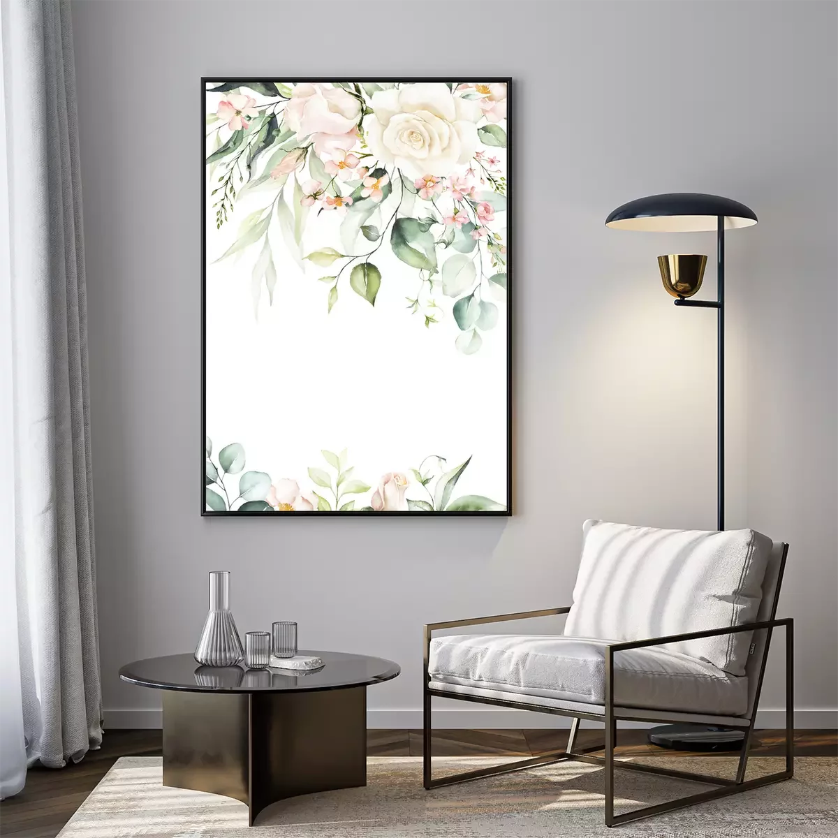 Seamless watercolor floral pattern - pink flowers, green leaves & branches on white background; for wrappers, wallpapers, postcards, greeting cards, wedding invitations, romantic events.