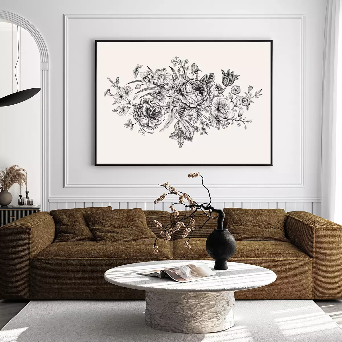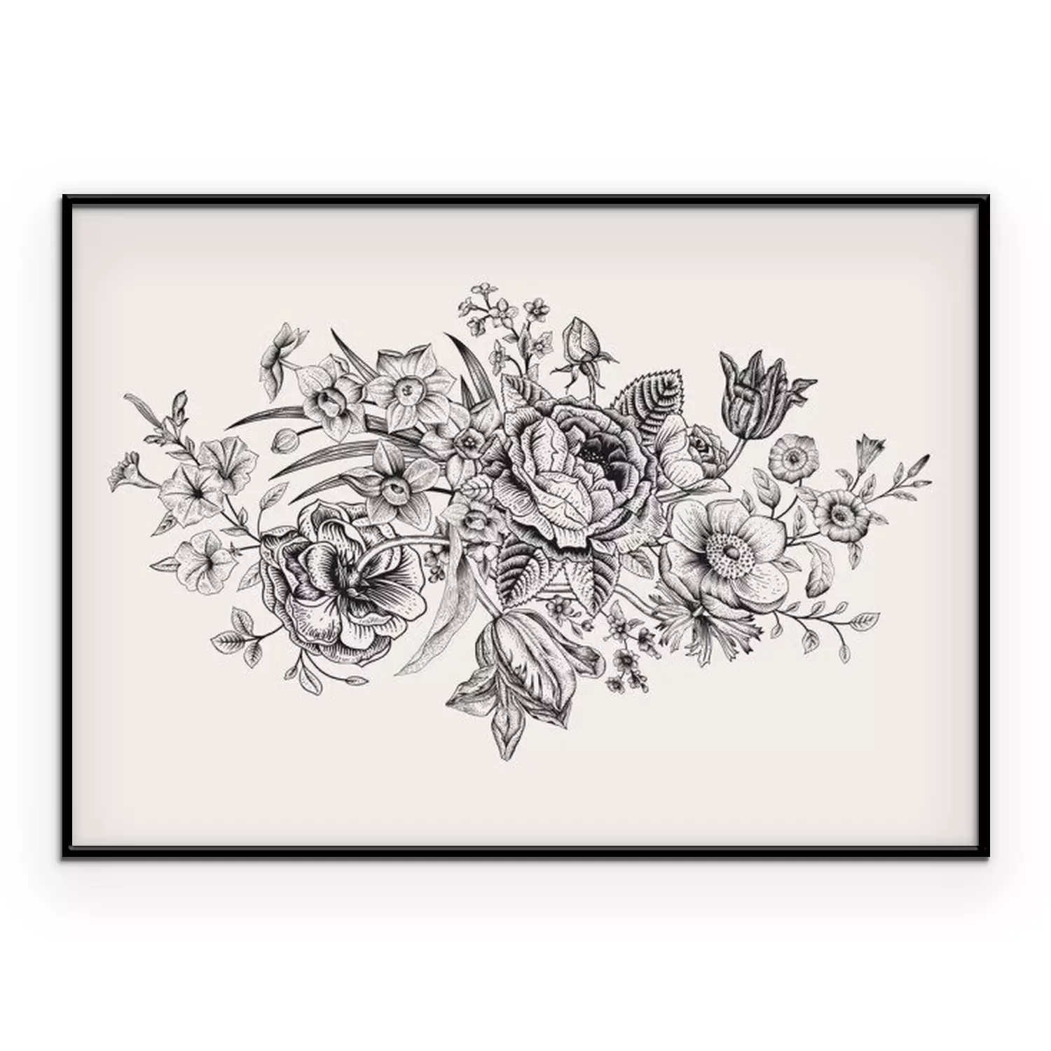 Poster : Composition de tulipes et de fleurs en noir et blanc
