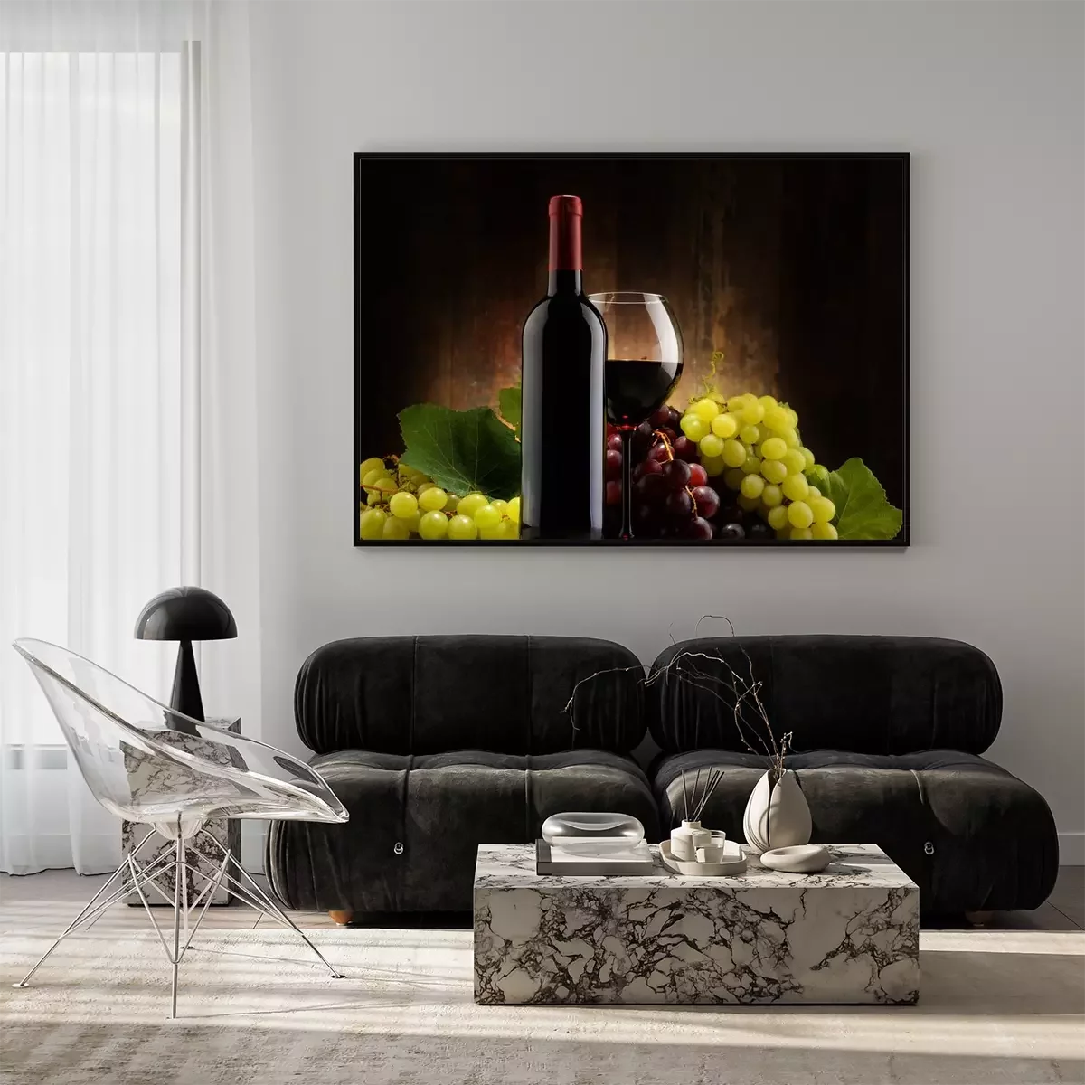 Poster  Composition de verre, bouteille de vin rouge et de raisins frais