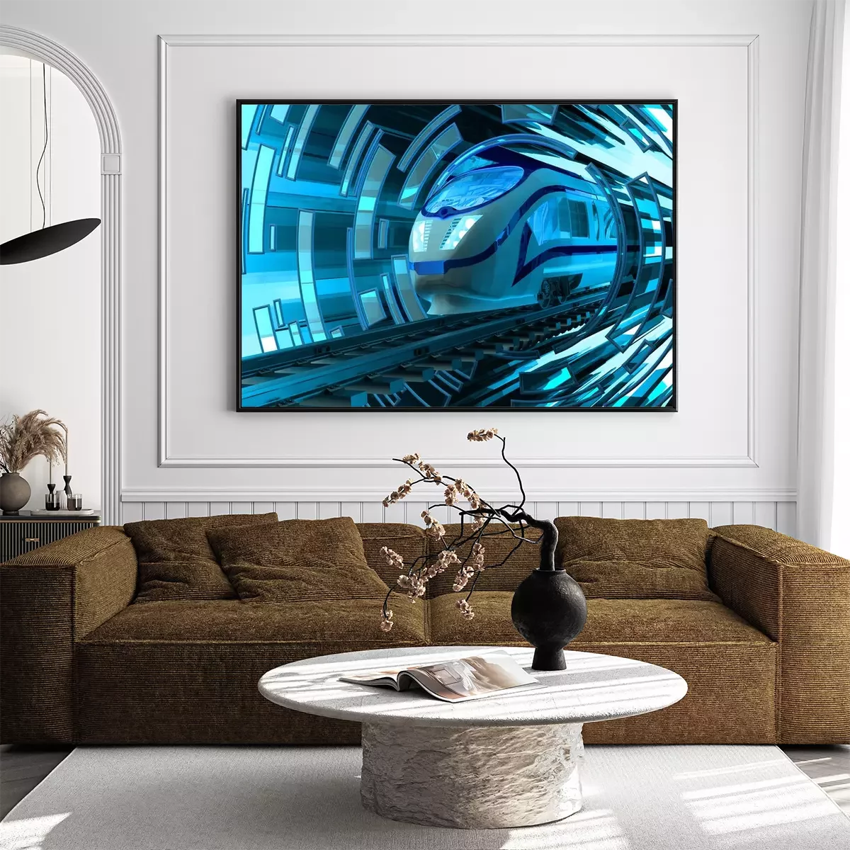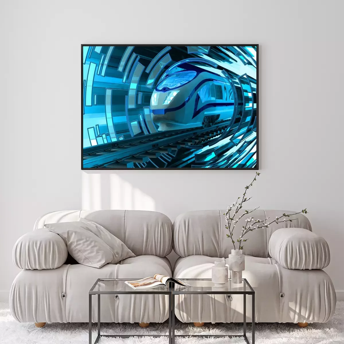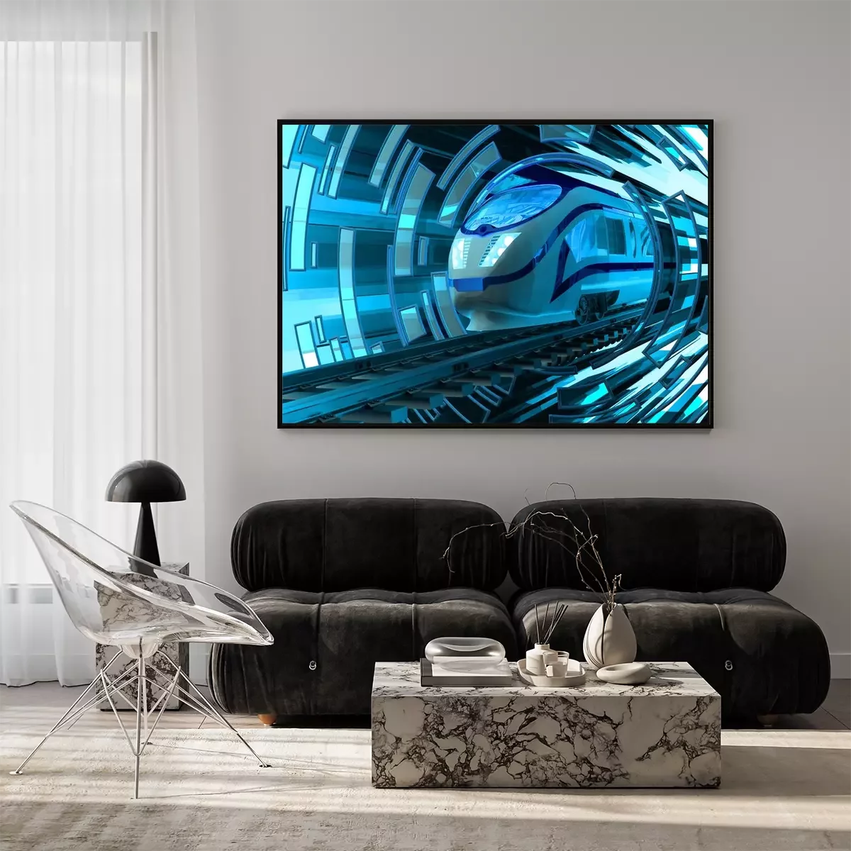 Poster  Concept de transport ferroviaire, mouvement rapide d'un train moderne de passagers à grande vitesse sur les voies ferrées sur fond abstrait bleu circulaire