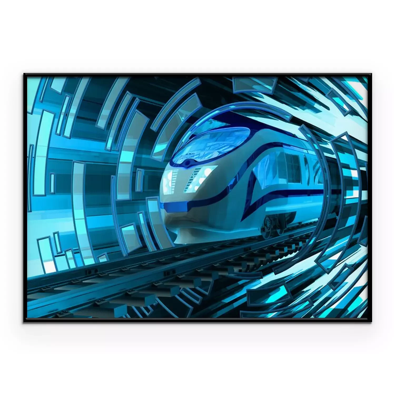 Poster : Concept de transport ferroviaire, mouvement rapide d'un train moderne de passagers à grande vitesse sur les voies ferrées sur fond abstrait bleu circulaire