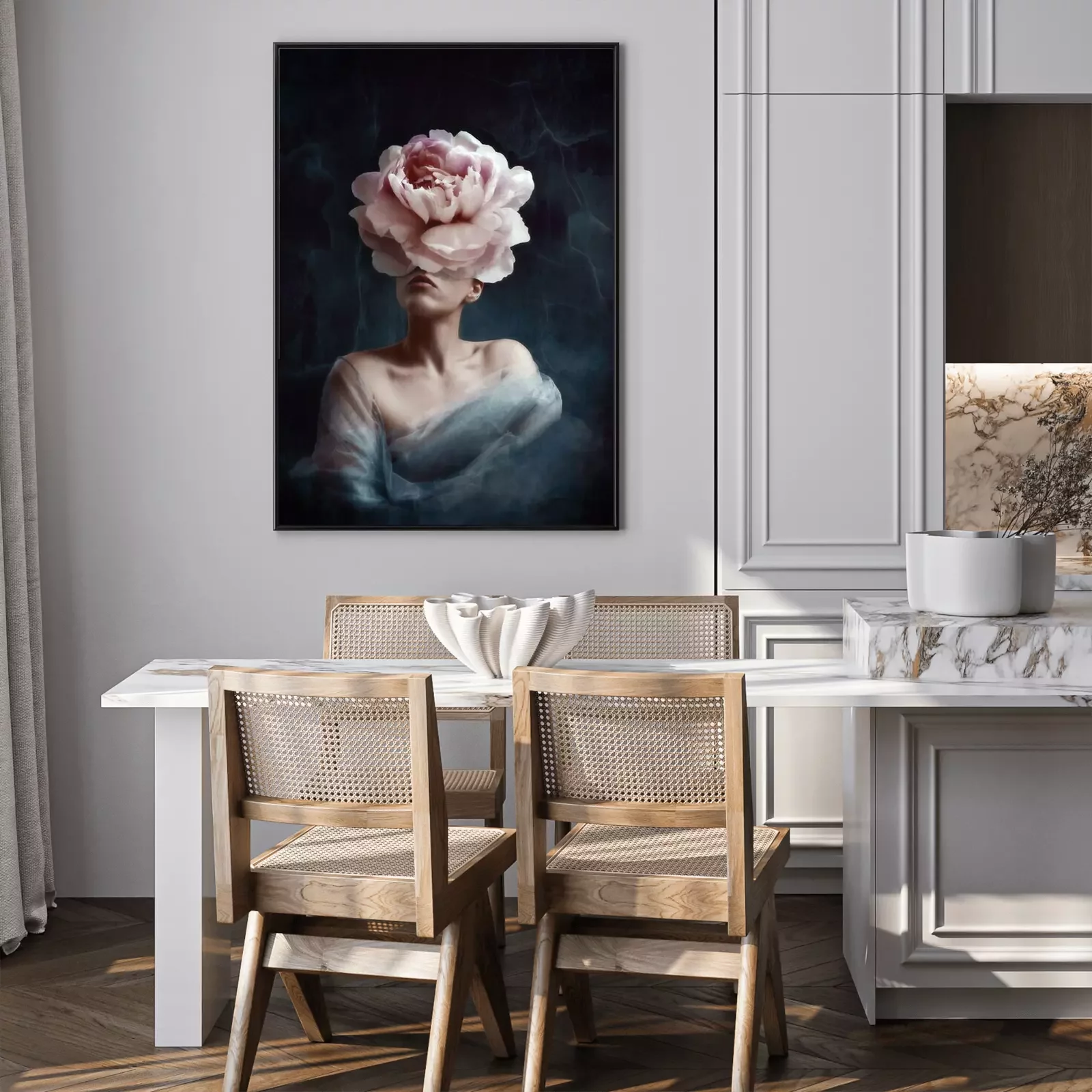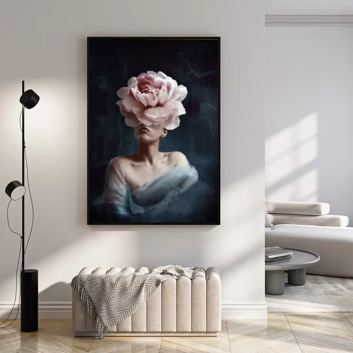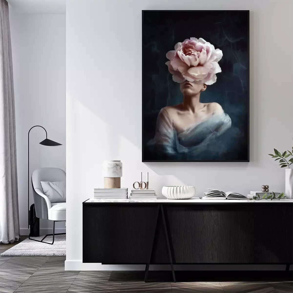 Poster  Conception artistique surréaliste d'une femme avec une tête de pivoine