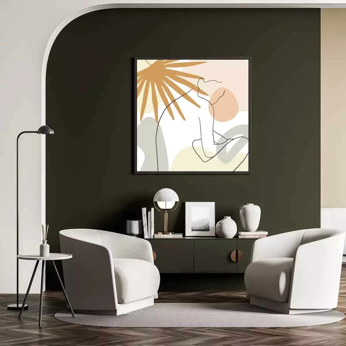 Un portrait minimaliste d'une femme avec des éléments abstraits