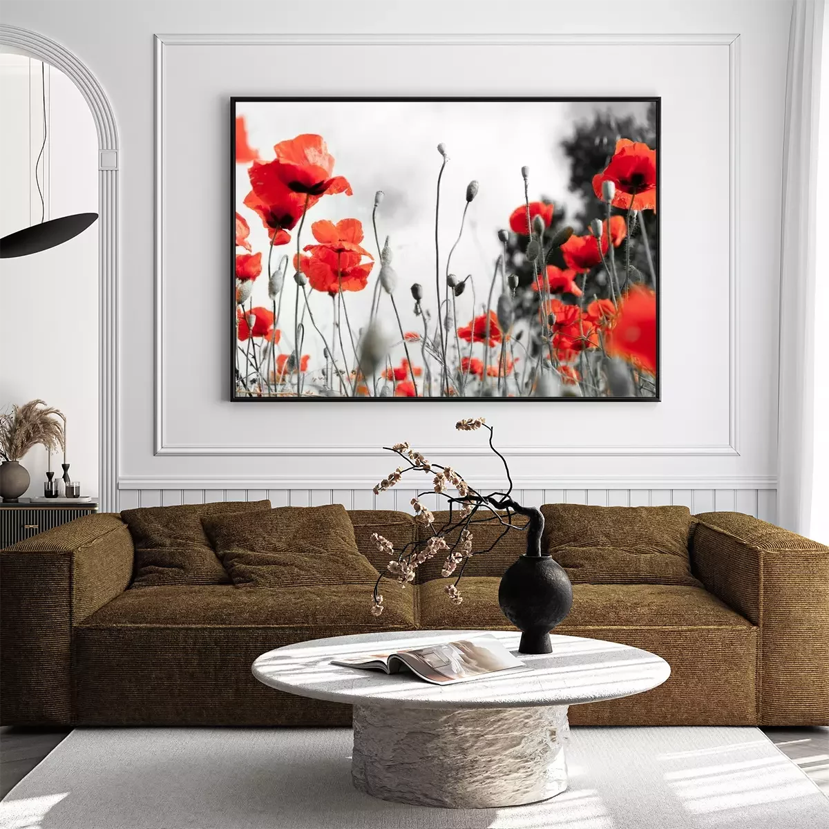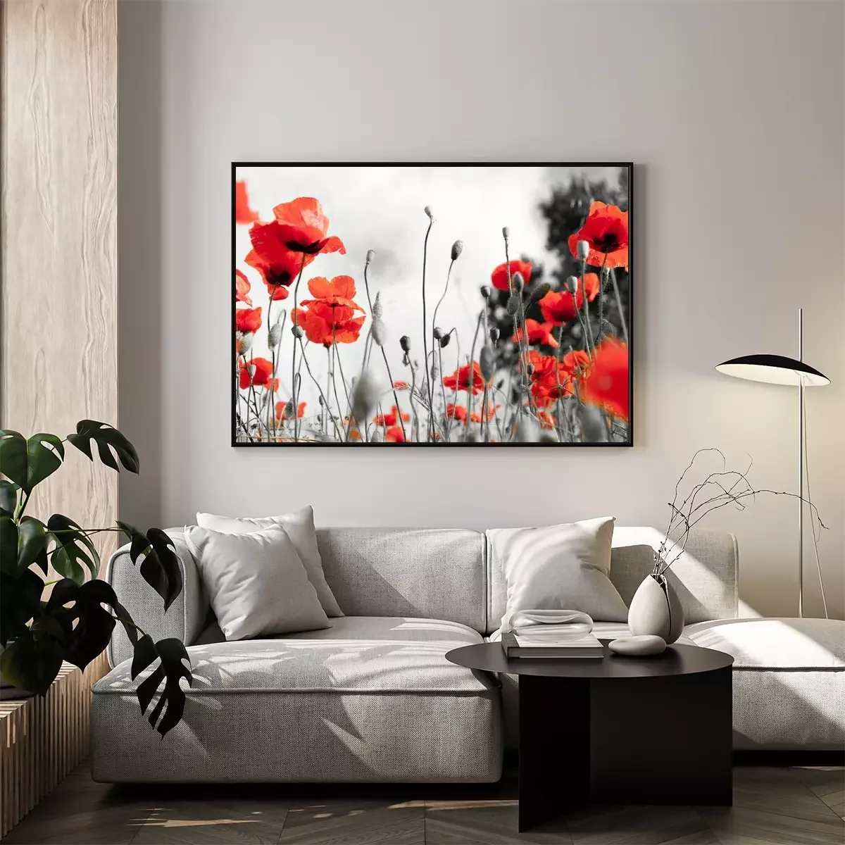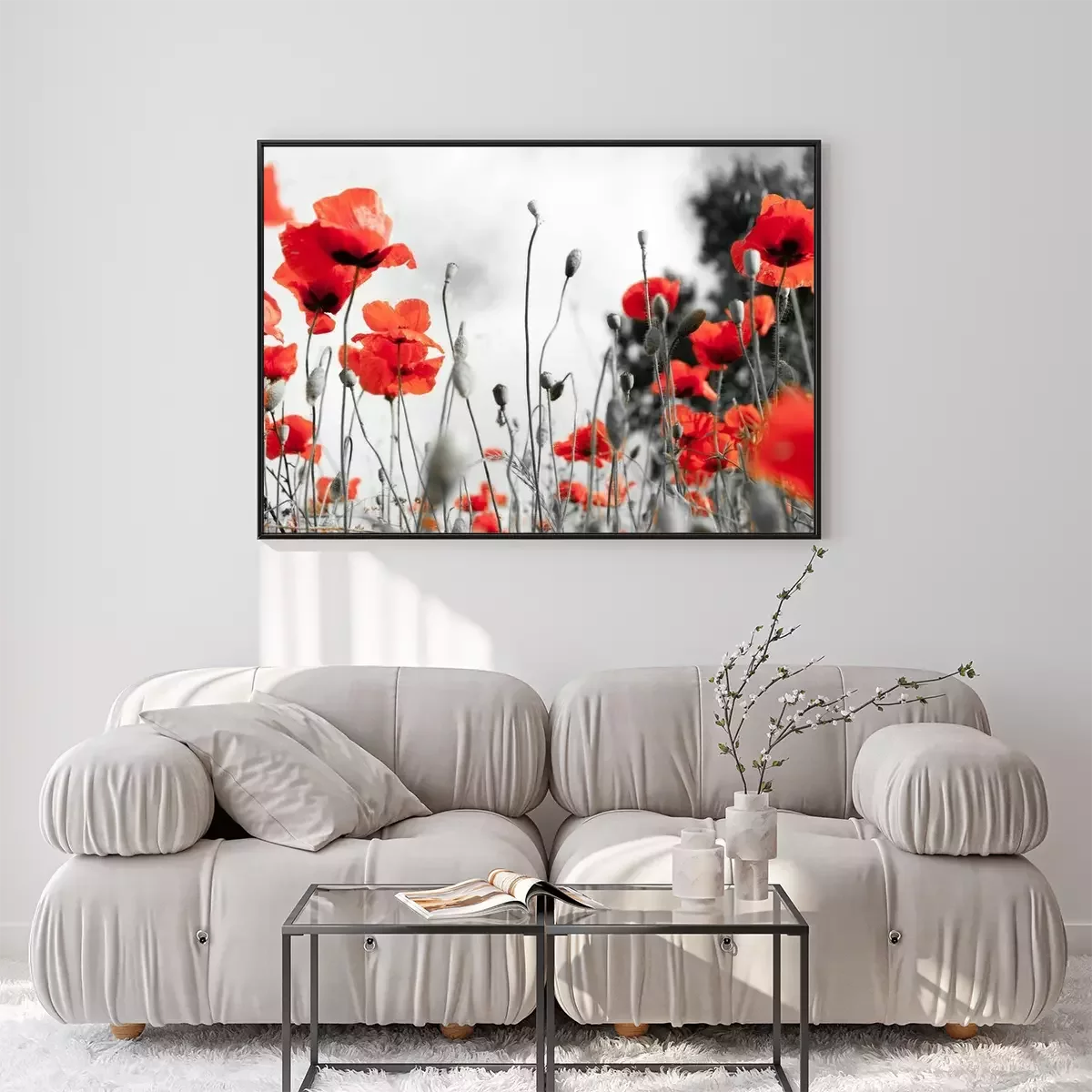 Poster : Coquelicots rouges sur le fond d'un pré noir et blanc