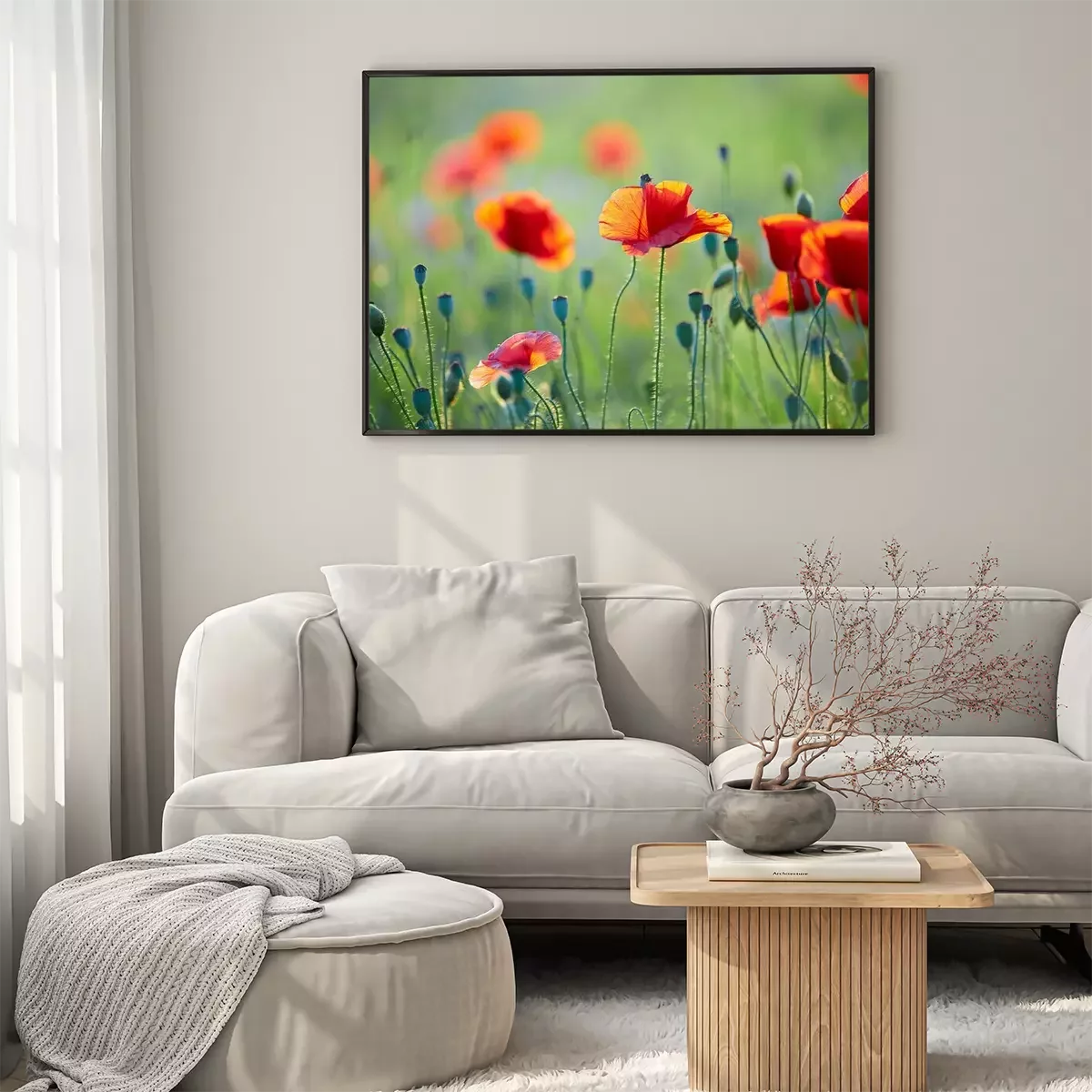 Poster  Coquelicots sauvages au soleil sur fond flou