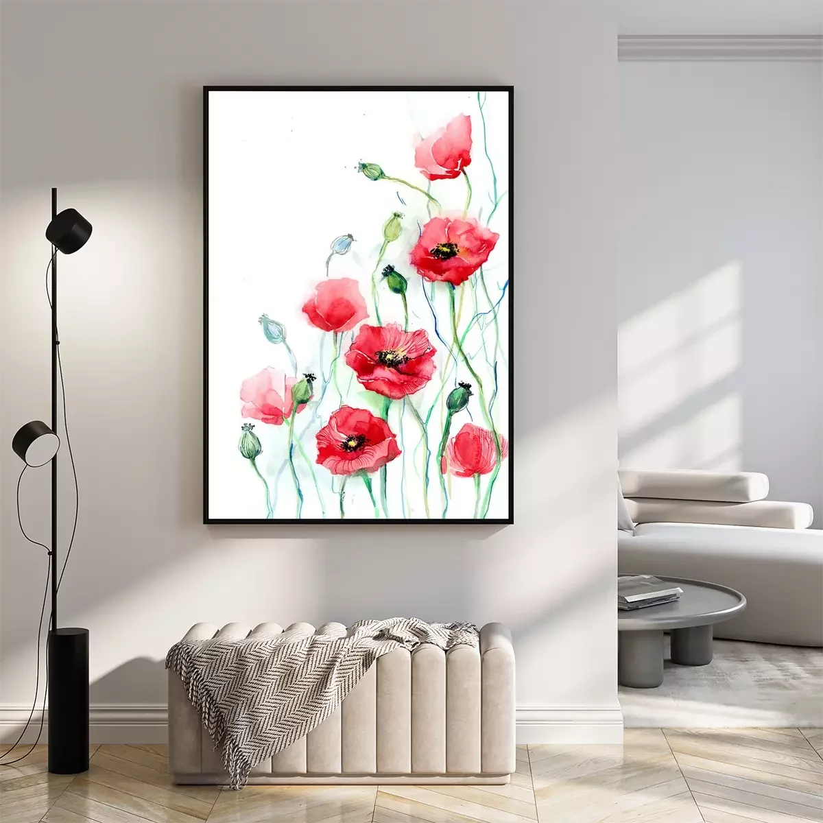 Poster  Coquelicots sur fond blanc avec des tiges bleues