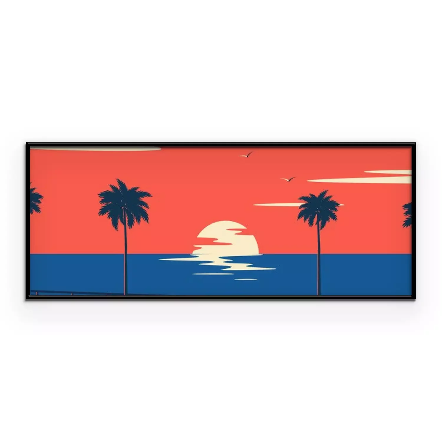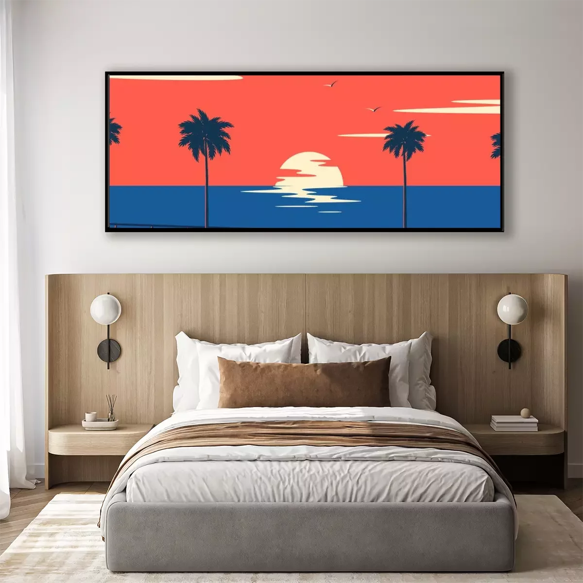 Sunset on tropical beach with palm tree. Sun over evening sea.