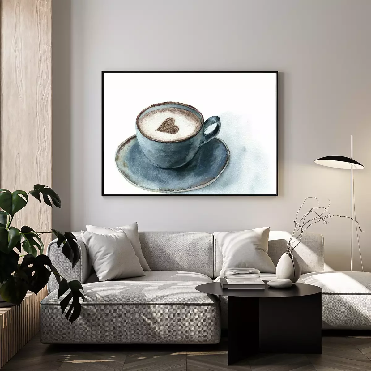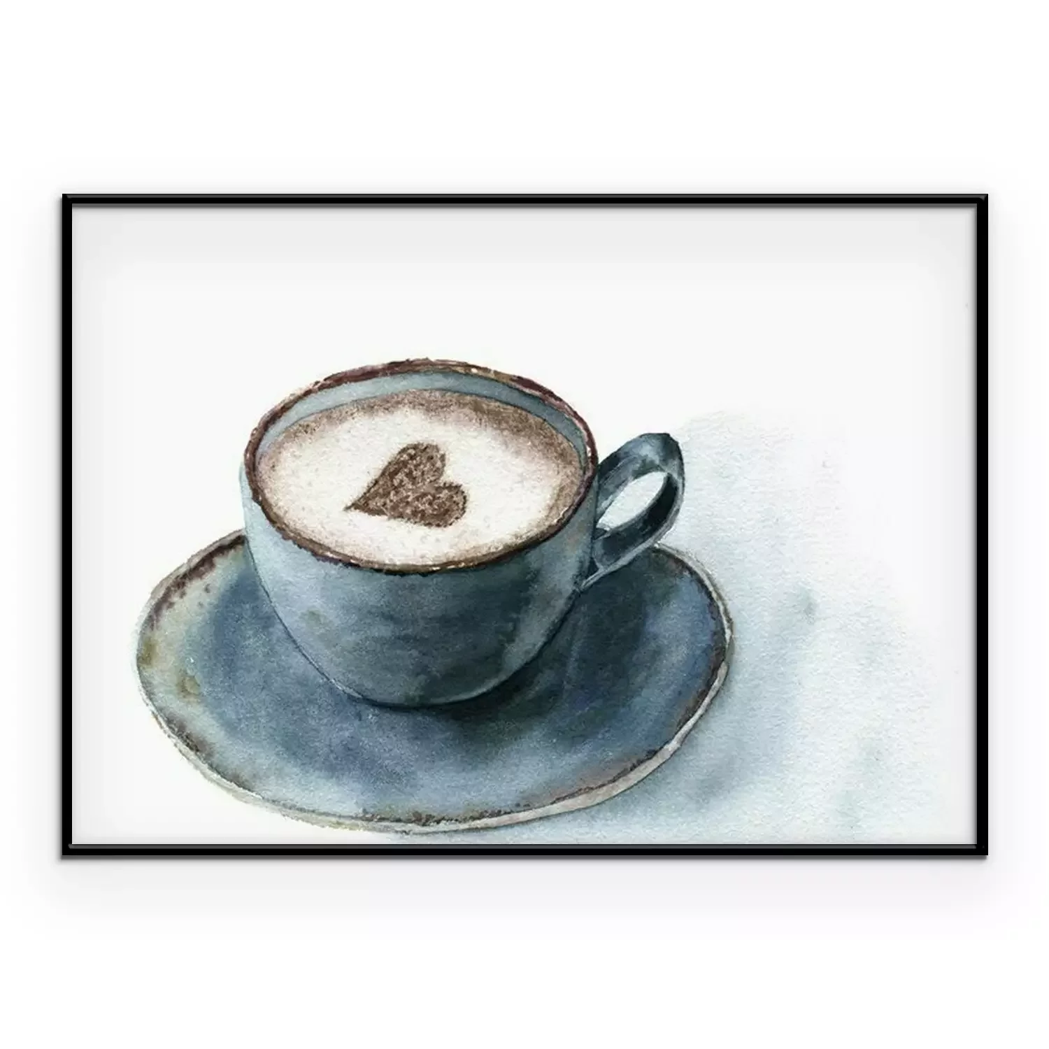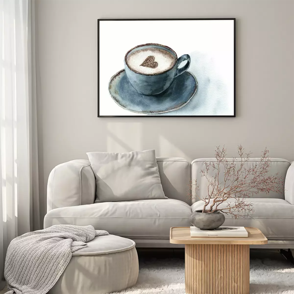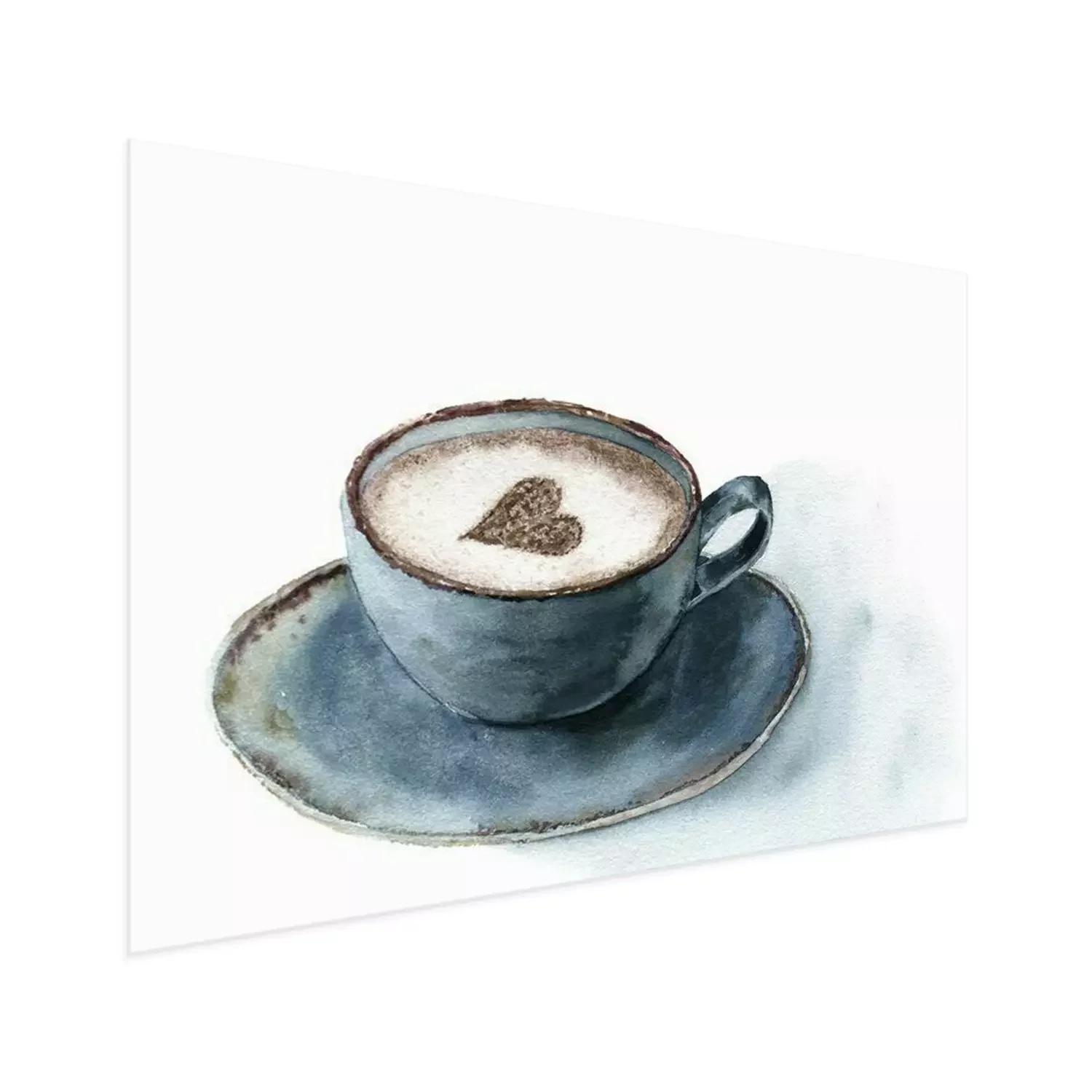 Poster  Coupe d'aquarelle de cappuccino avec le décor de coeur de cannelle. Illustration de nourriture avec la tasse bleue de café sur le fond blanc. Impression peinte à la main pour la conception ou l'impres