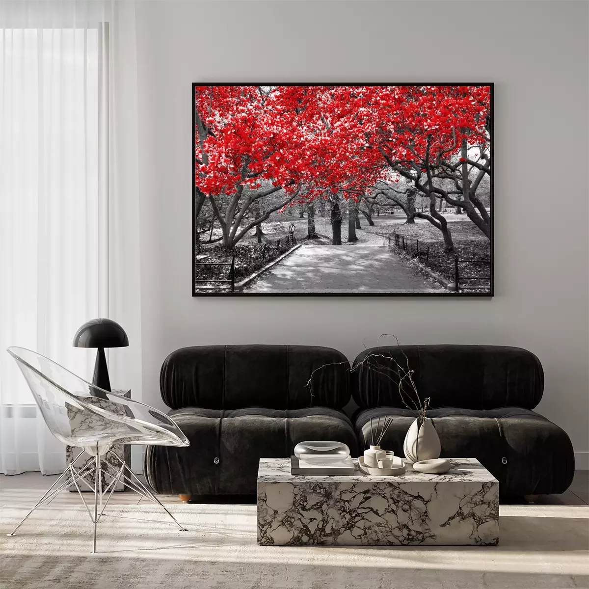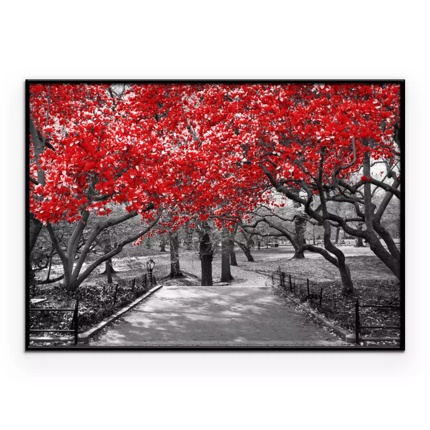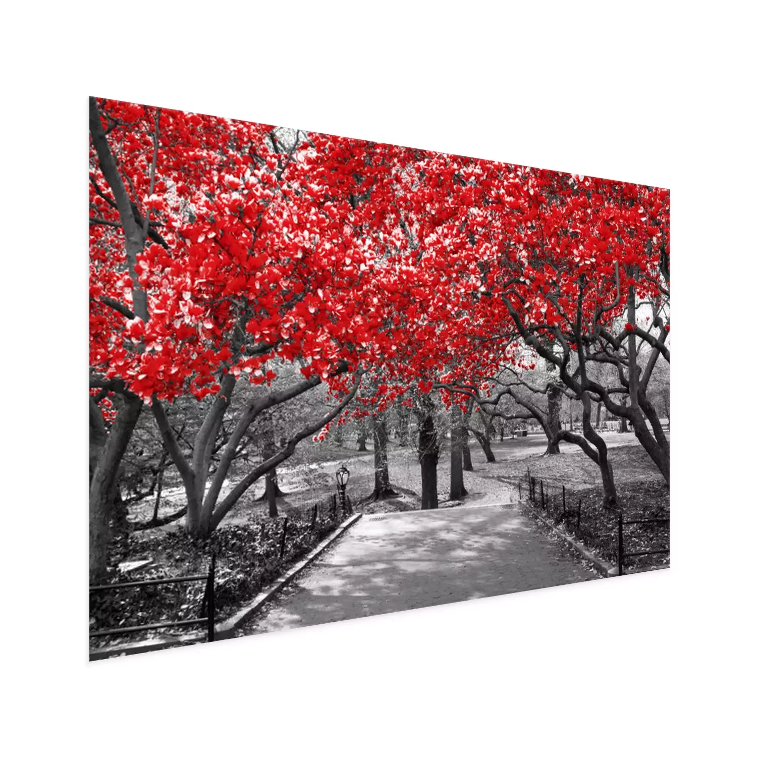 Poster : Couronnes d'arbres rouges sur fond noir et blanc